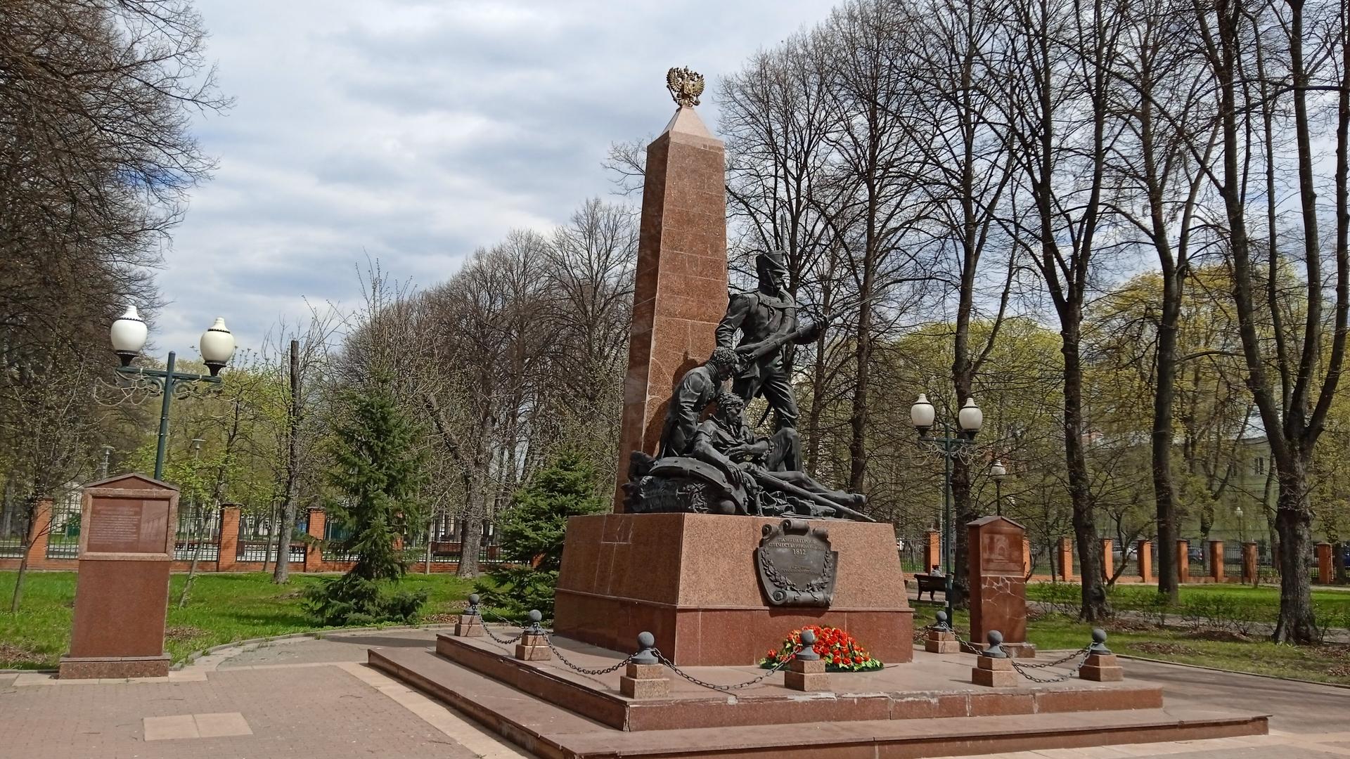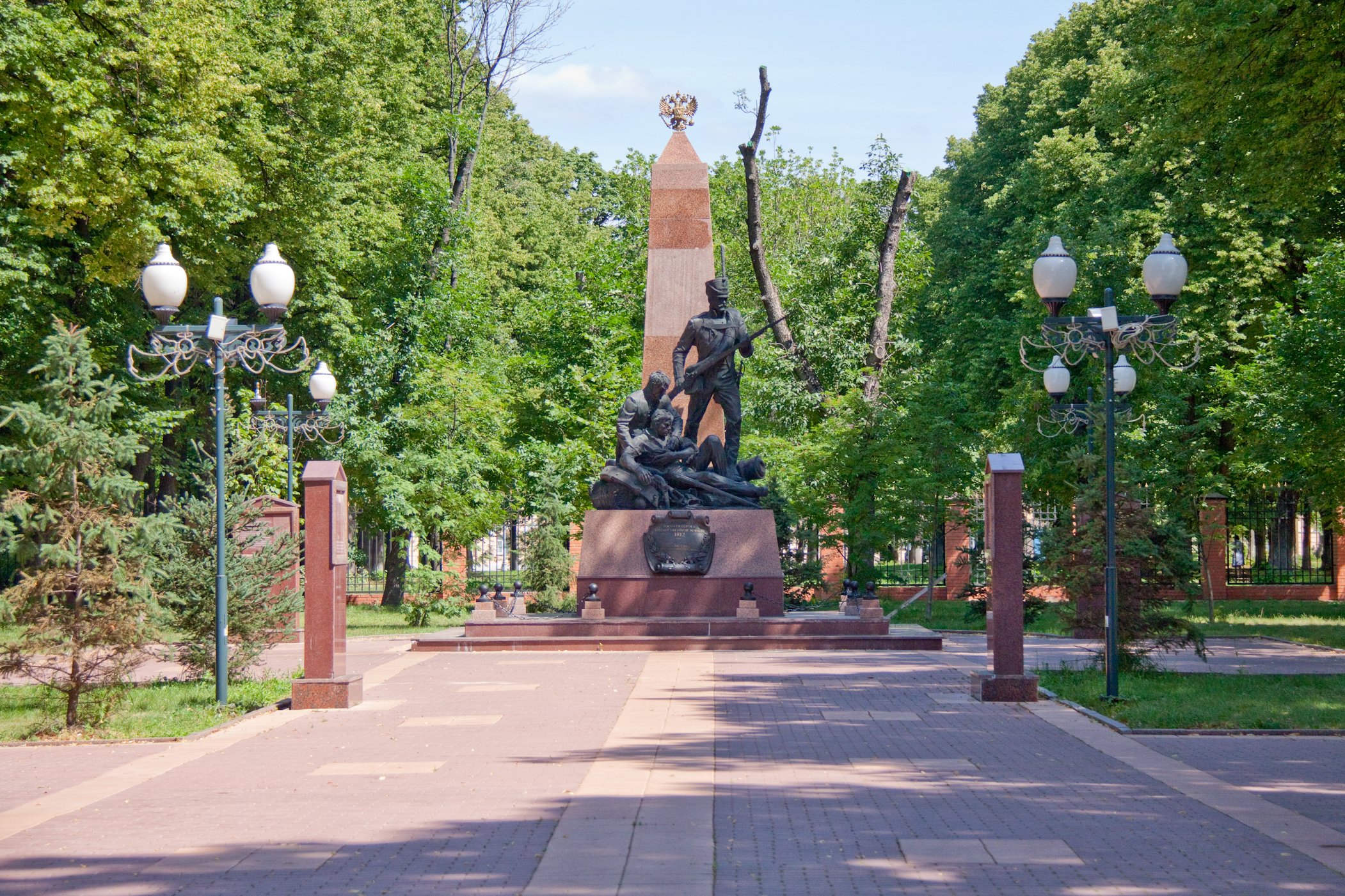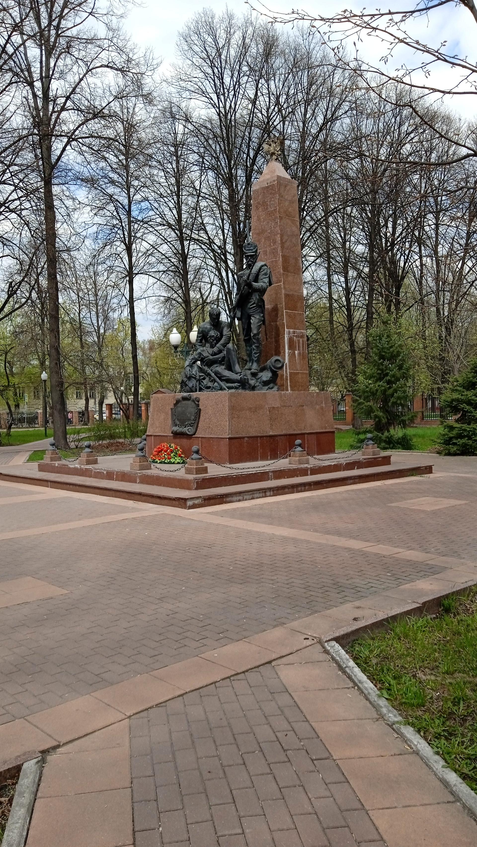 Мемориал находится в центральной части сквера — трехфигурная композиция воспроизводит фрагмент боевого редута: идущие в атаку воины и военный медик, оказывающий помощь раненому солдату.