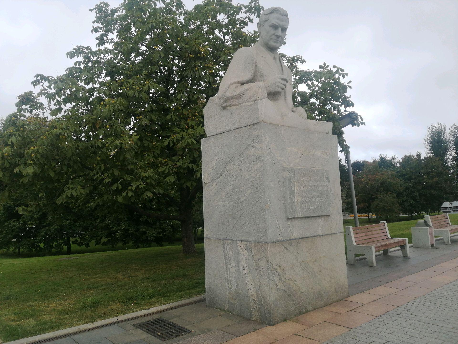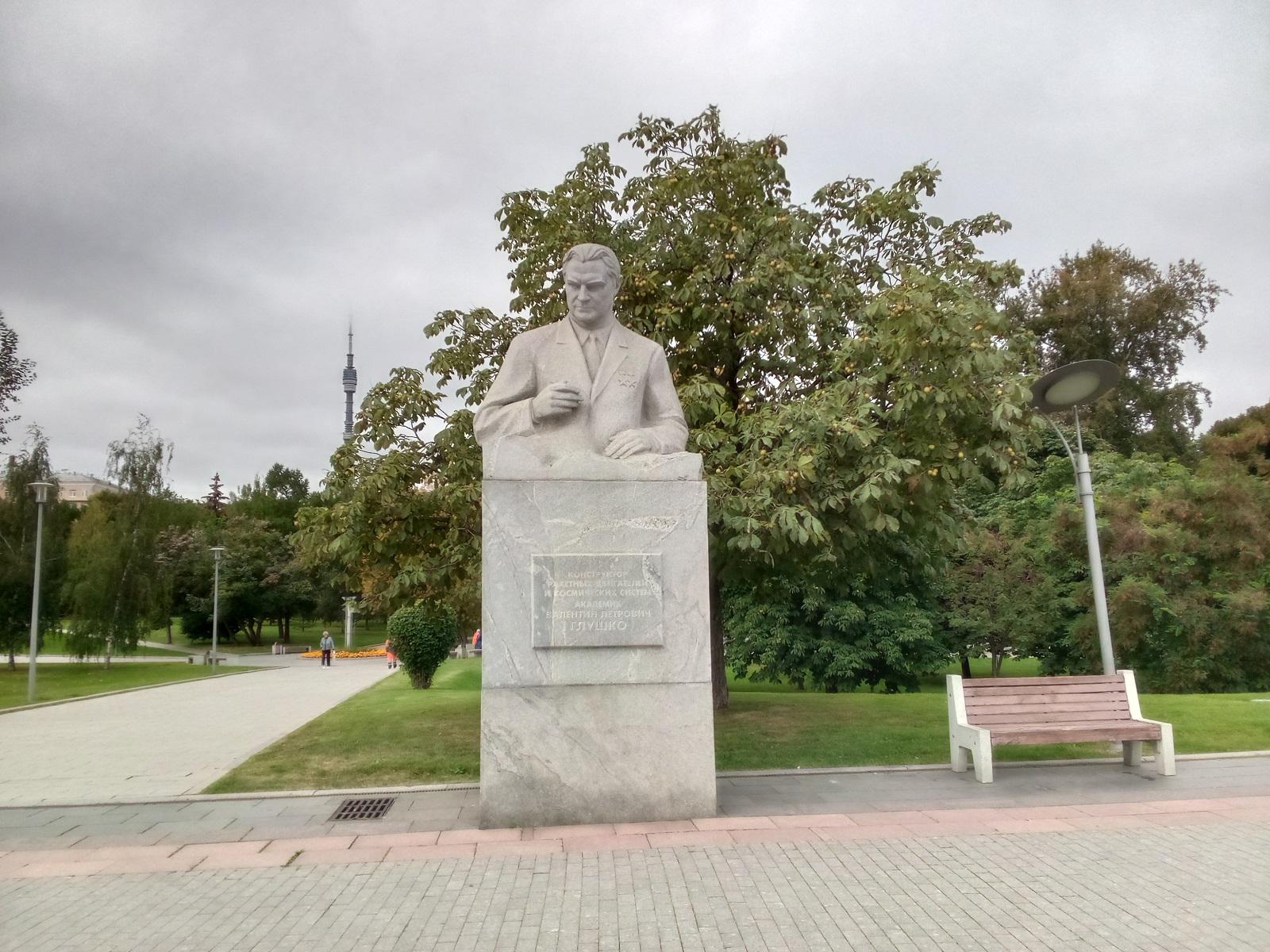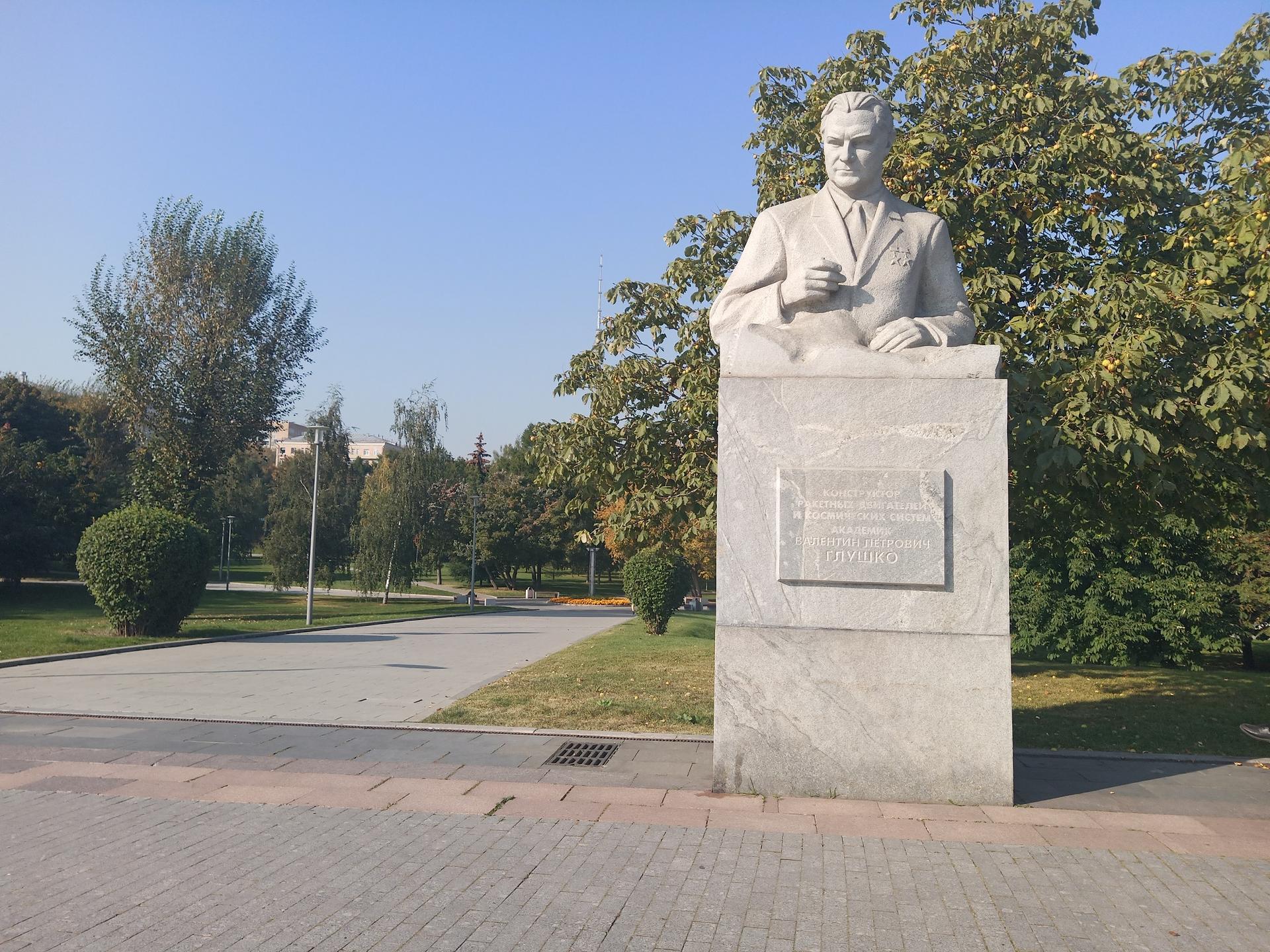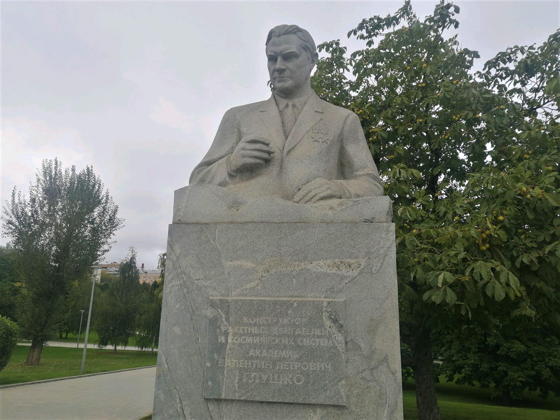 Бюст В. П. Глушко выполнен с портретным сходством. Ученый одет в строгий пиджак, рубашку с галстуком. Памятная надпись на постаменте: «Конструктор ракетных двигателей и космических систем академик Валентин Петрович Глушко».
