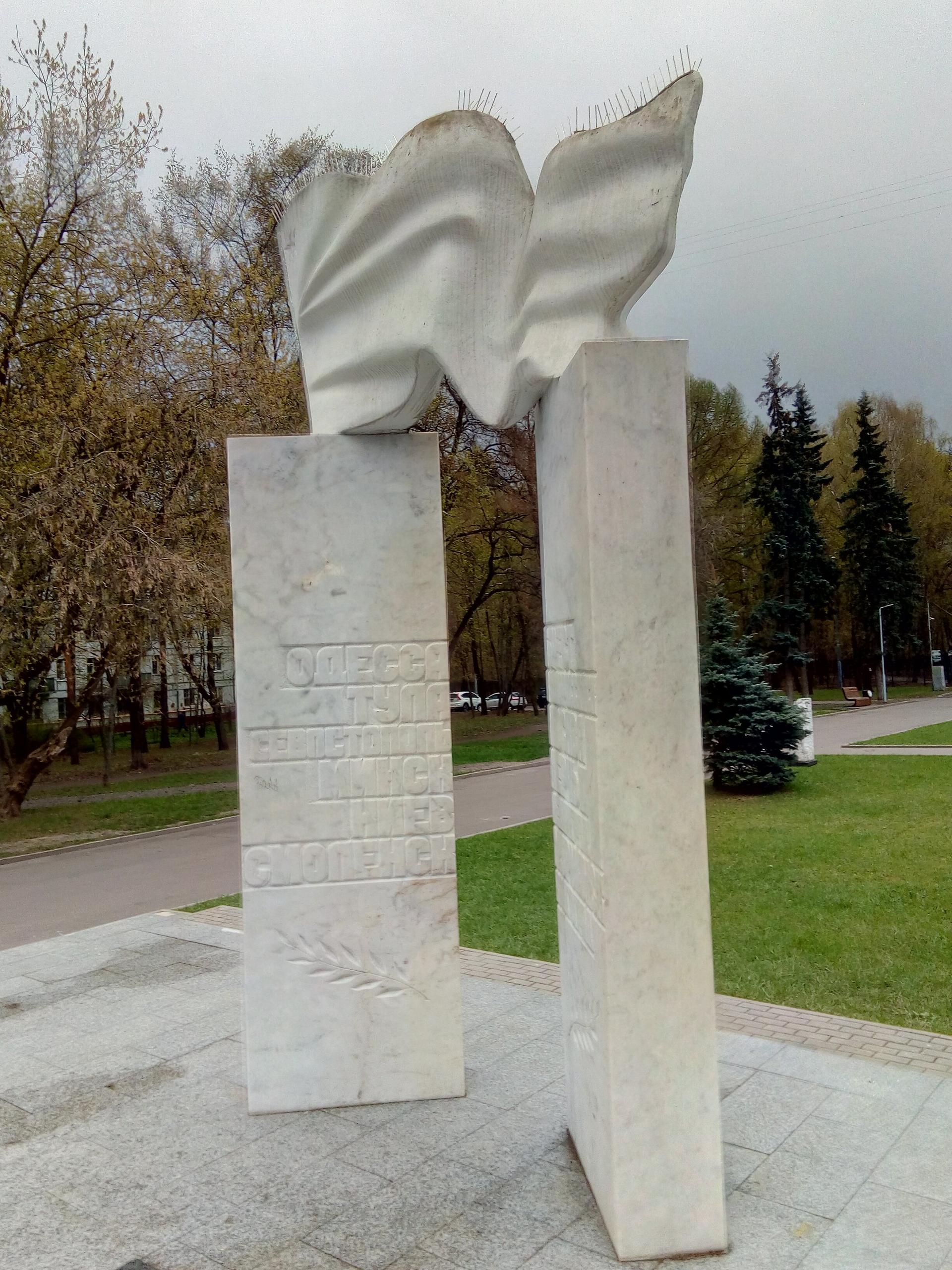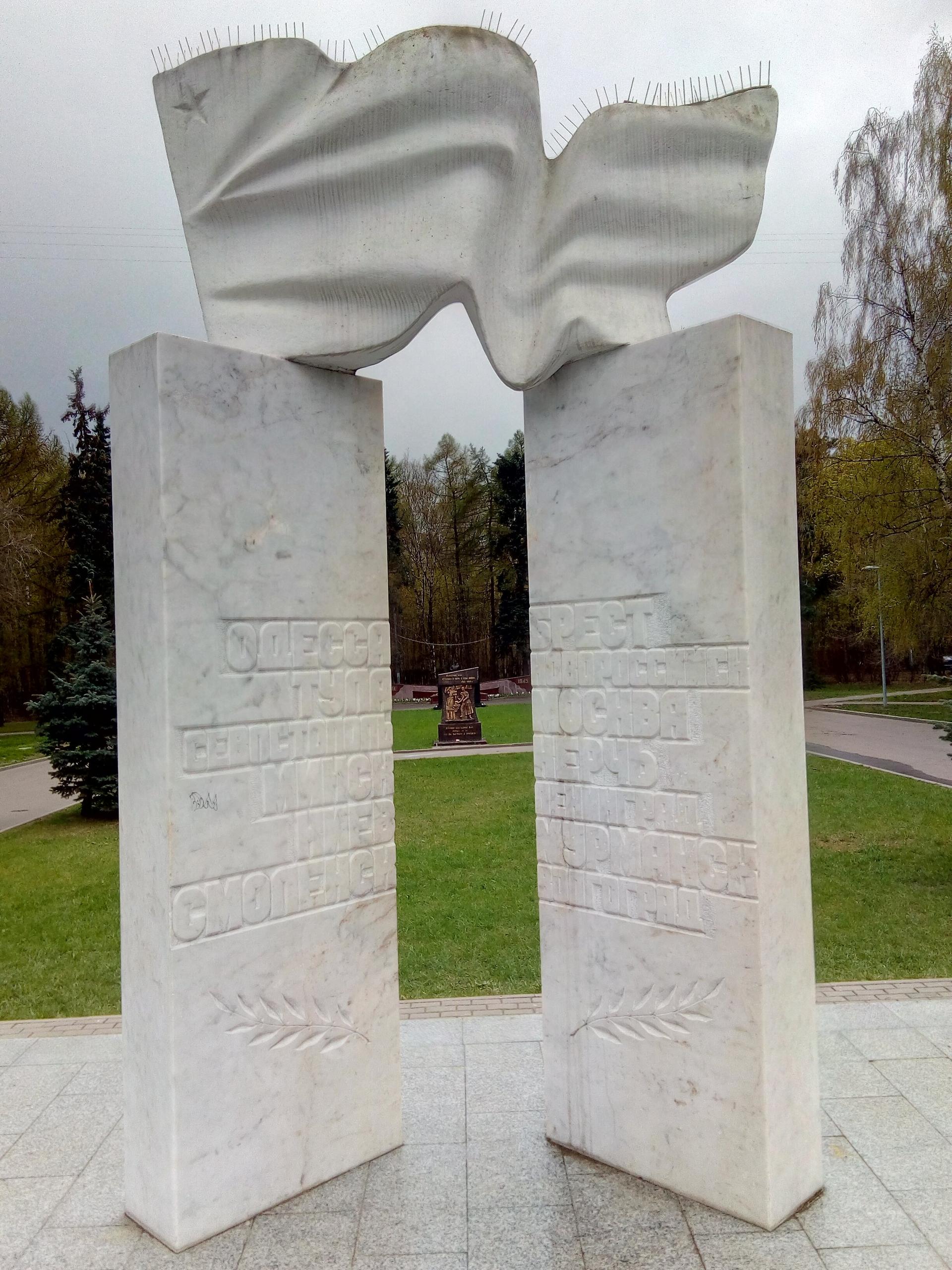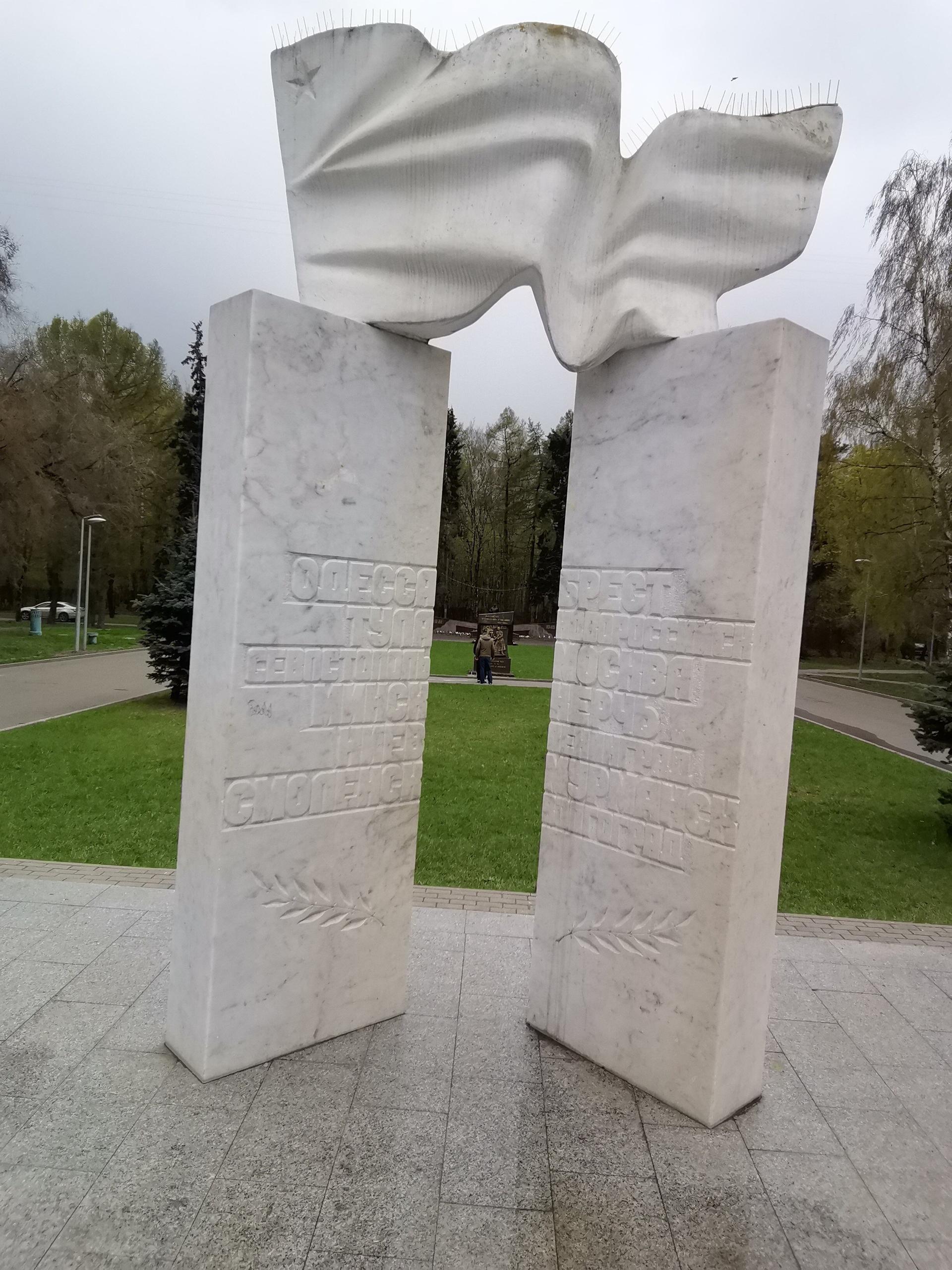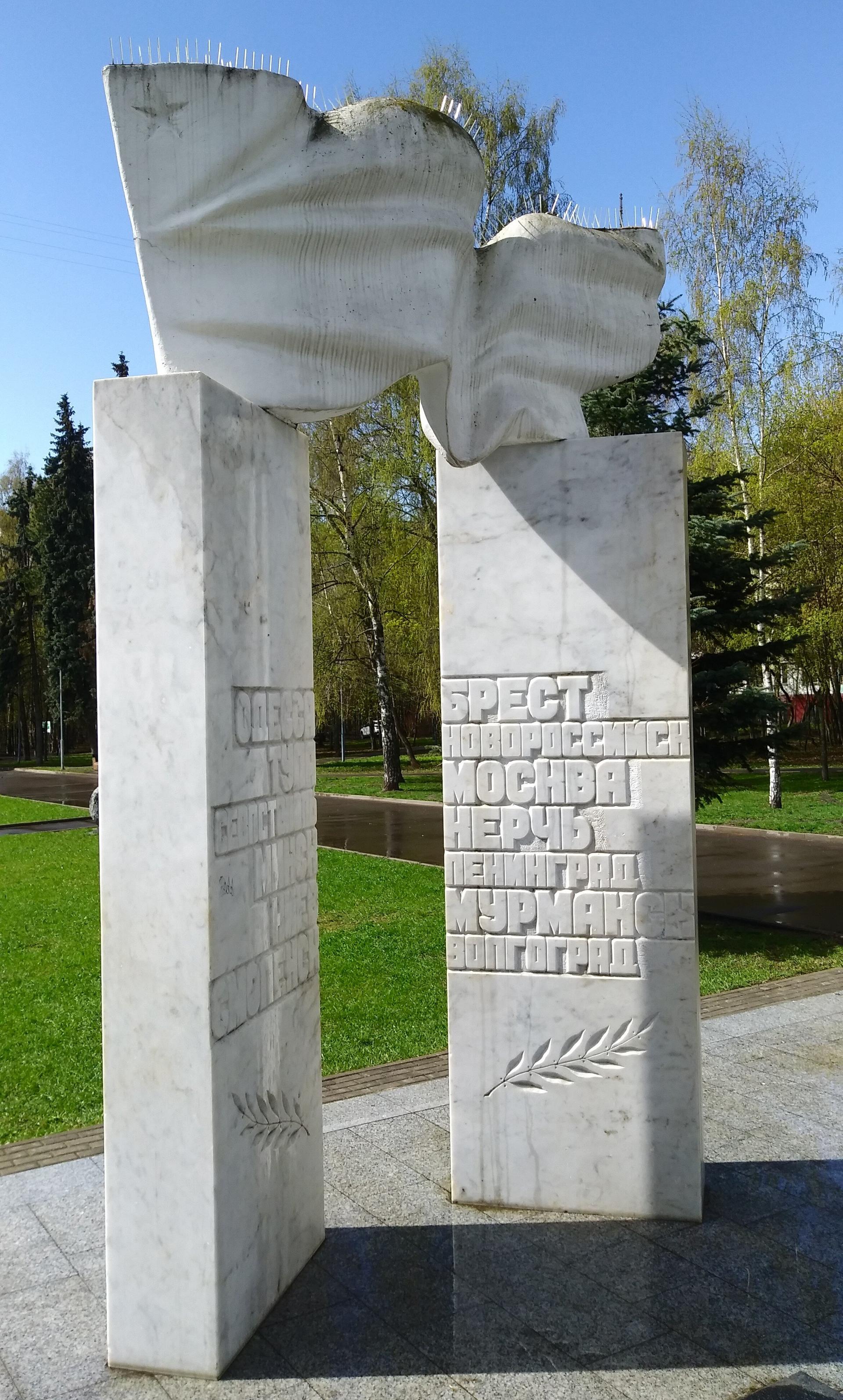 Мемориальный комплекс «Города-герои» представляет собой монумент из двух мраморных пилонов, на которых установлен развевающийся флаг. На каждом из пилонов высечены названия городов-героев Советского Союза.