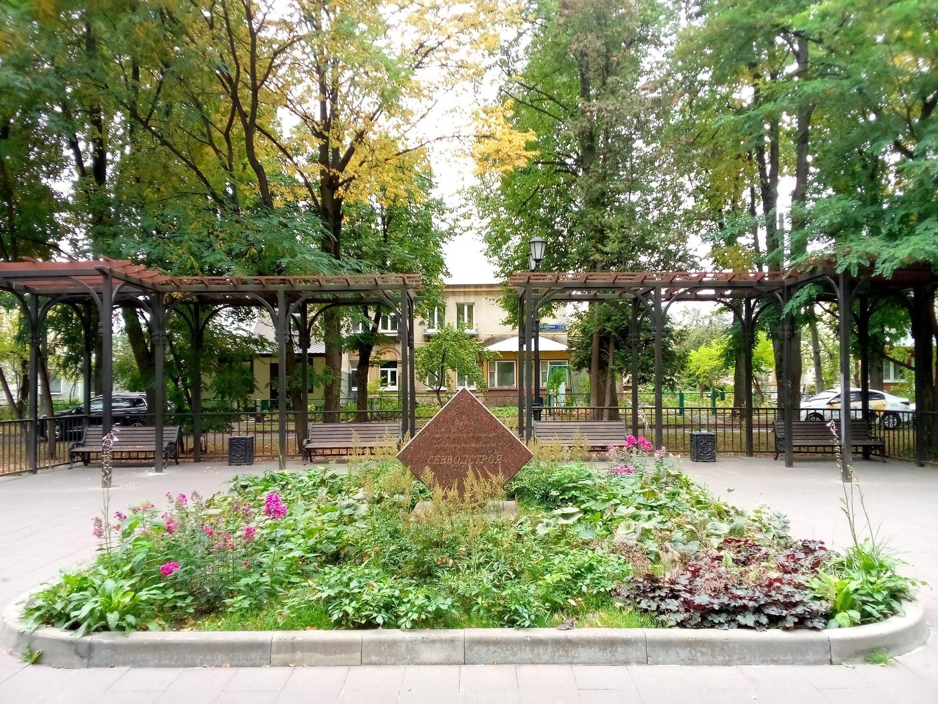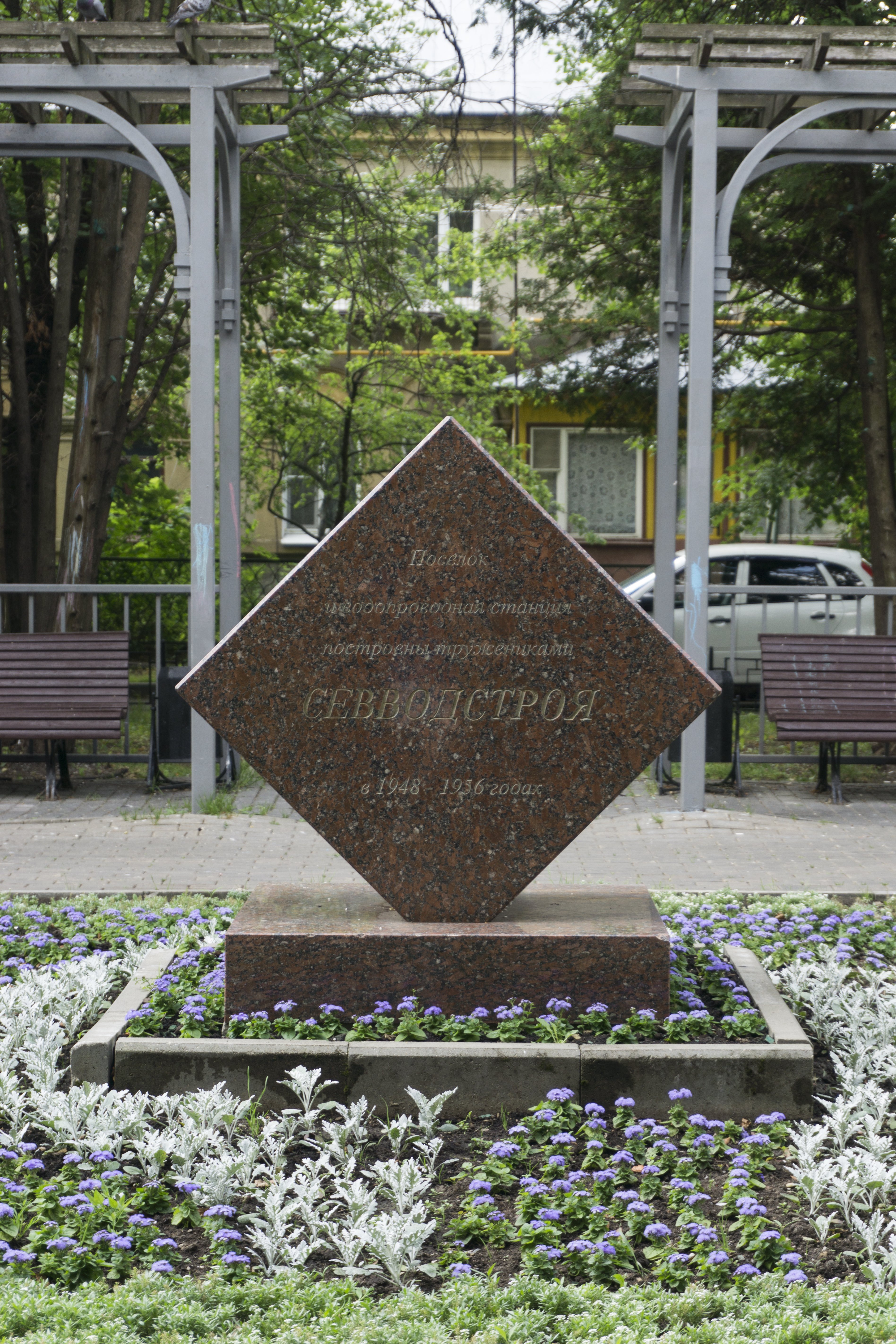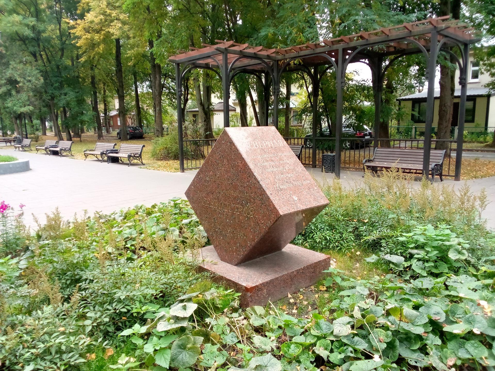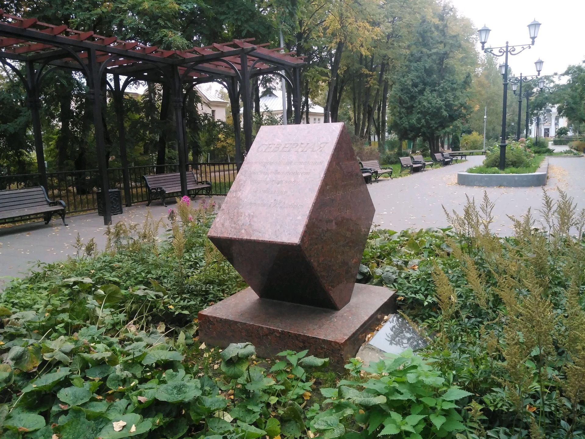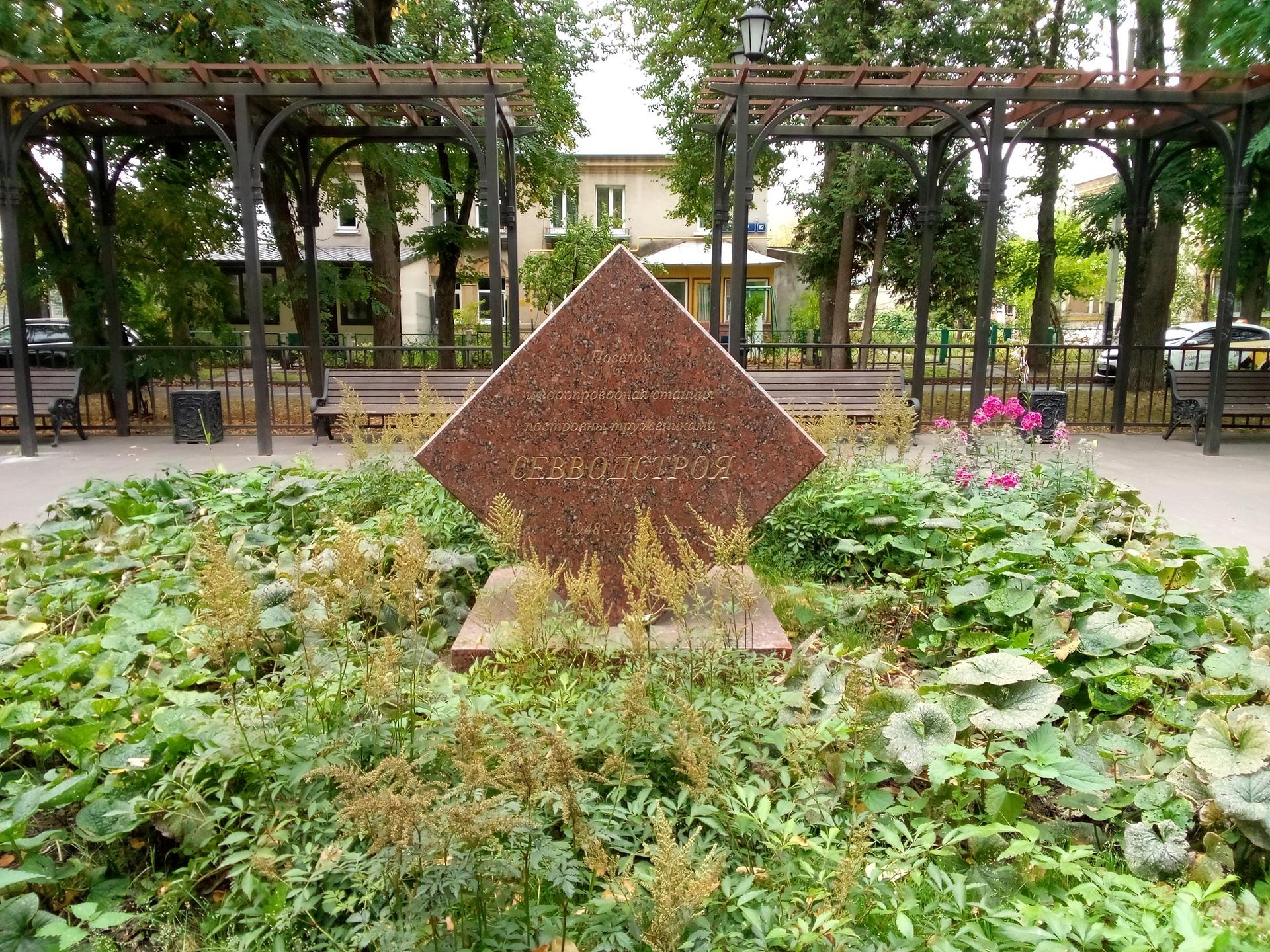 Памятник представляет собой гранитный шестигранник, поставленный на ребро. На восточной вертикальной грани высечено: «Поселок и водопроводная станция построены тружениками Севводстроя в 1948-1956 гг.». На западной вертикальной грани: «Памятный знак установлен в ознаменование 50-летия работы станции». На северной наклонной грани: «Северная водопроводная станция постоянно подает питьевую воду в столицу. 12 апреля 1952 г.».