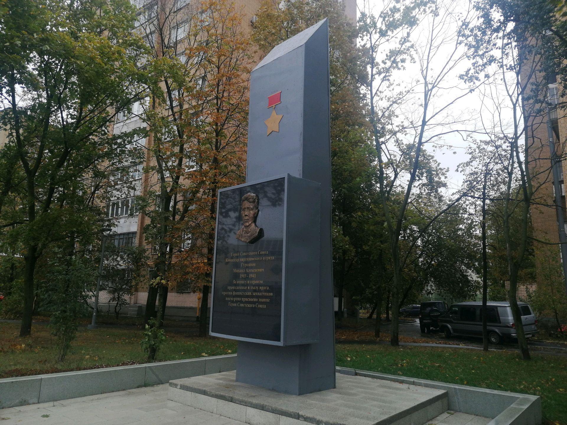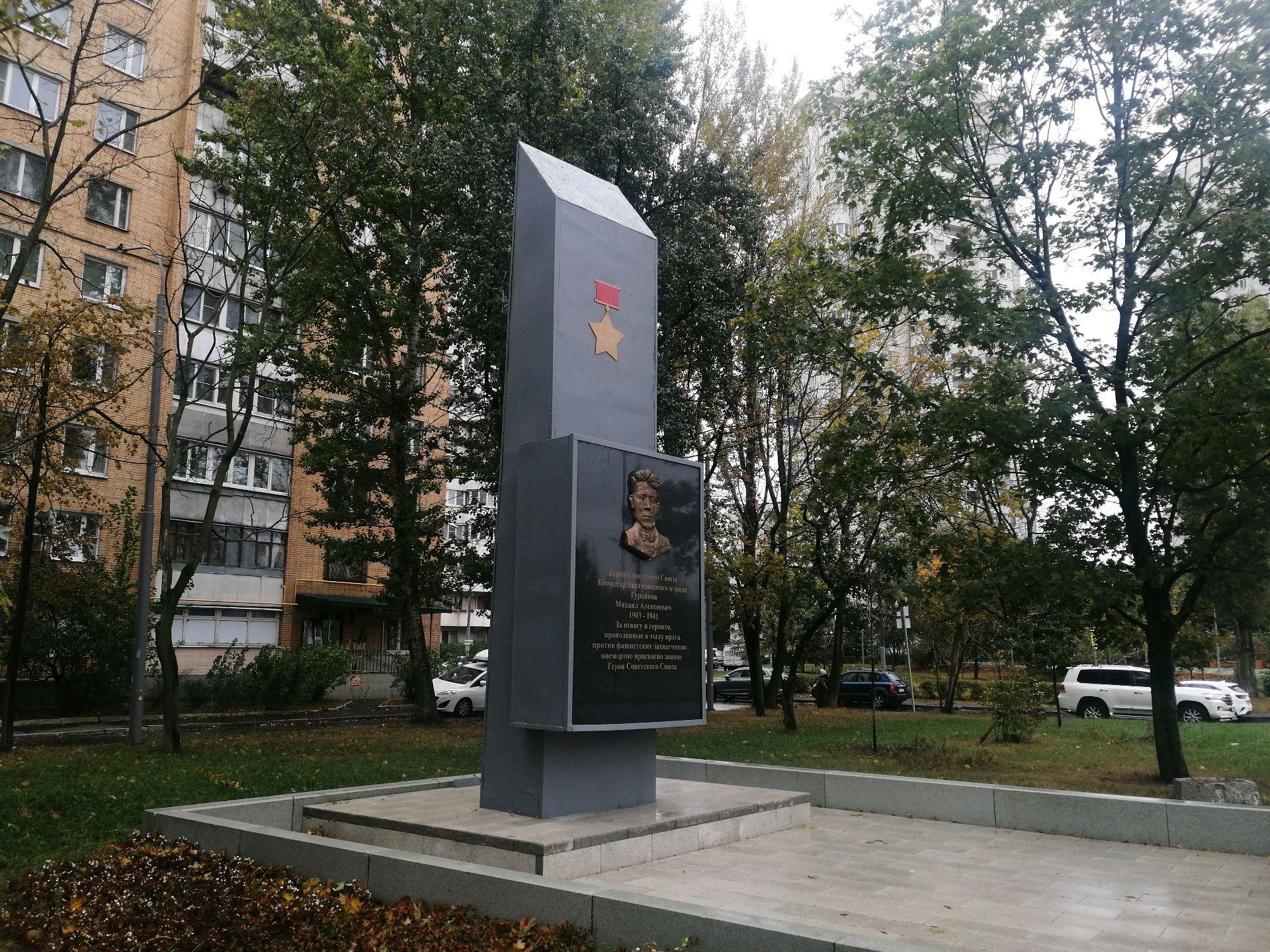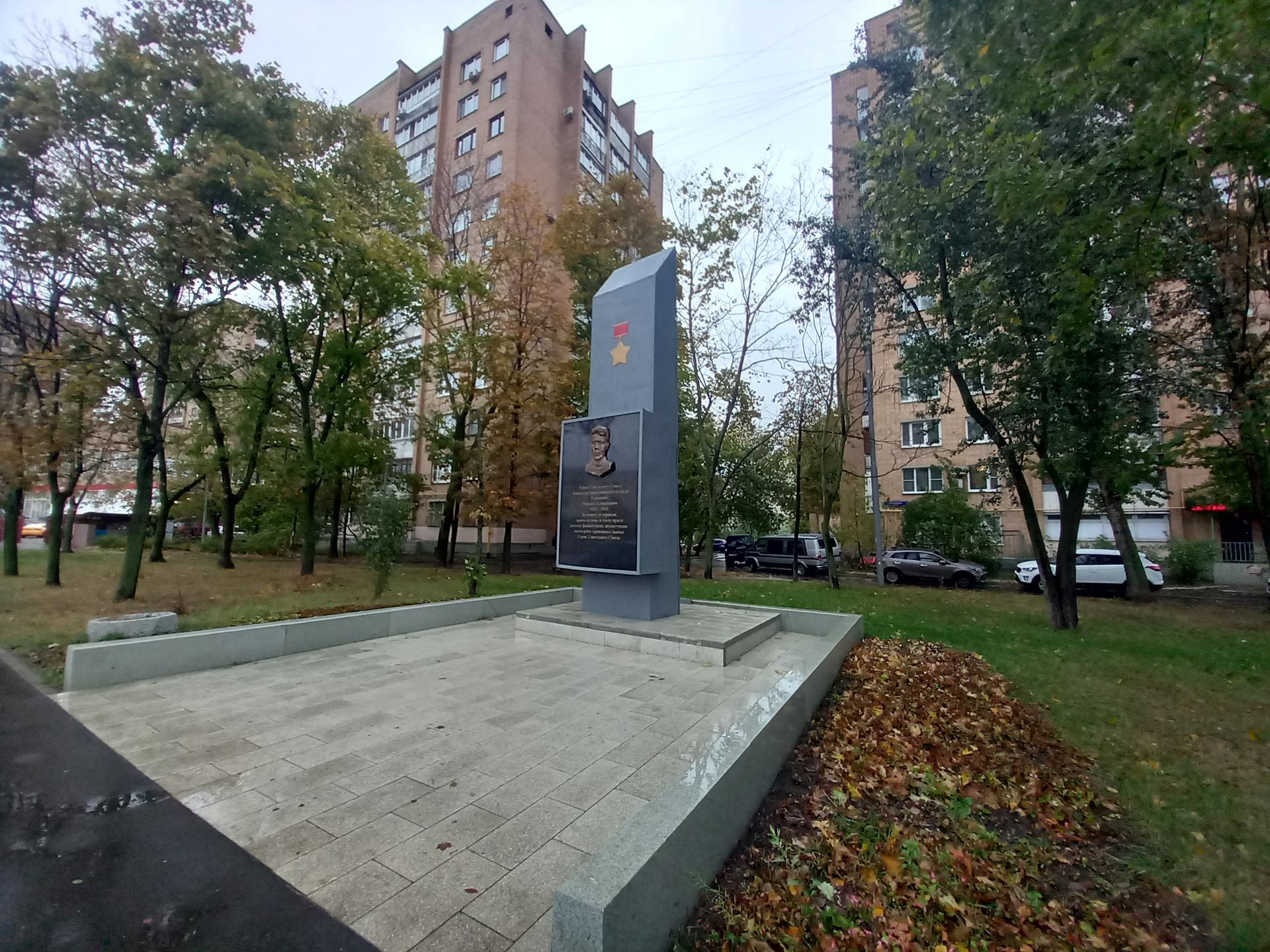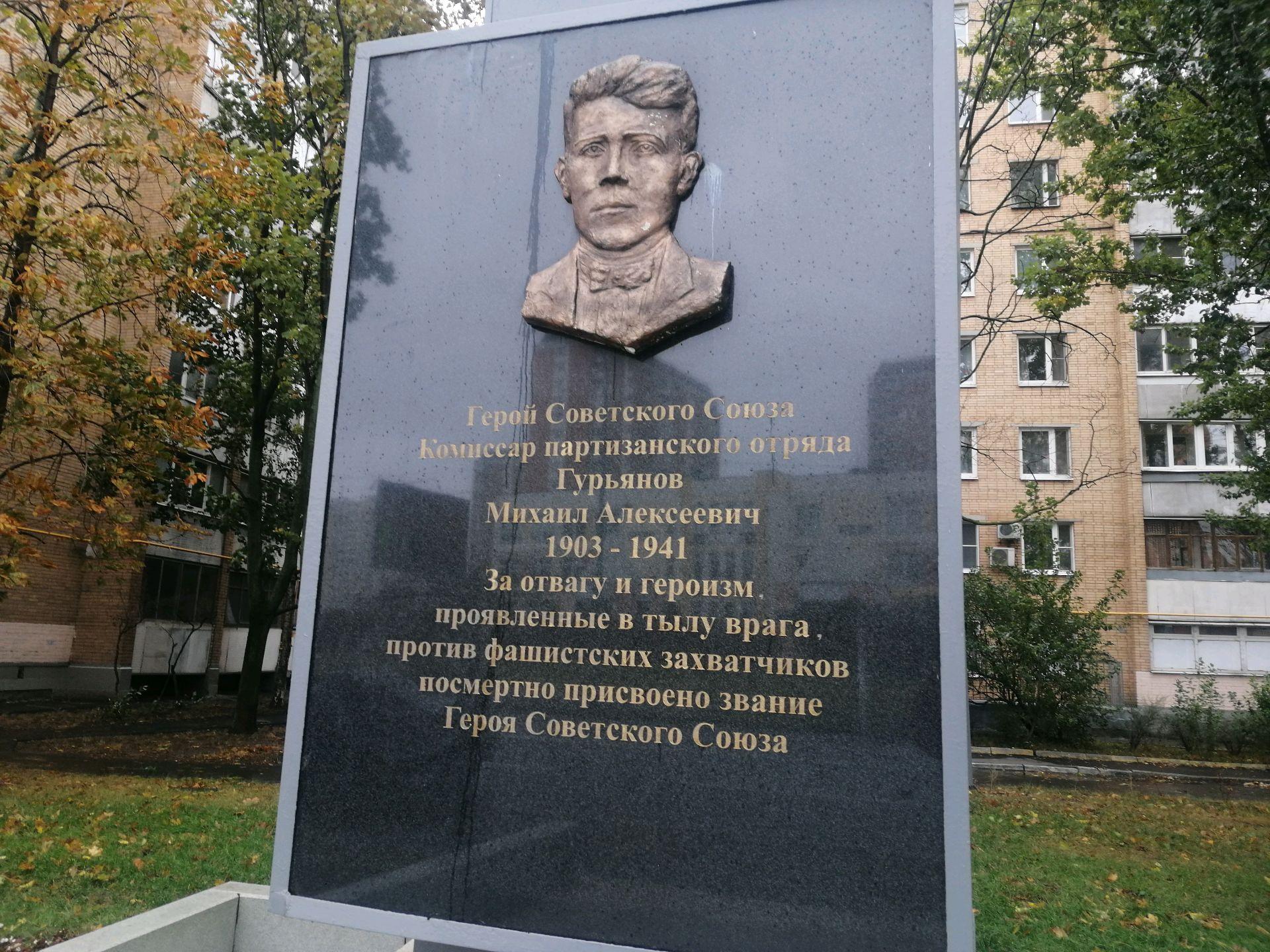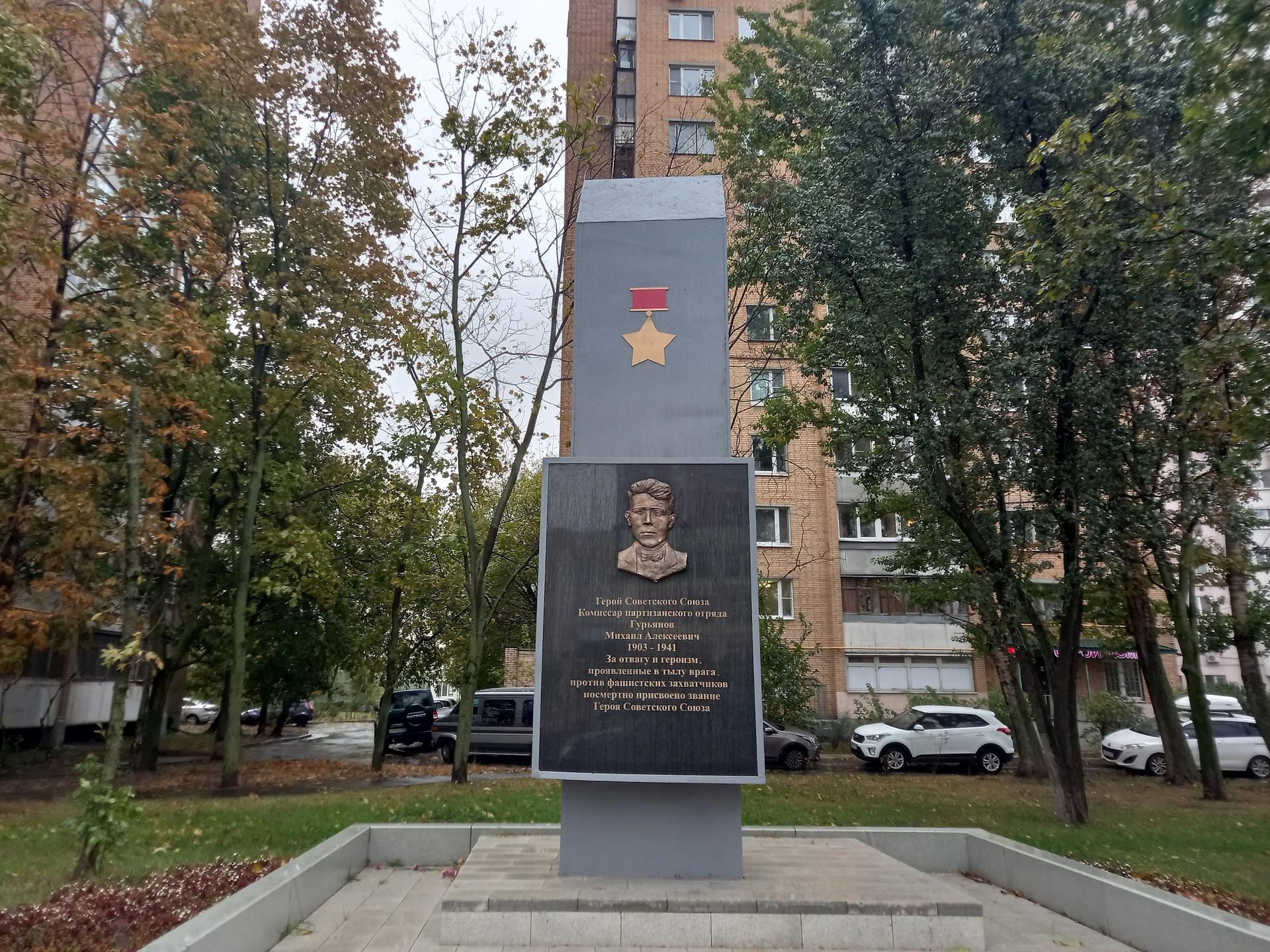 Памятник представляет собой металлическую стелу, установленную на невысоком бетонном постаменте. На ней размещен декоративный накладной элемент — медаль «Золотая Звезда» Героя Советского Союза, выполненная из металла. Под медалью установлена доска из металла, на которой закреплен барельеф М. А. Гурьянова, выполненный из латуни, и посвятительная надпись: «Герой Советского Союза комиссар партизанского отряда Гурьянов Михаил Алексеевич. 1903—1941. За отвагу и героизм, проявленные в тылу врага, против фашистских захватчиков посмертно присвоено звание Героя Советского Союза».