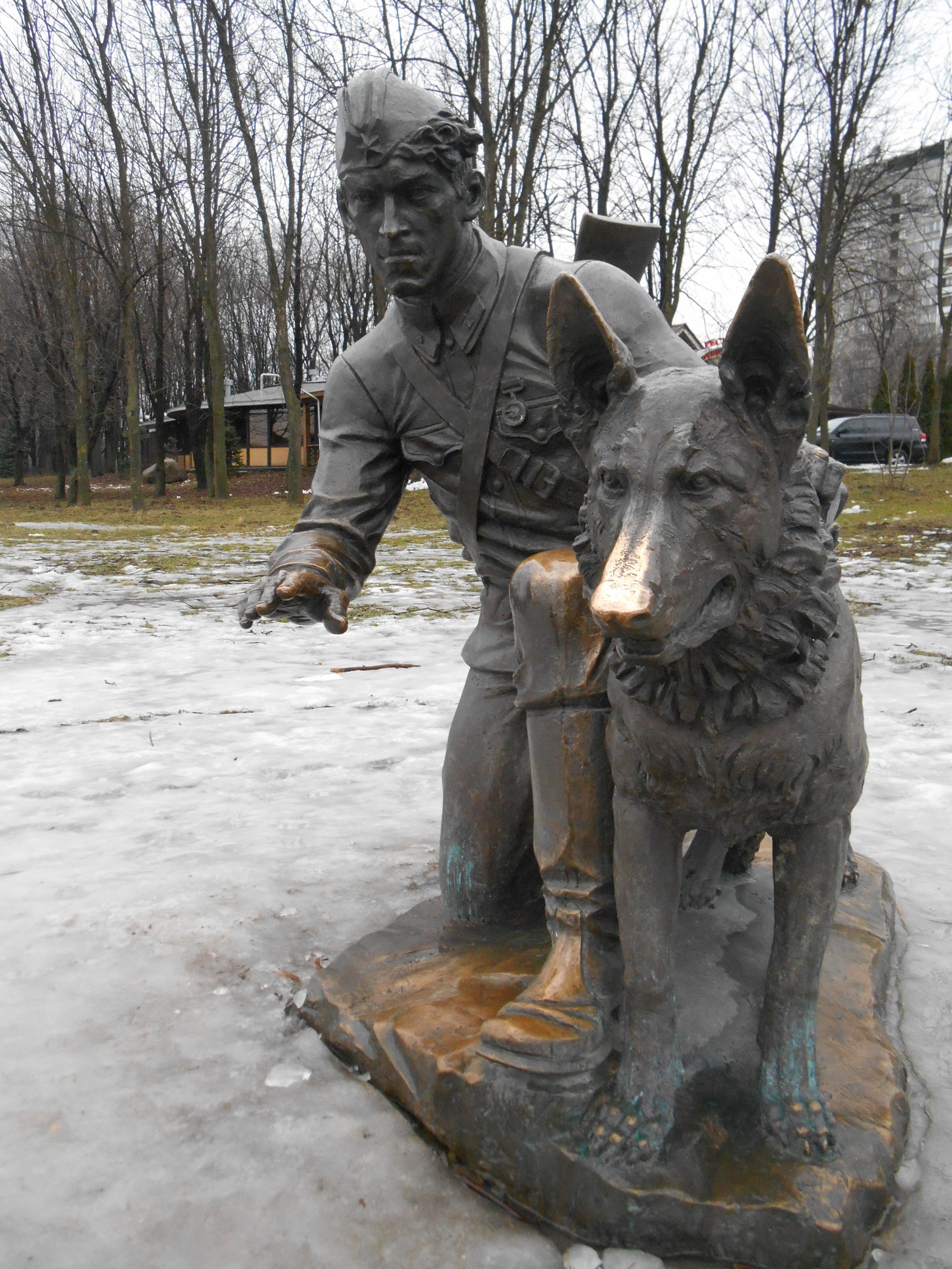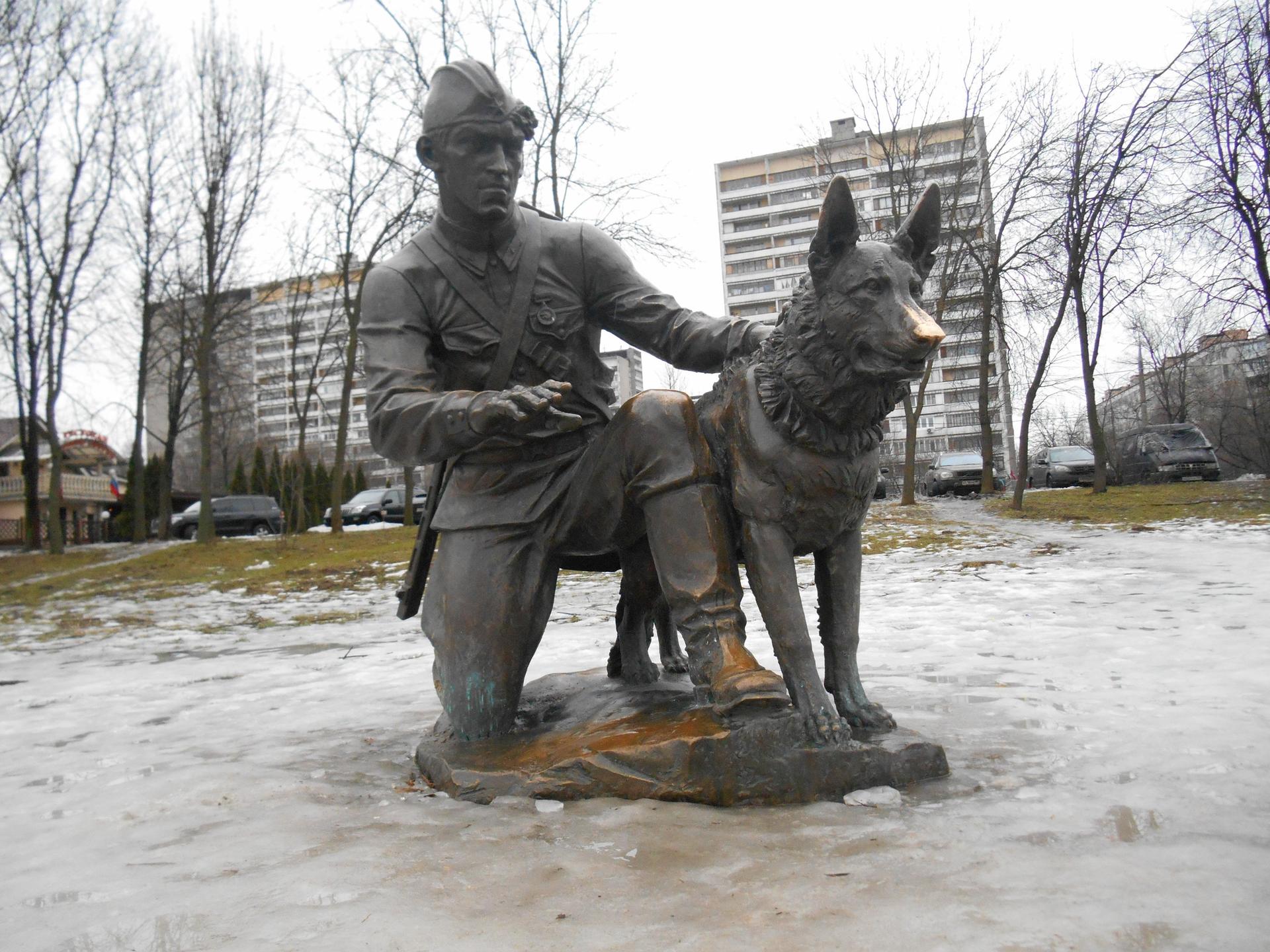 Скульптура Салавата Щербакова установлена в 2009 году на месте бывшего питомника служебного собаководства. Изображает военного, сидящего рядом с овчаркой. Поза человека и собаки говорит о том, что это тренировка, что инструктор учит, дает команду. Во время Великой Отечественной войны служебные собаки спасли много жизней и именно их работе посвящен этот памятник. Нос овчарки можно потереть на удачу.