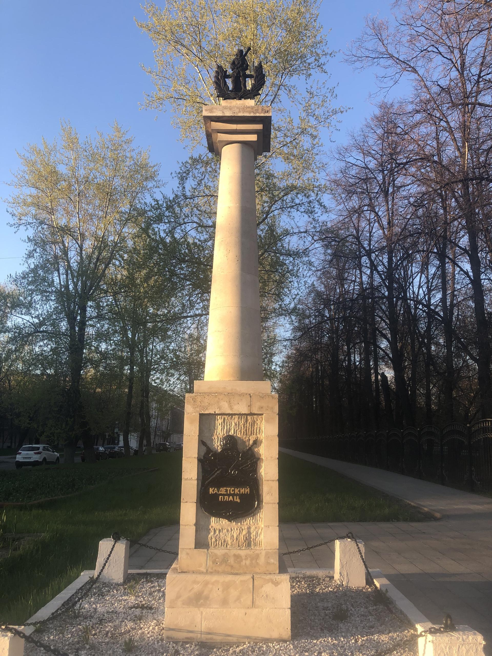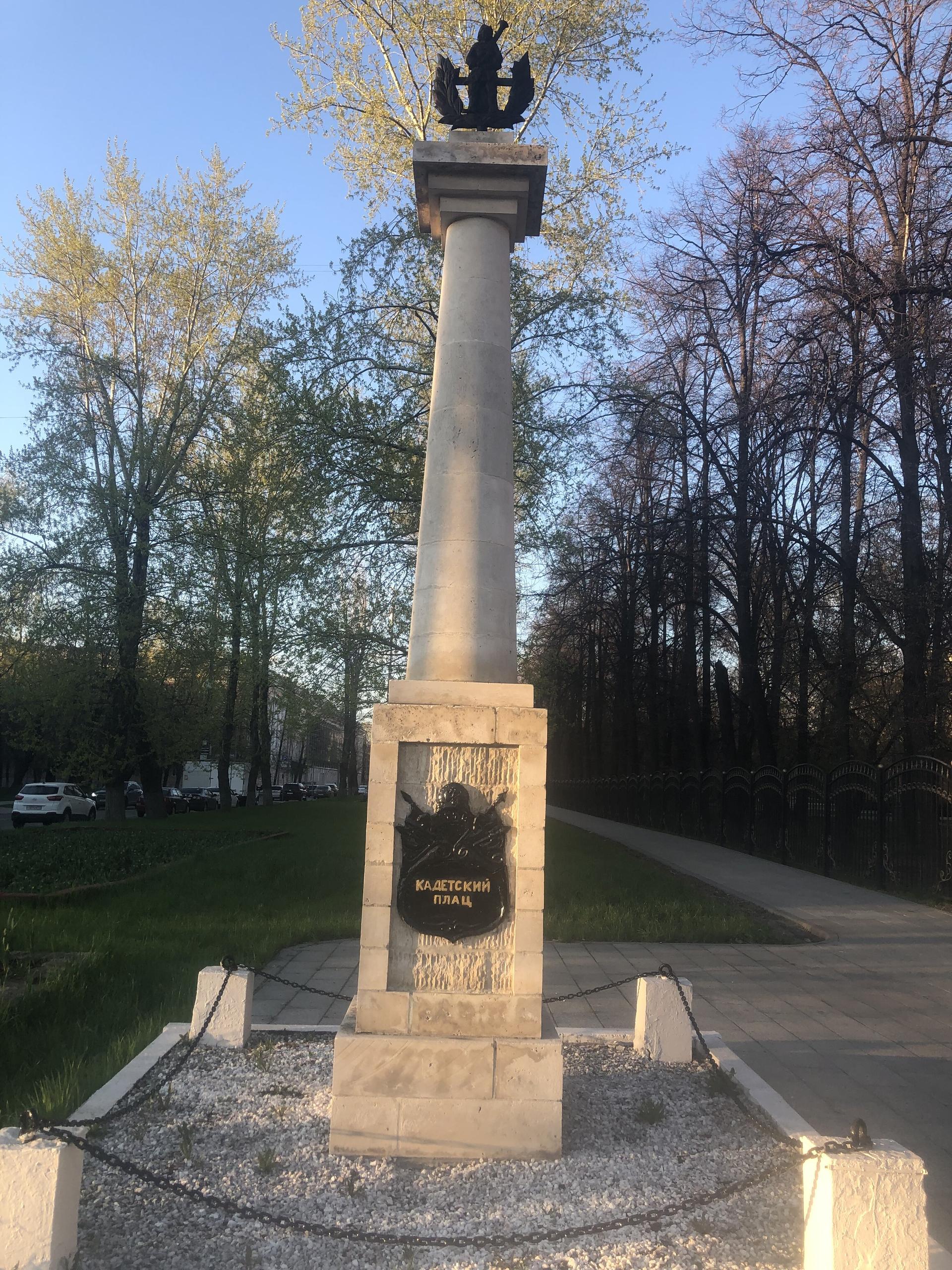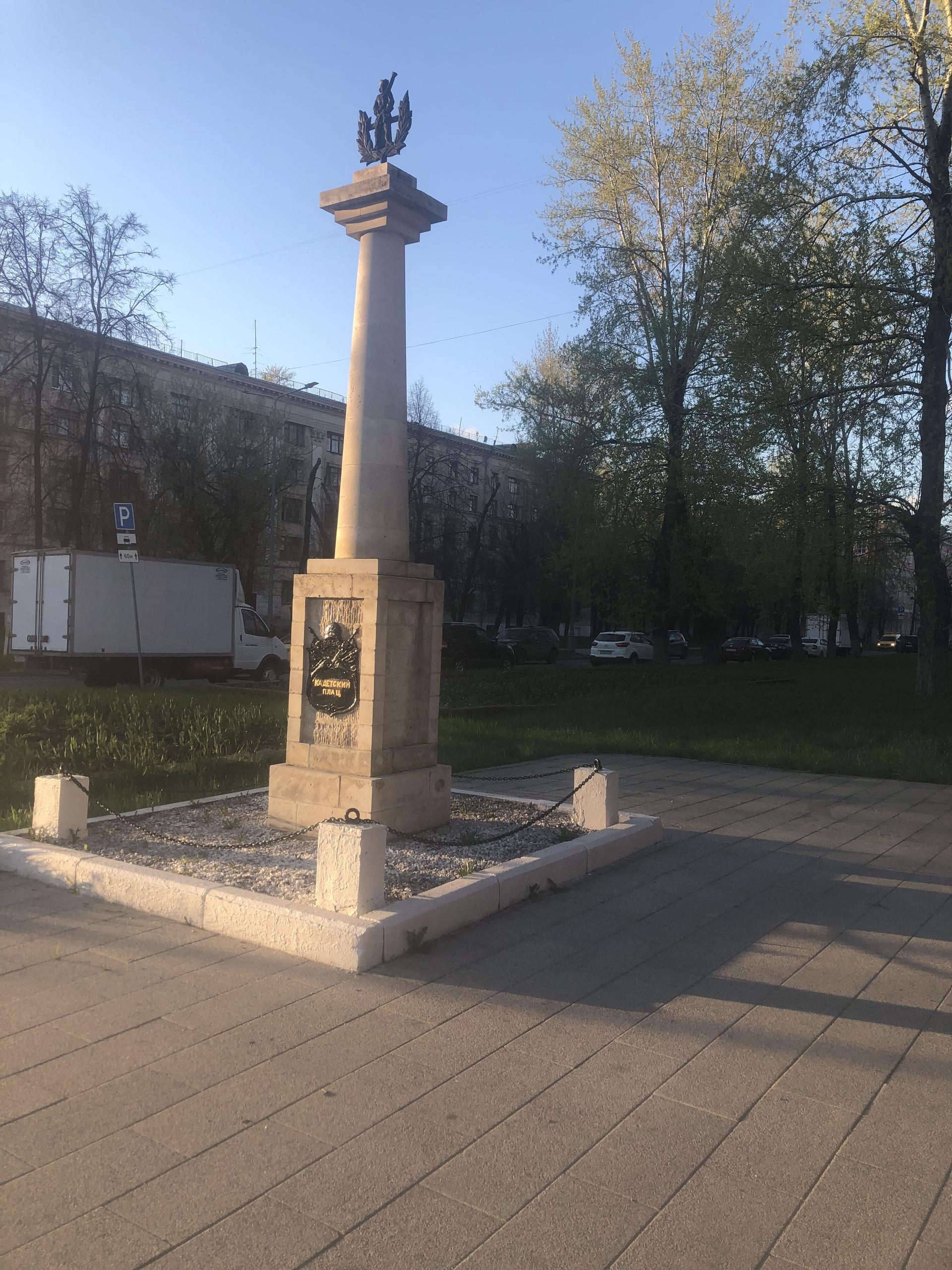 Колонна «Кадетский плац» установлена в память о существовавшем на месте нынешнего сквера плаце при 1-м и 2-м кадетских корпусах. Современное название площади (плаца) — Краснокурсантская площадь. До 1922 г. (по другим данным — до 12 августа 1924 г.) площадь называлась Кадетский плац, в XIX в. — Кадетская площадь, плац Кадетских корпусов. Эти названия связаны с плацем, который возник при императоре Павле I, и располагавшимися в Екатерининском дворце кадетскими корпусами.