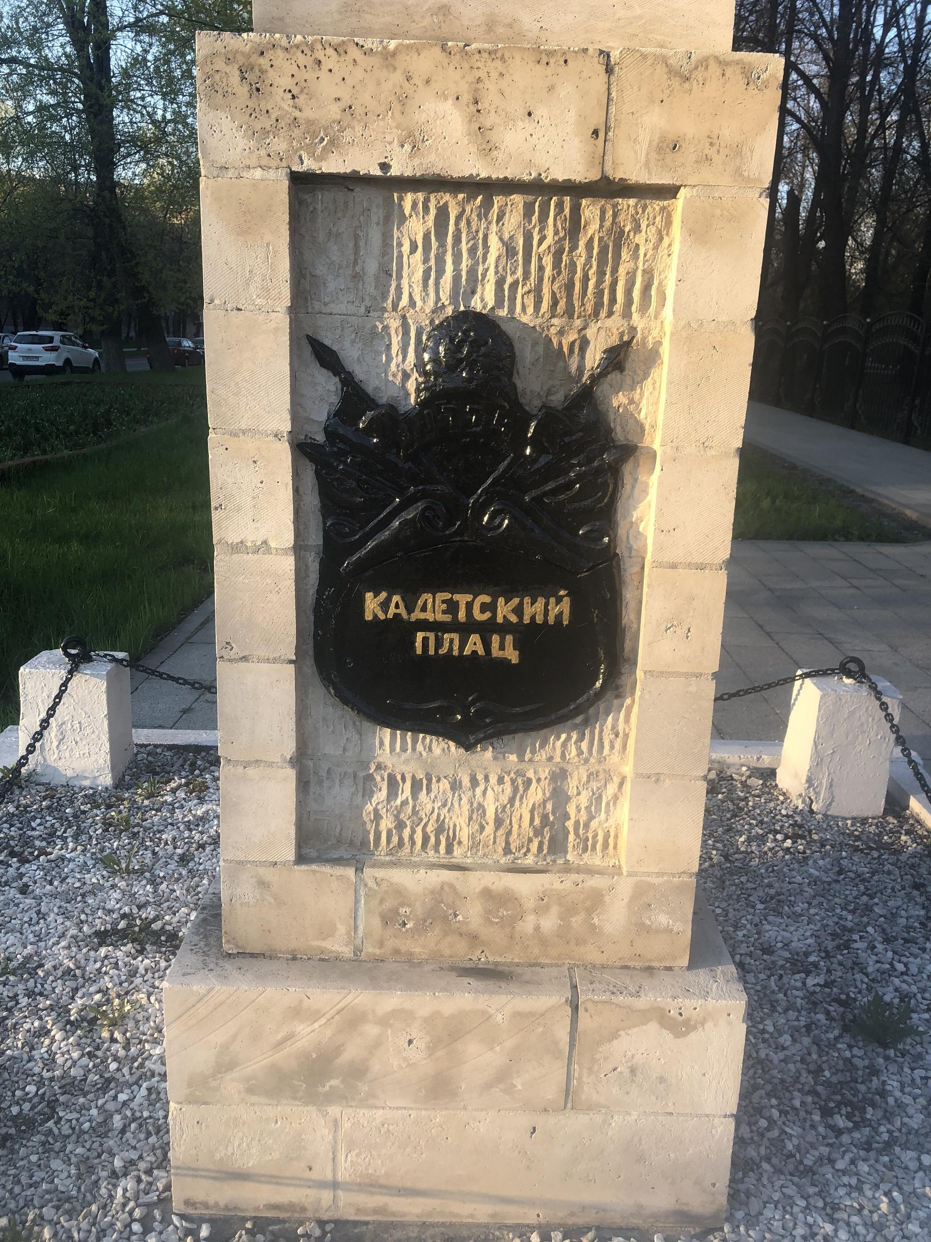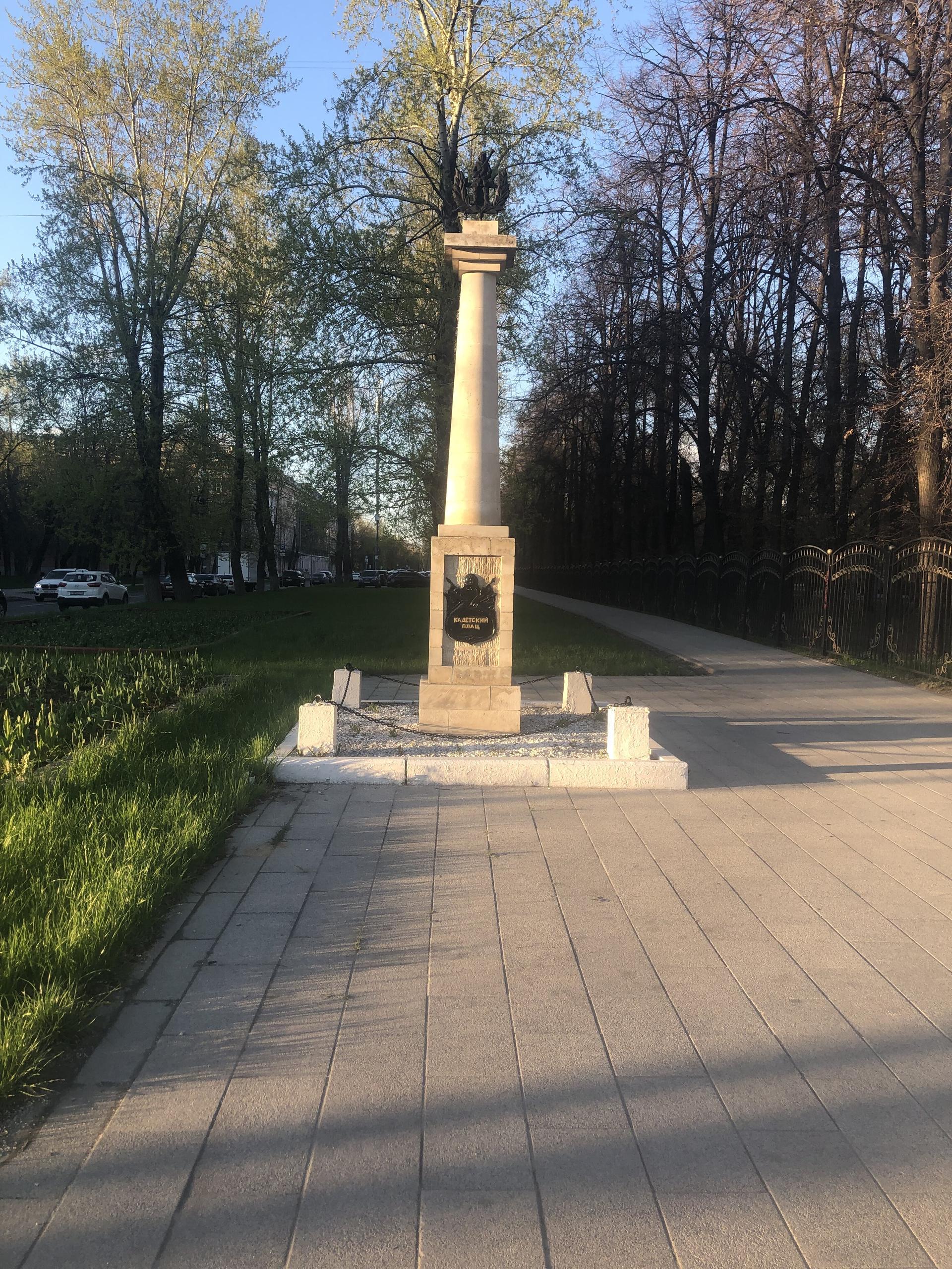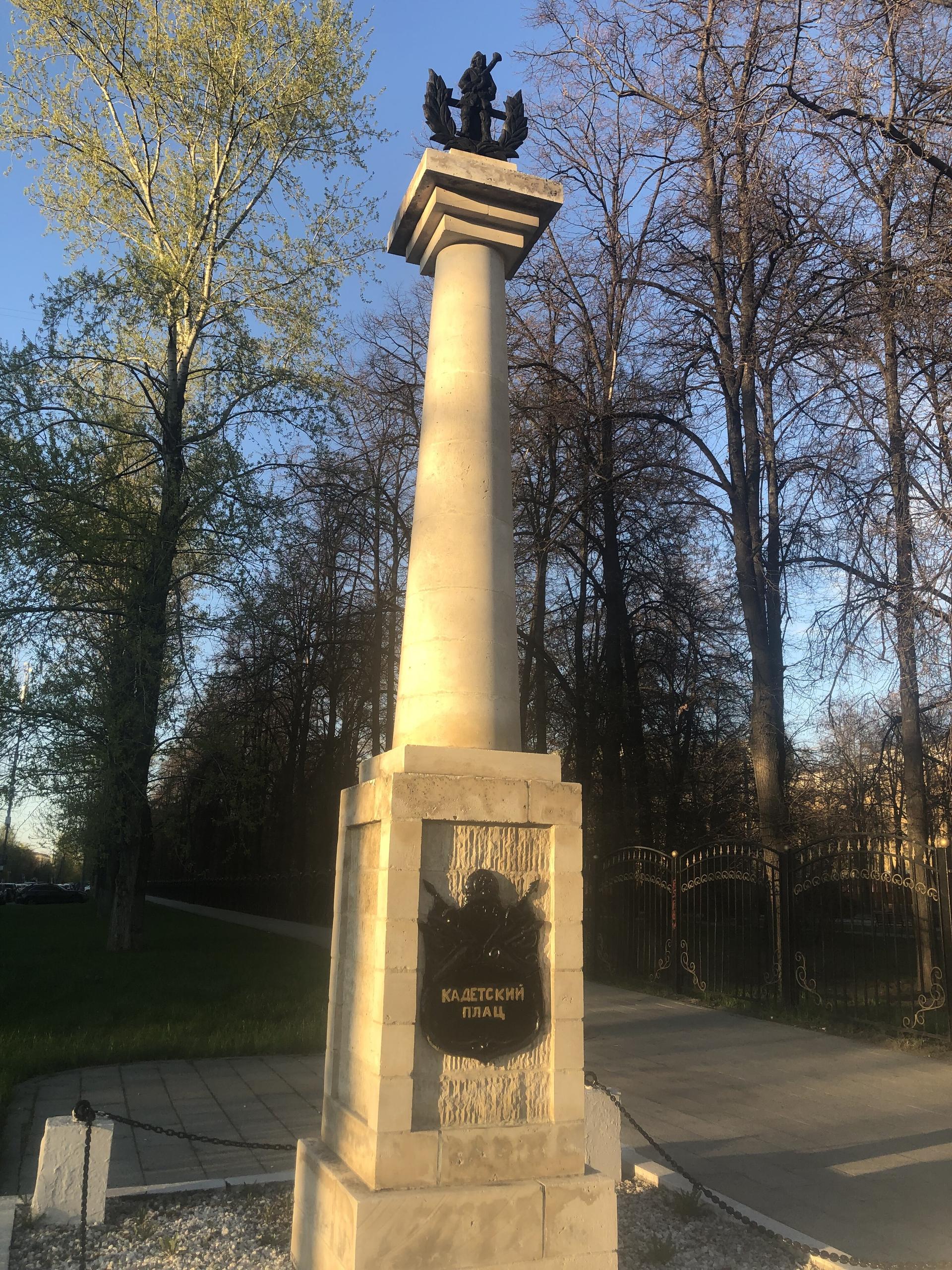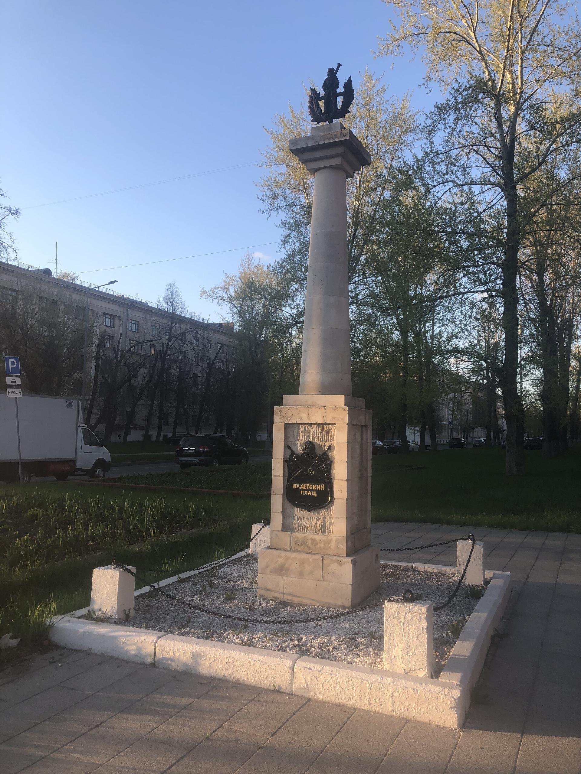 Колонна «Кадетский плац» установлена в память о существовавшем на месте нынешнего сквера плаце при 1-м и 2-м кадетских корпусах. Современное название площади (плаца) — Краснокурсантская площадь. До 1922 г. (по другим данным — до 12 августа 1924 г.) площадь называлась Кадетский плац, в XIX в. — Кадетская площадь, плац Кадетских корпусов. Эти названия связаны с плацем, который возник при императоре Павле I, и располагавшимися в Екатерининском дворце кадетскими корпусами.