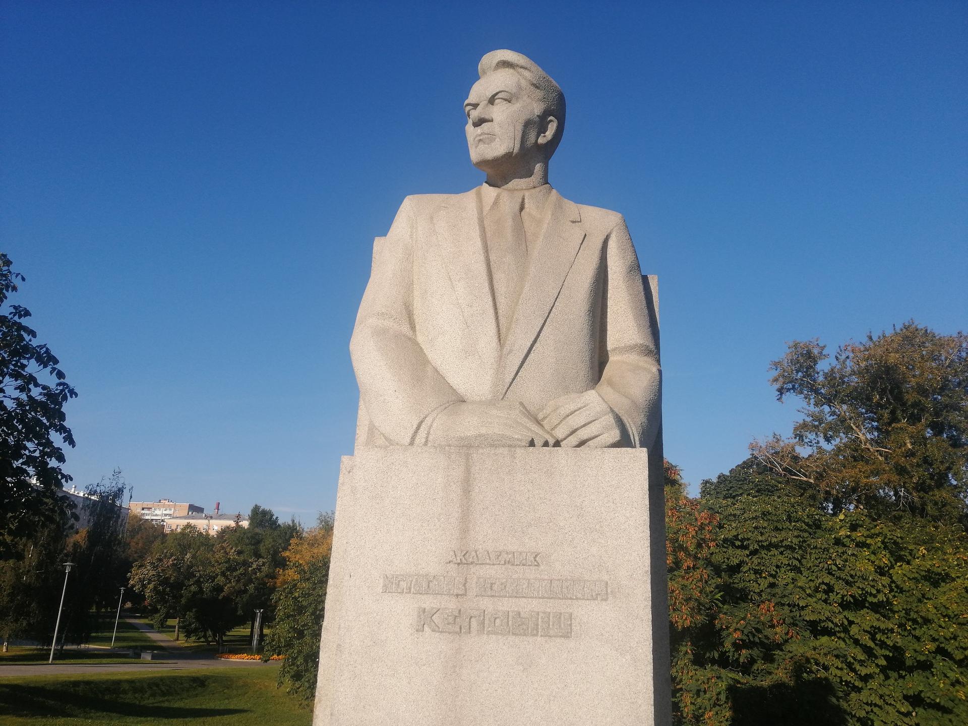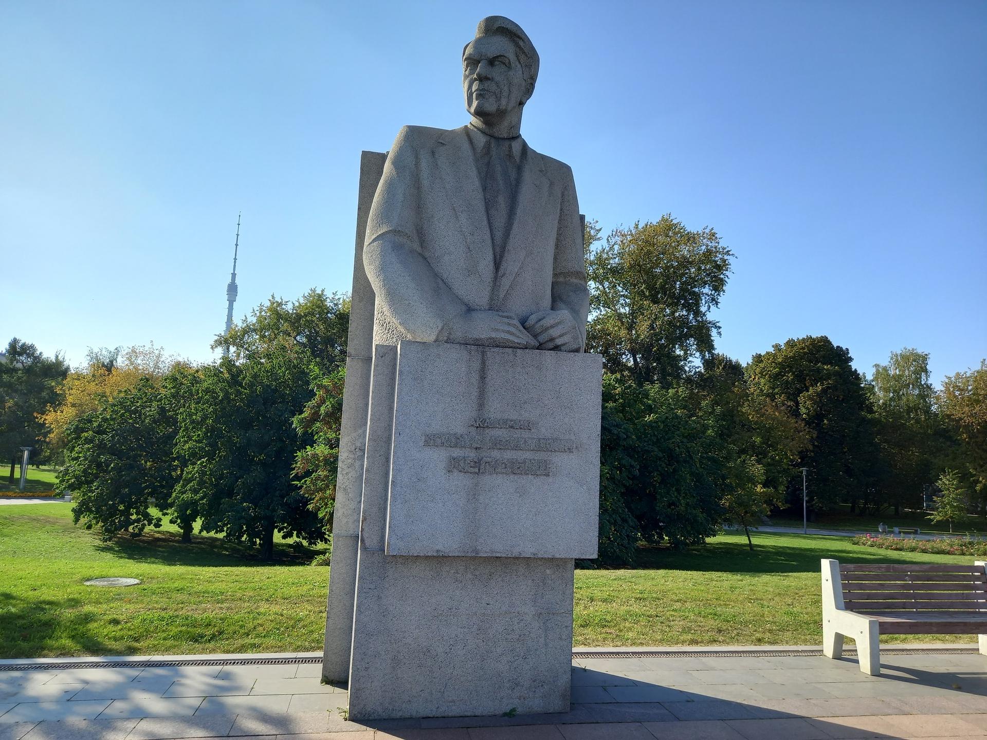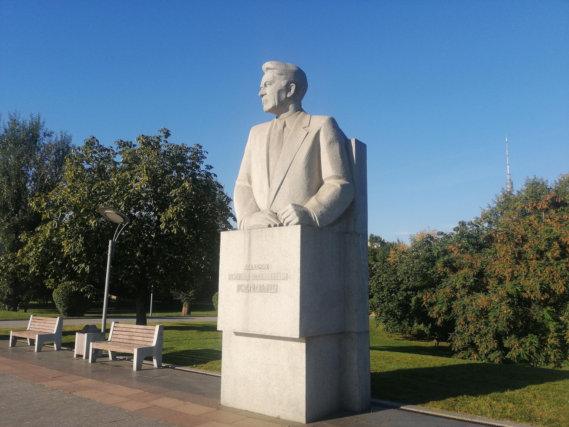 Гранитный памятник, установленный на гранитном постаменте, представляет М. В. Келдыша в строгом пиджаке, рубашке с галстуком. Инженер внимательно смотрит вдаль, голова повернута влево. Обе его руки сложены на постаменте — как на своеобразном рабочем столе. Памятная надпись гласит: «Академик Мстислав Всеволодович Келдыш».