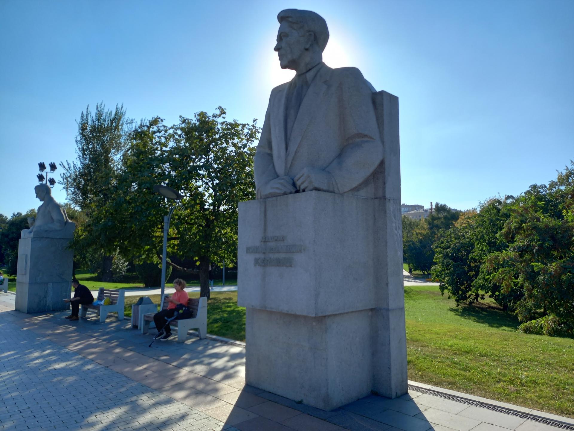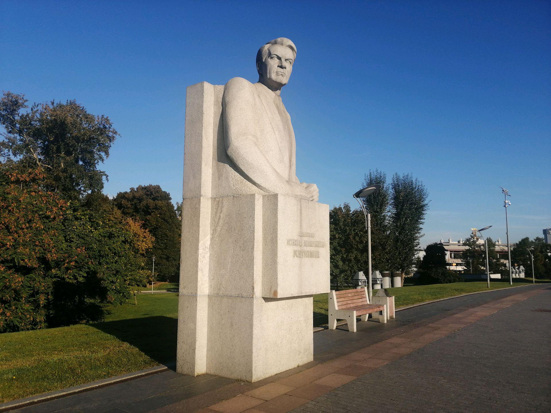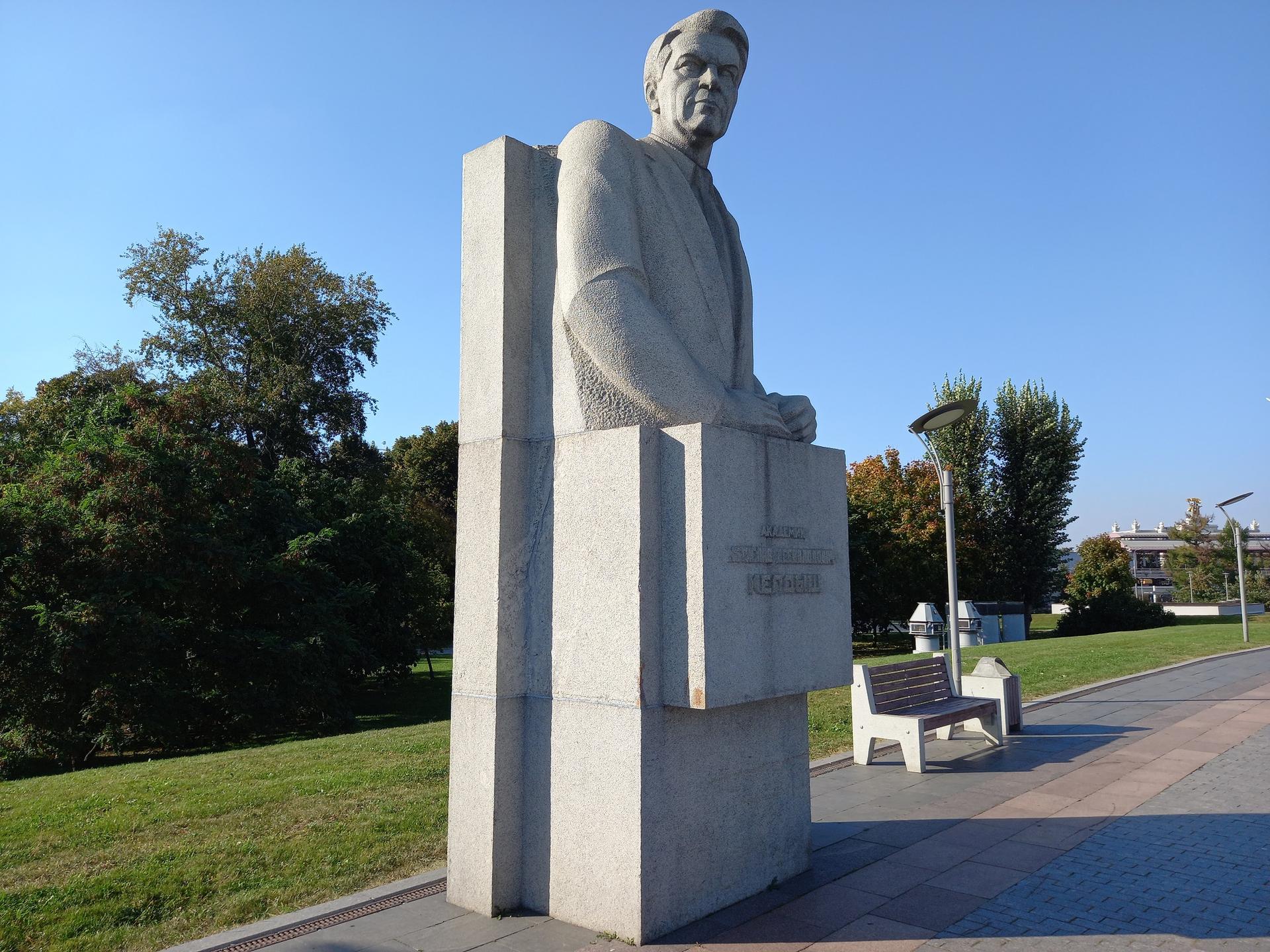 Гранитный памятник, установленный на гранитном постаменте, представляет М. В. Келдыша в строгом пиджаке, рубашке с галстуком. Инженер внимательно смотрит вдаль, голова повернута влево. Обе его руки сложены на постаменте — как на своеобразном рабочем столе. Памятная надпись гласит: «Академик Мстислав Всеволодович Келдыш».