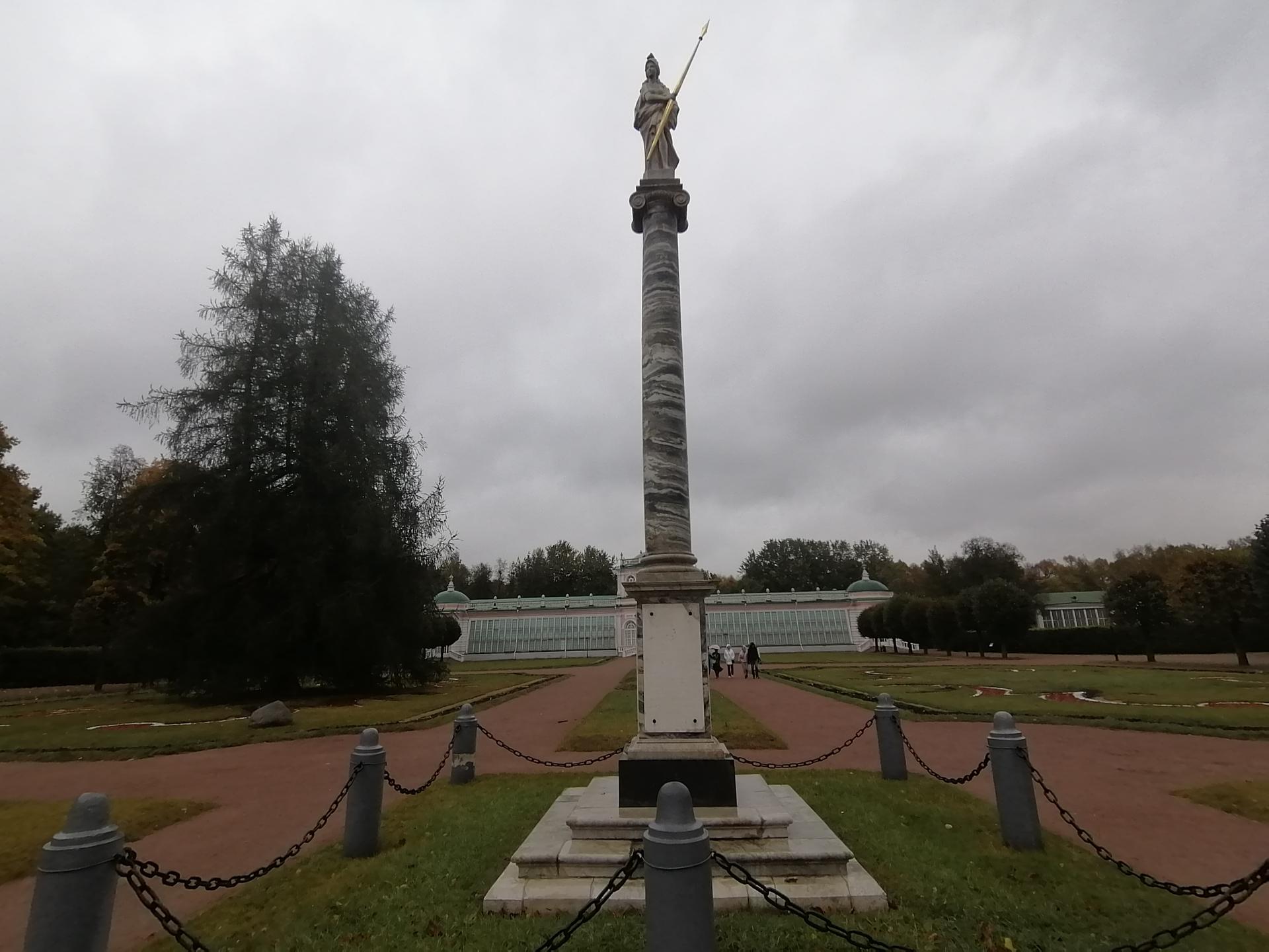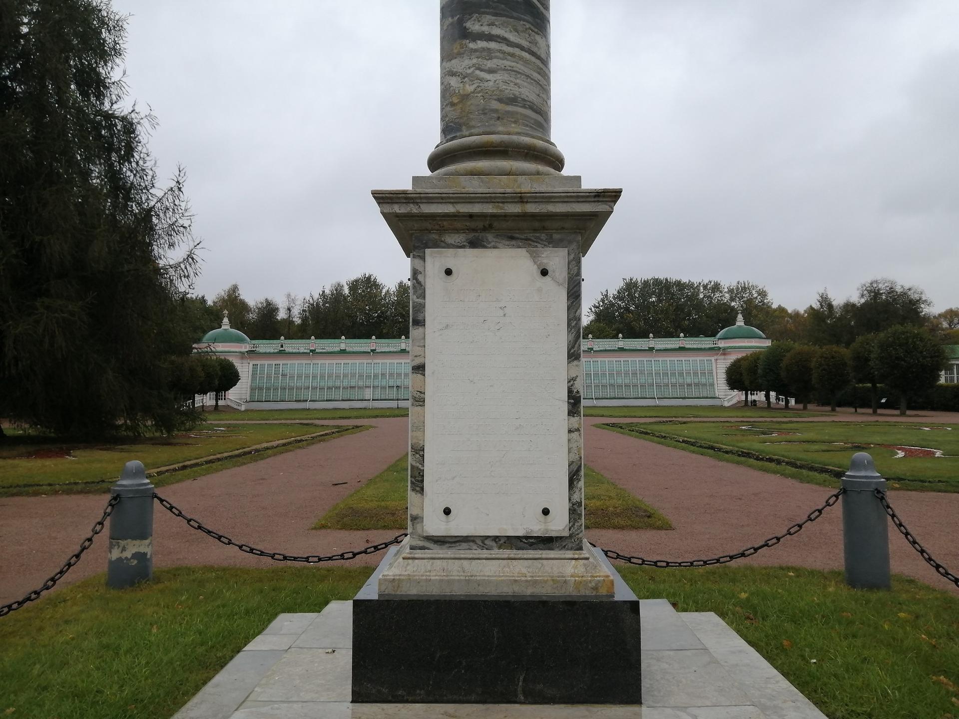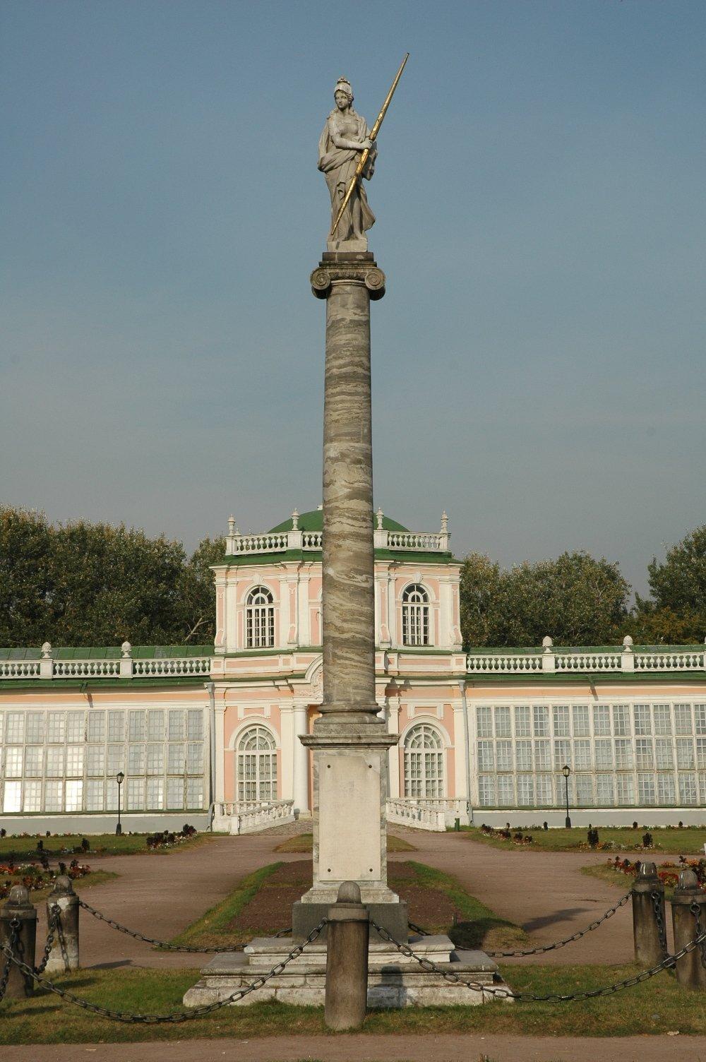Колонна со статуей Минервы была установлена в кусковском парке в 1779 году. Как следует из надписи, размещенной на мраморной доске постамента колонны, монумент был установлен в память о посещении усадьбы Екатериной II в 1775 году. Скульптура Минервы, венчающая колонну ионического ордера, ассоциировалась с императрицей, часто представавшей в произведениях искусства в образе римской богини.