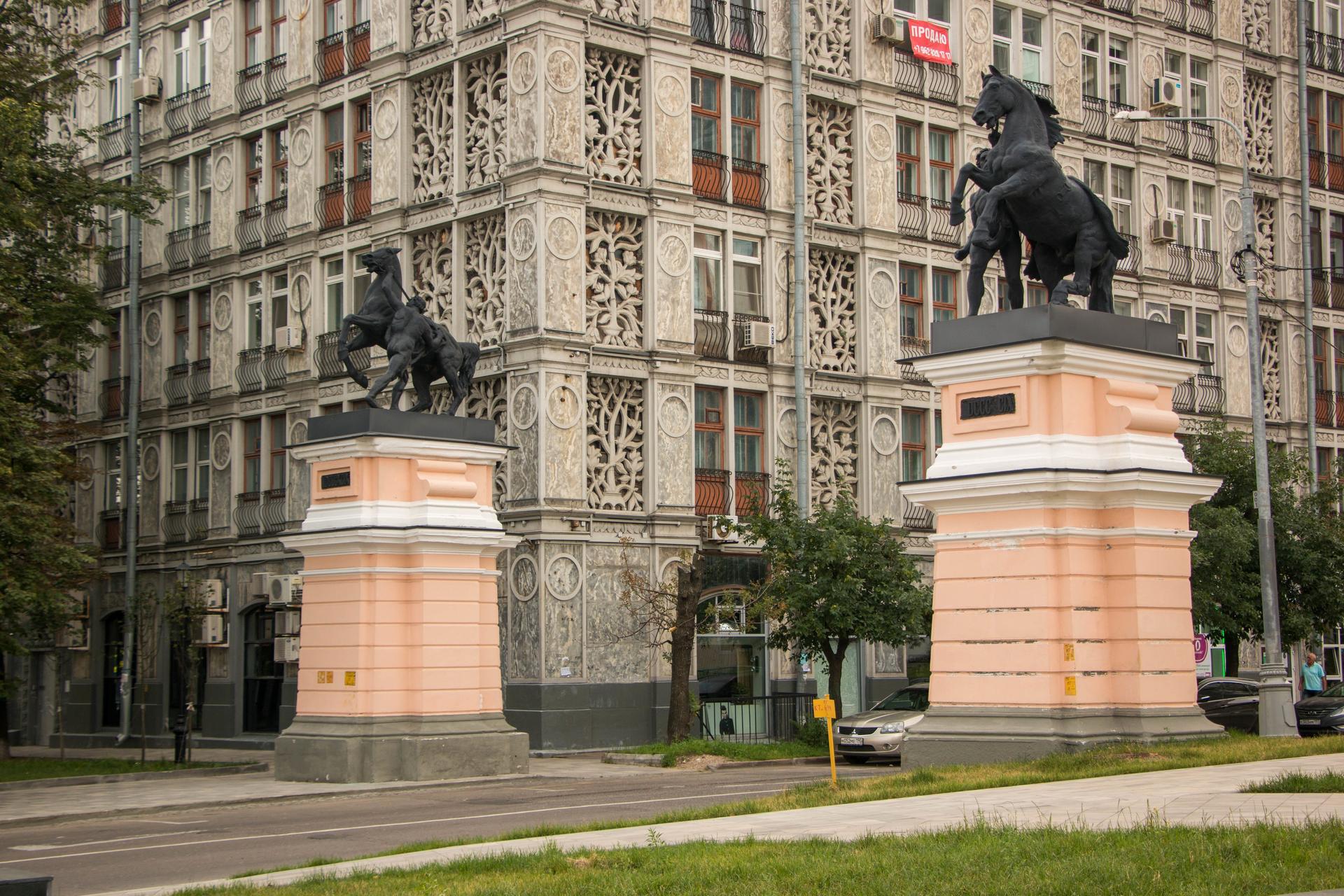 Конные скульптурные группы установлены в начале Беговой аллеи, символизируя центральный проезд к Московскому ипподрому и этапы укрощения необъезженного коня. На первой из этих работ конь встал на дыбы, он возбужден, ноздри раздуты, он пытается вырваться, но юноша-возничий взнуздал его и укрыл попоной. На второй показан момент, когда конь еще возбужденный, но уже подчинился человеку: юноша ведет его рядом с собой — подкованного и укрытого попоной. Плинты скульптур выполнены из шпиатра, цинкового сплава и металла.