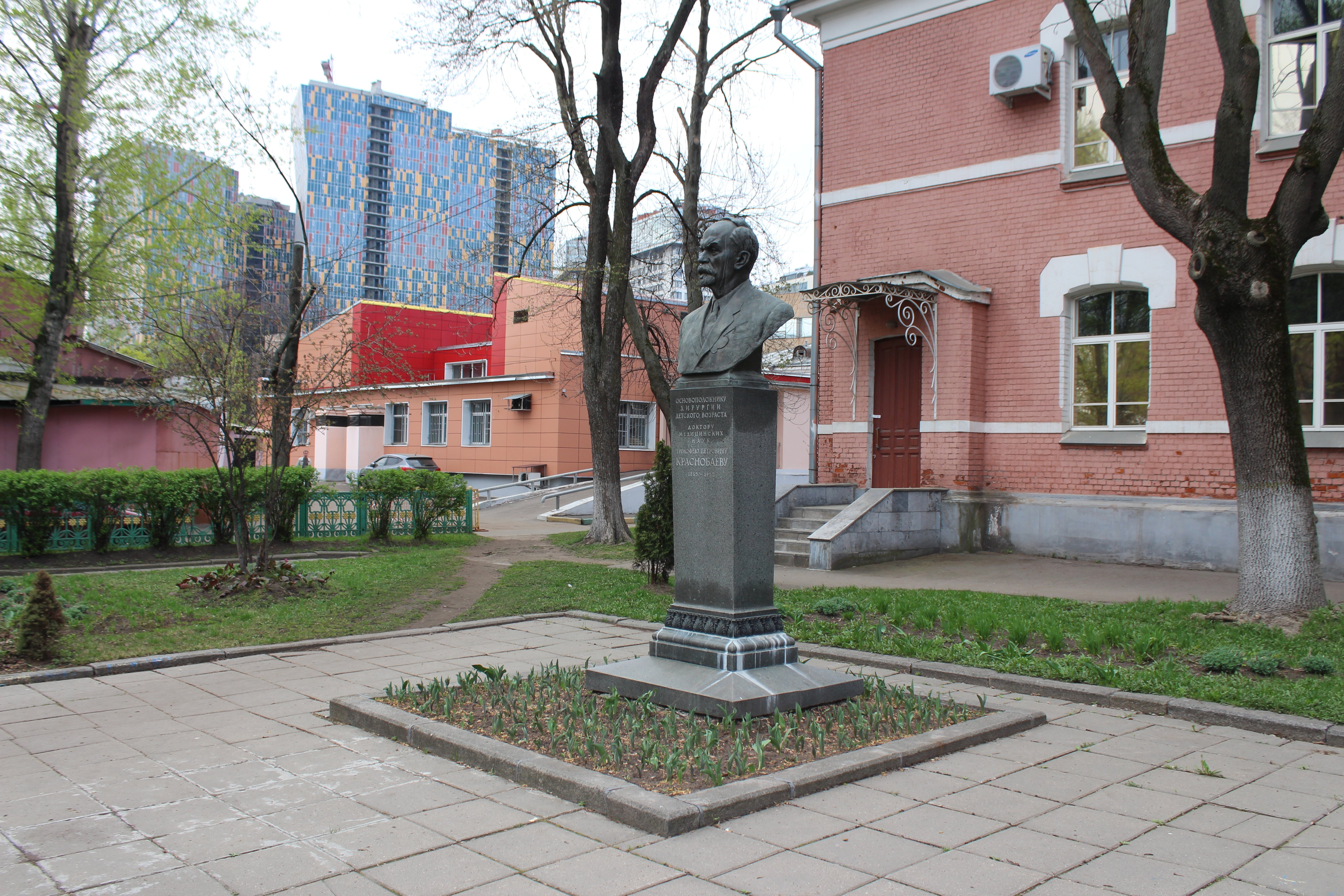 Бронзовый бюст установлен на гранитный постамент. Врач представлен в официальной манере: одет в строгий костюм, уверенно и внимательно смотрит вперед. Изображен детально, с портретным сходством. Памятная надпись на постаменте: «Основоположнику хирургии детского возраста, доктору медицинских наук Тимофею Петровичу Краснобаеву. 1865—1952».