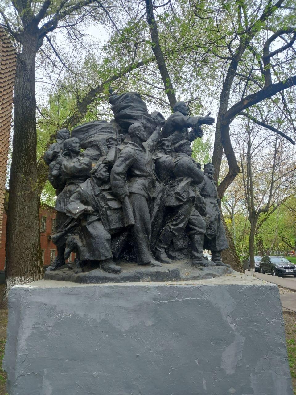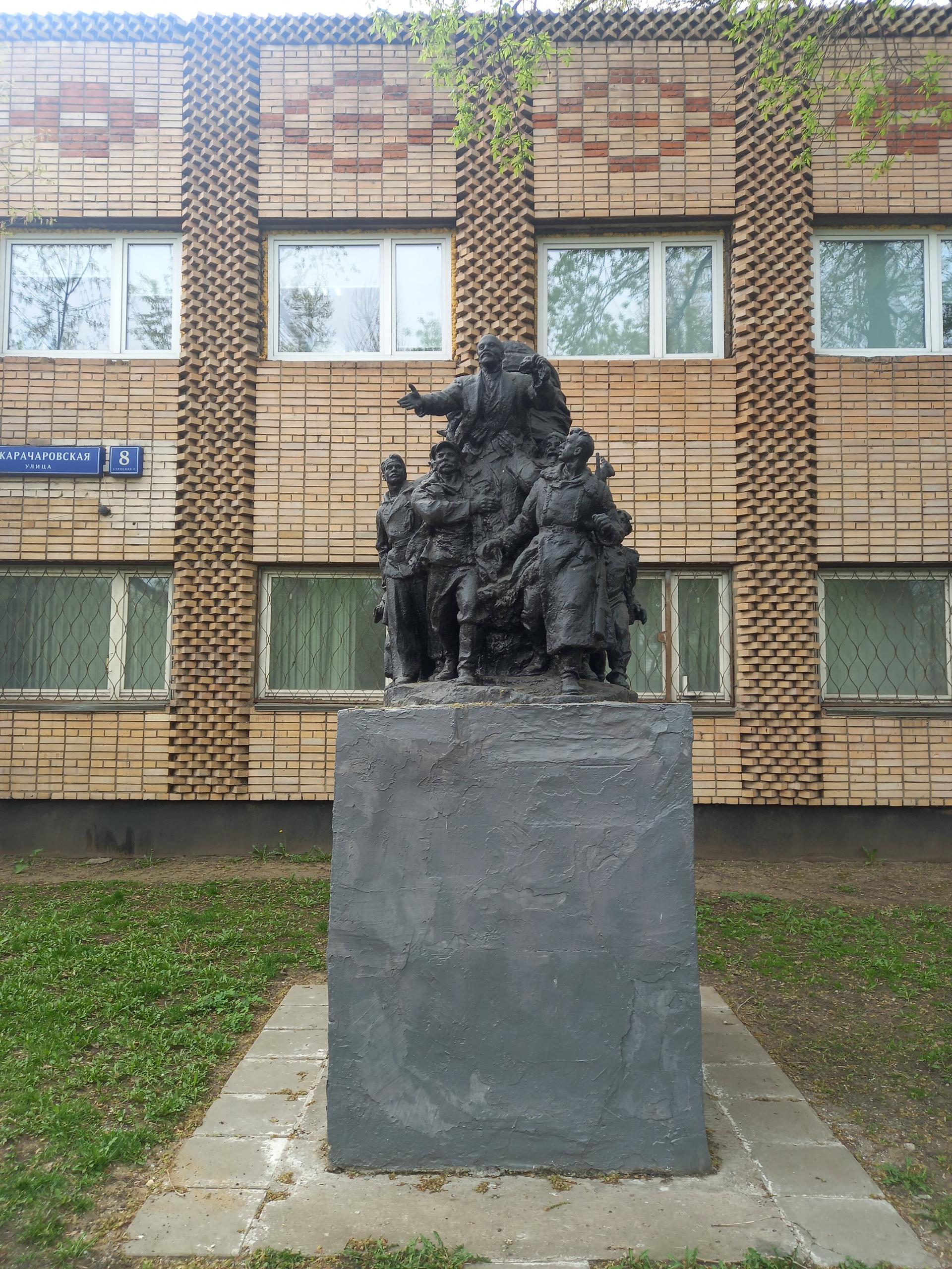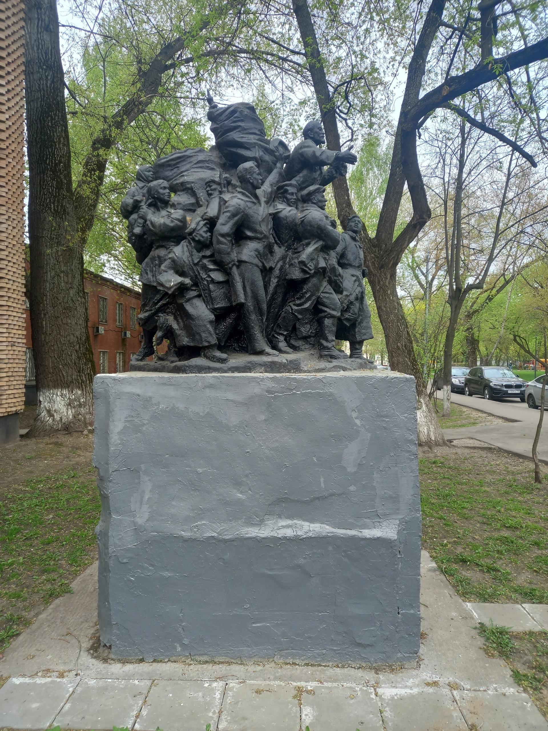 Памятник представляет собой бронзовую многофигурную скульптурную группу, установленную на окрашенном постаменте. Центральное место в композиции занимает фигура Ленина, которого рабочие несут на своих плечах. В левой руке Ленин держит сжатый в кулаке головной убор, правая рука советского деятеля устремлена вперед, выражая революционный порыв. Этой же интонации соответствует настроение рабочих, несущих на плечах своего вождя.