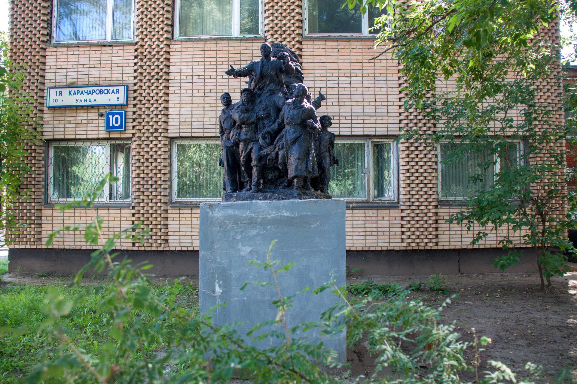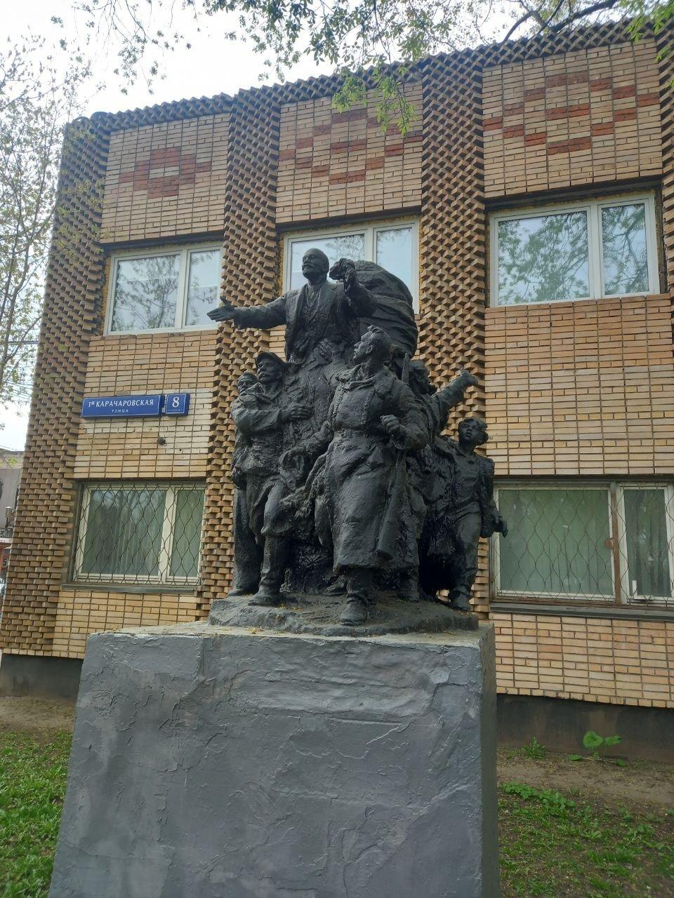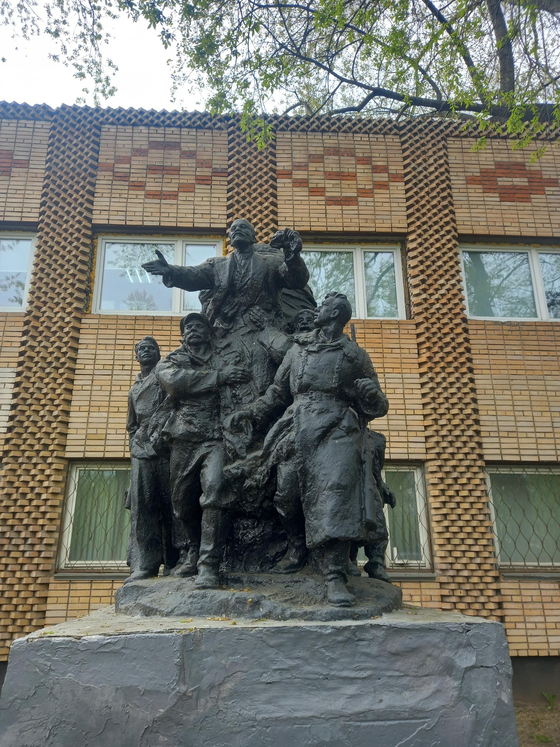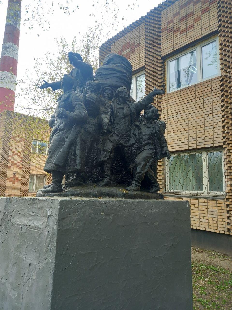 Памятник представляет собой бронзовую многофигурную скульптурную группу, установленную на окрашенном постаменте. Центральное место в композиции занимает фигура Ленина, которого рабочие несут на своих плечах. В левой руке Ленин держит сжатый в кулаке головной убор, правая рука советского деятеля устремлена вперед, выражая революционный порыв. Этой же интонации соответствует настроение рабочих, несущих на плечах своего вождя.