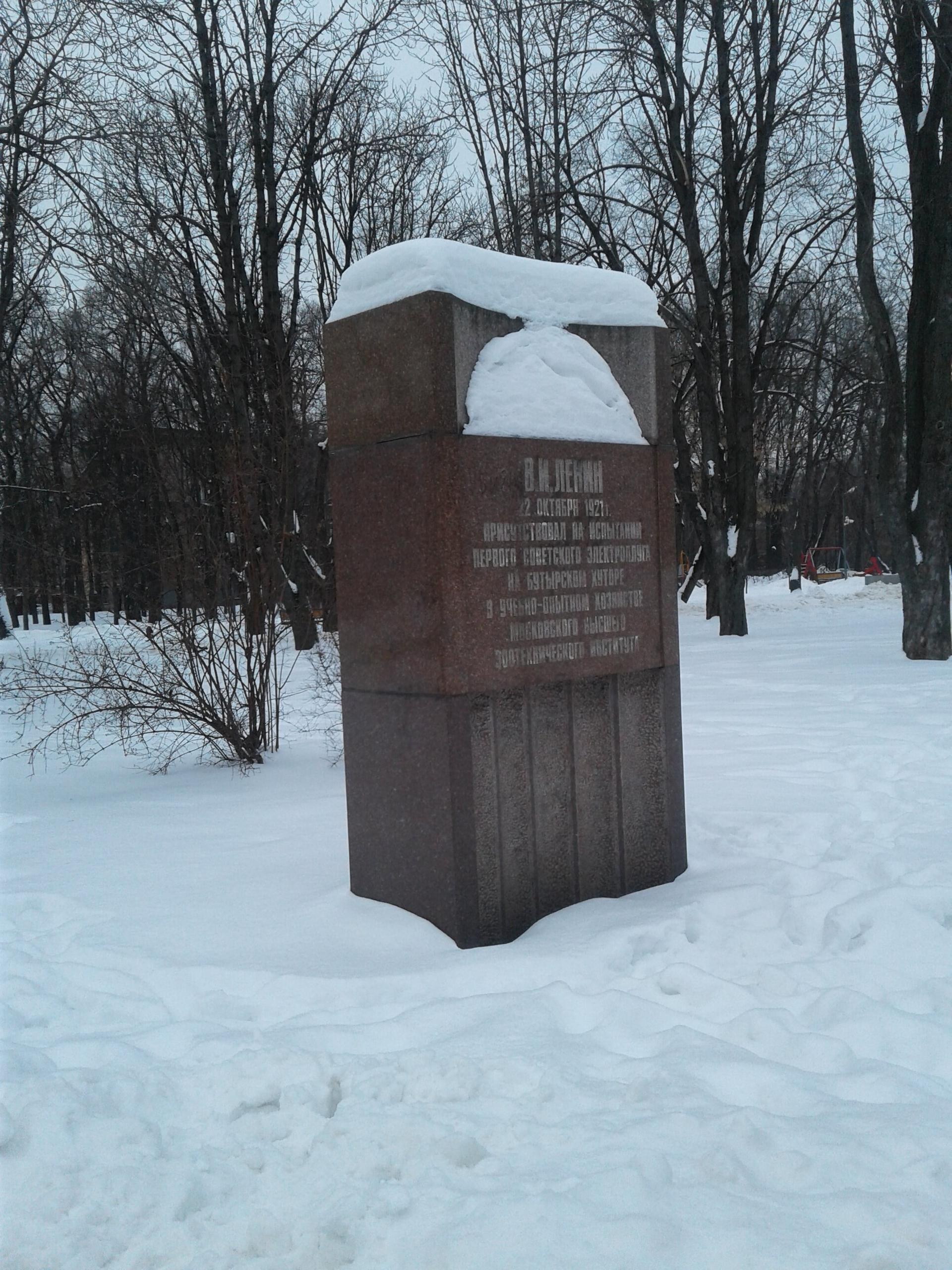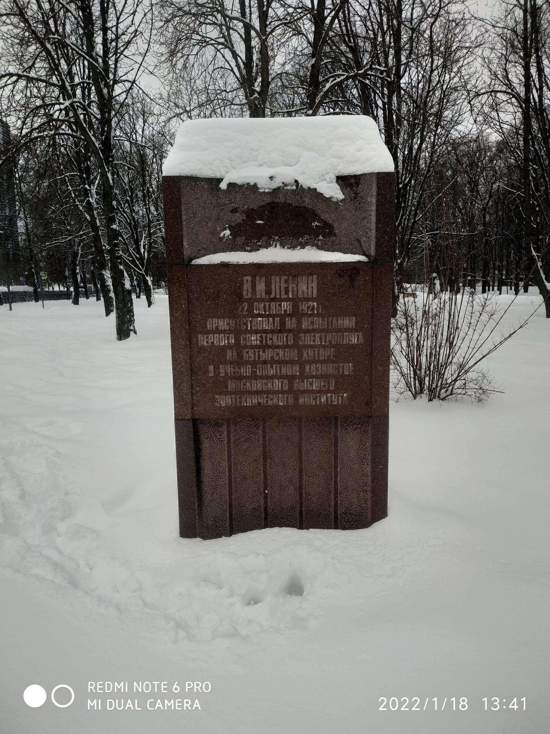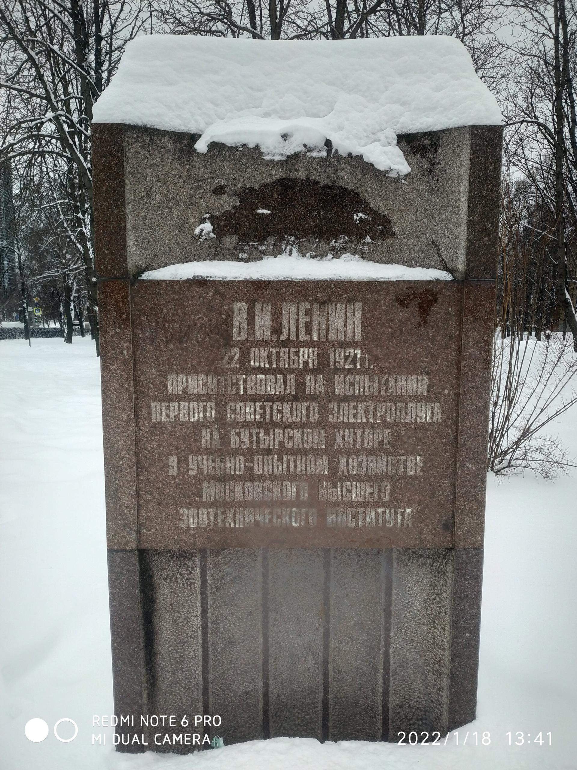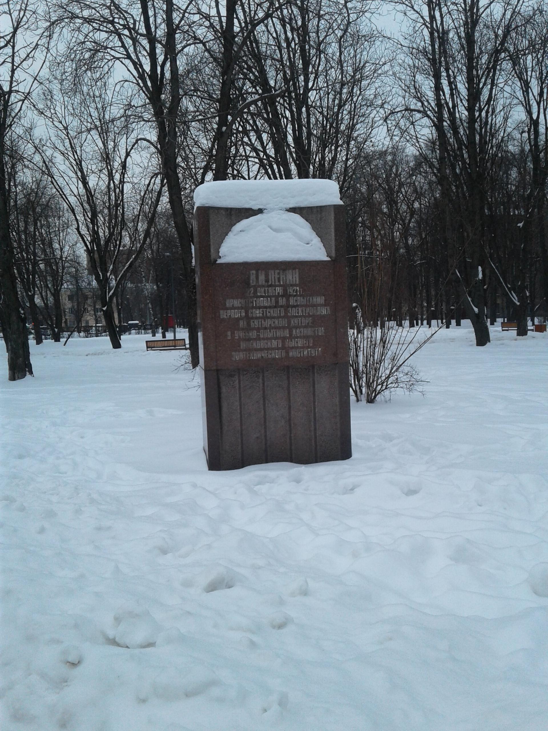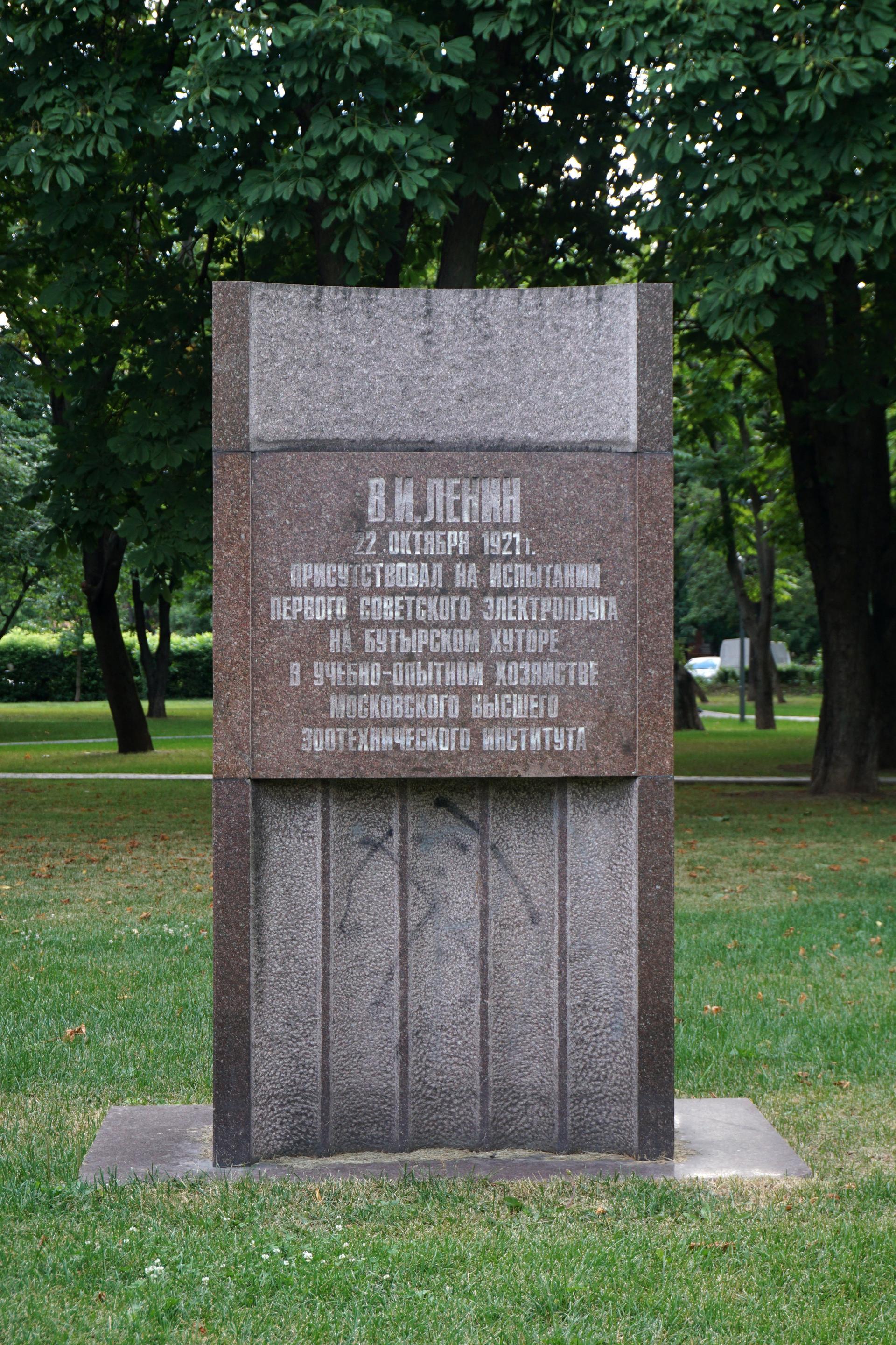 Стела В. И. Ленину установлена в честь посещения им 22 октября 1921 г. находившегося на бывшем Бутырском хуторе опытного хозяйства Высшего зоотехнического института. В тот день на испытаниях первого советского электроплуга вместе с Лениным присутствовали Н. К. Крупская, М. И. Ульянова и М. И. Калинин.