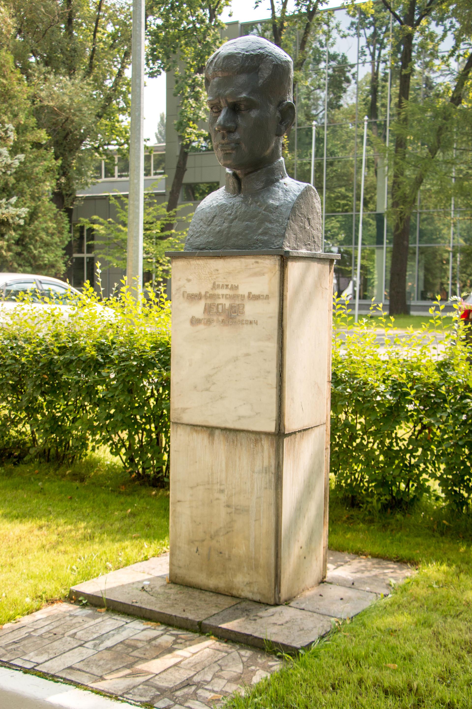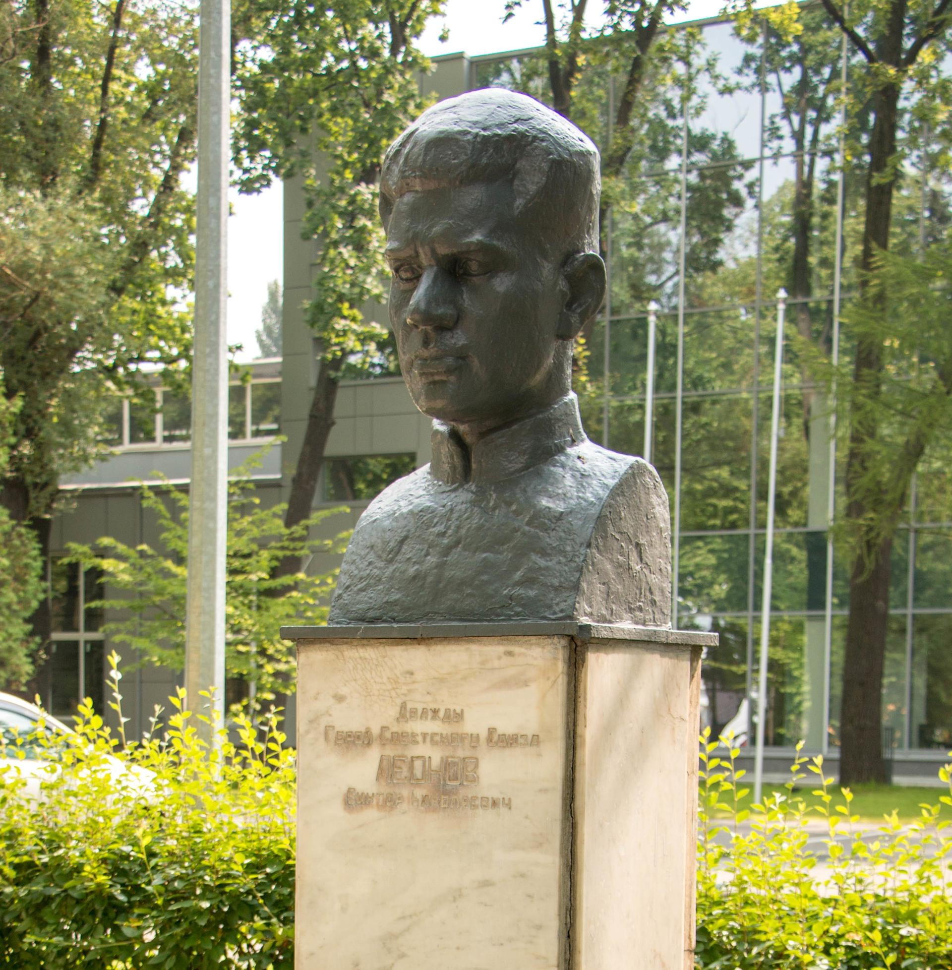 Погрудный бюст на высоком постаменте. Исполнен из чугуна, покра-шен серой краской. Постамент облицован мраморными плитами. Памятная надпись на северной стороне постамента: «Герой Советского Союза Леонов Виктор Николаевич».