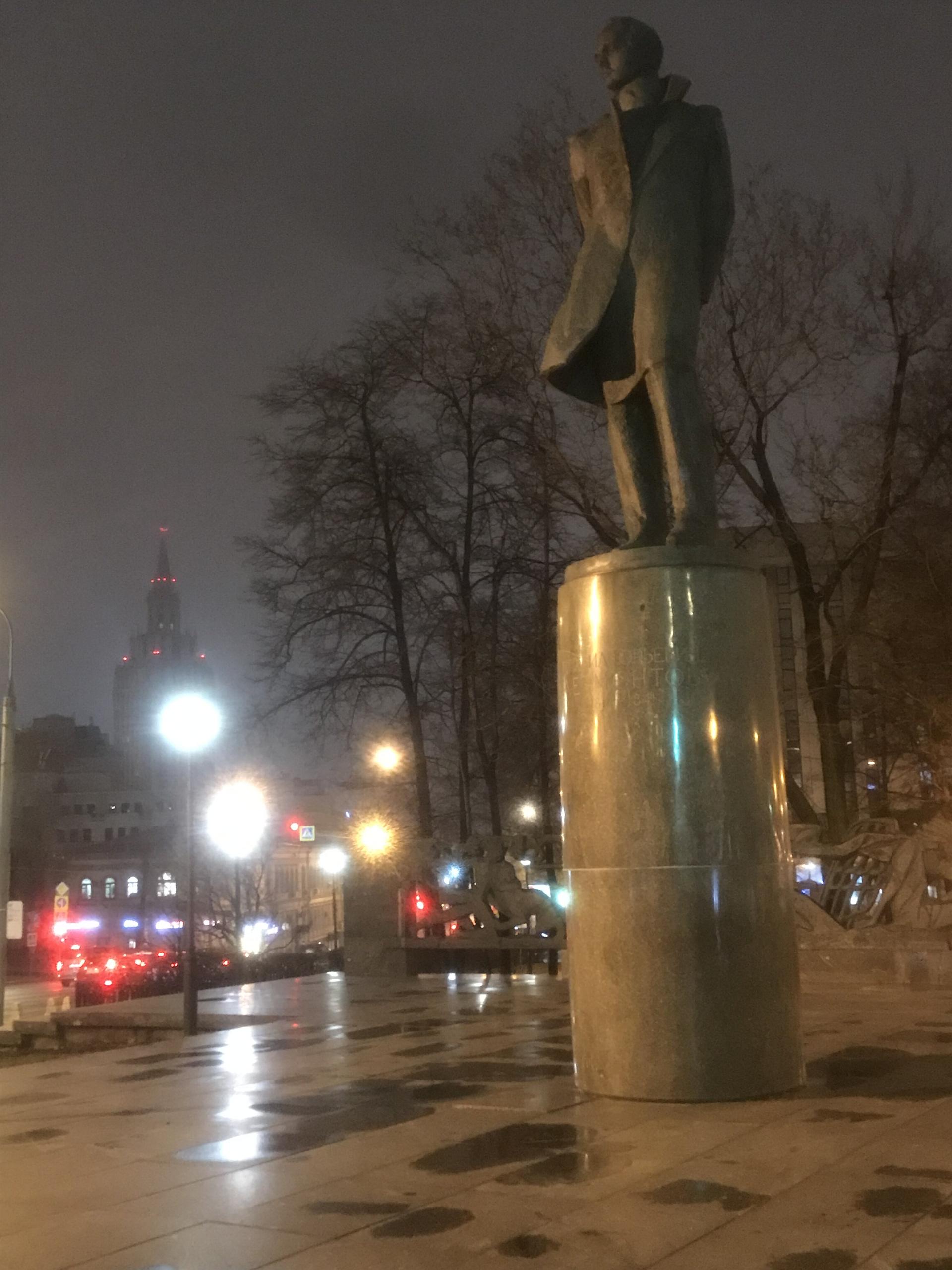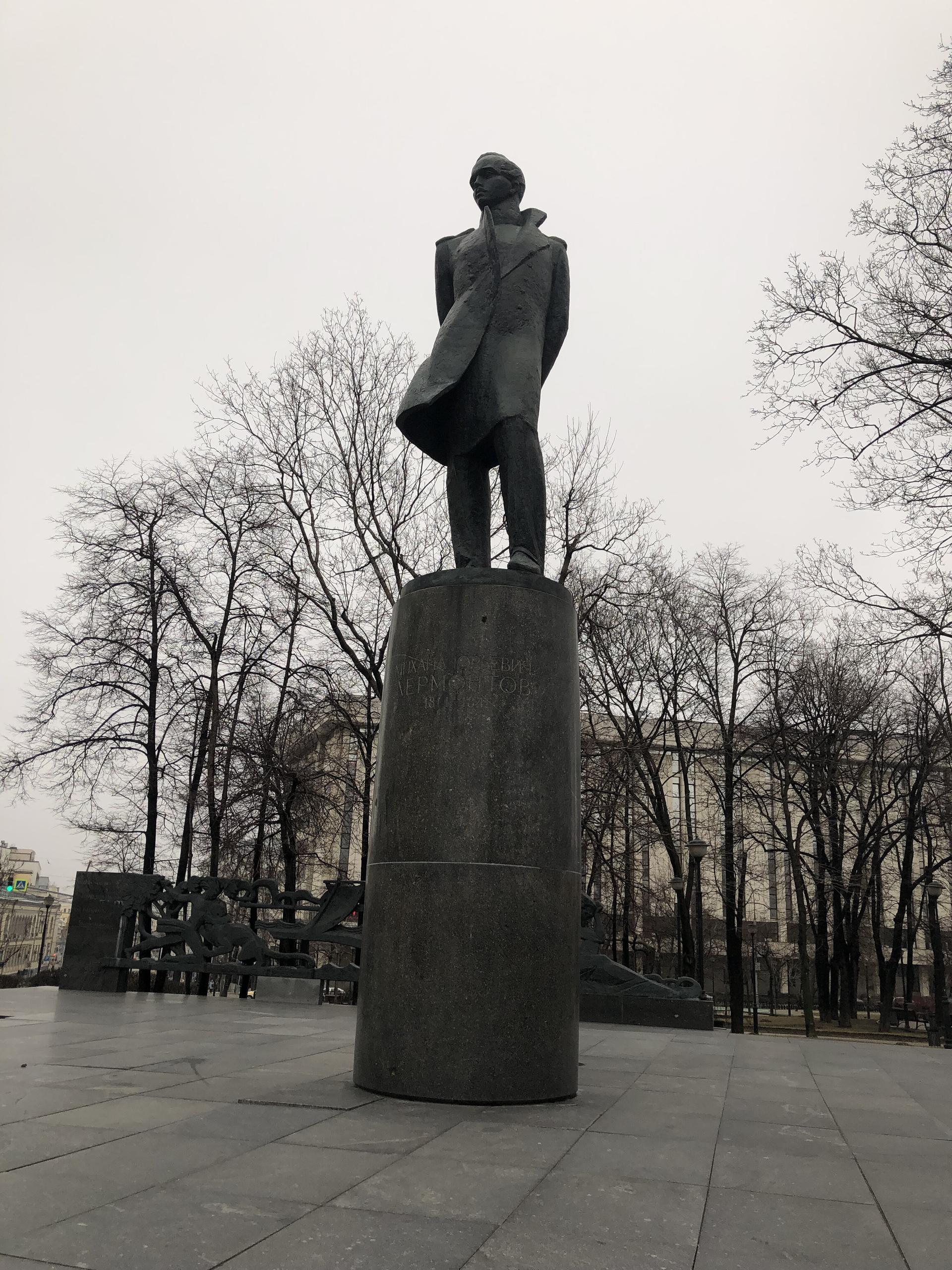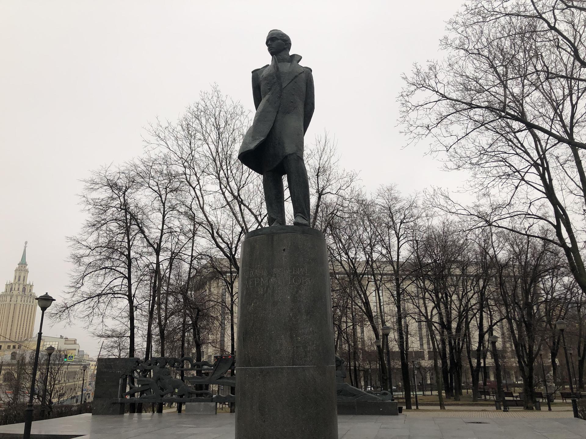 Поэт будто, задумавшись, стоит на одной из вершин Кавказских гор, а ветер развевает полы шинели. В композицию памятника Лермонтову входят ажурные рельефы с образами романтических произведений поэта — «Мцыри», «Парус», «Демон».