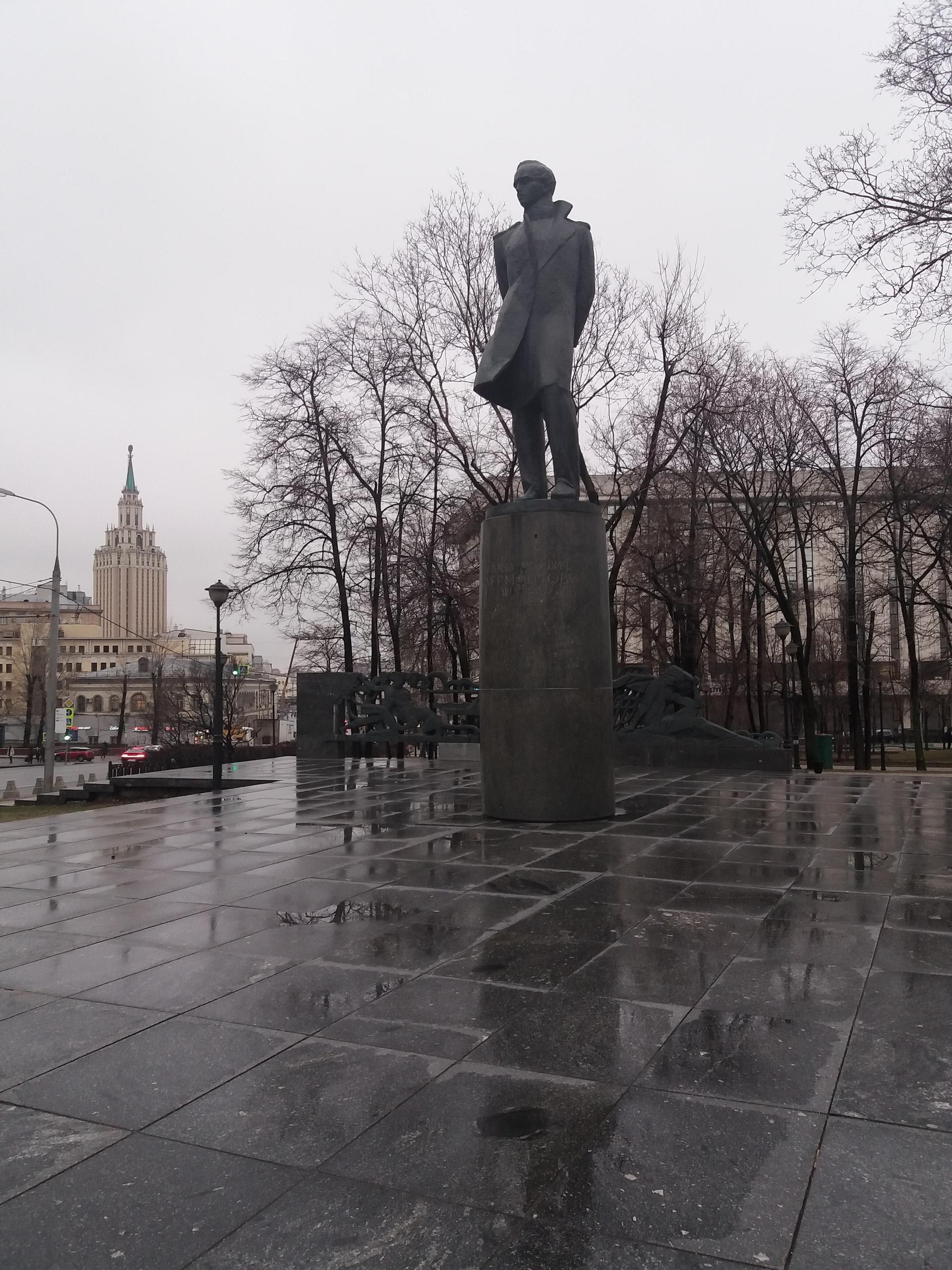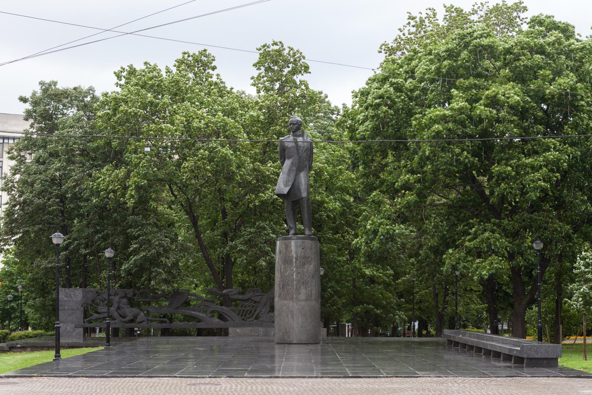 Поэт будто, задумавшись, стоит на одной из вершин Кавказских гор, а ветер развевает полы шинели. В композицию памятника Лермонтову входят ажурные рельефы с образами романтических произведений поэта — «Мцыри», «Парус», «Демон».