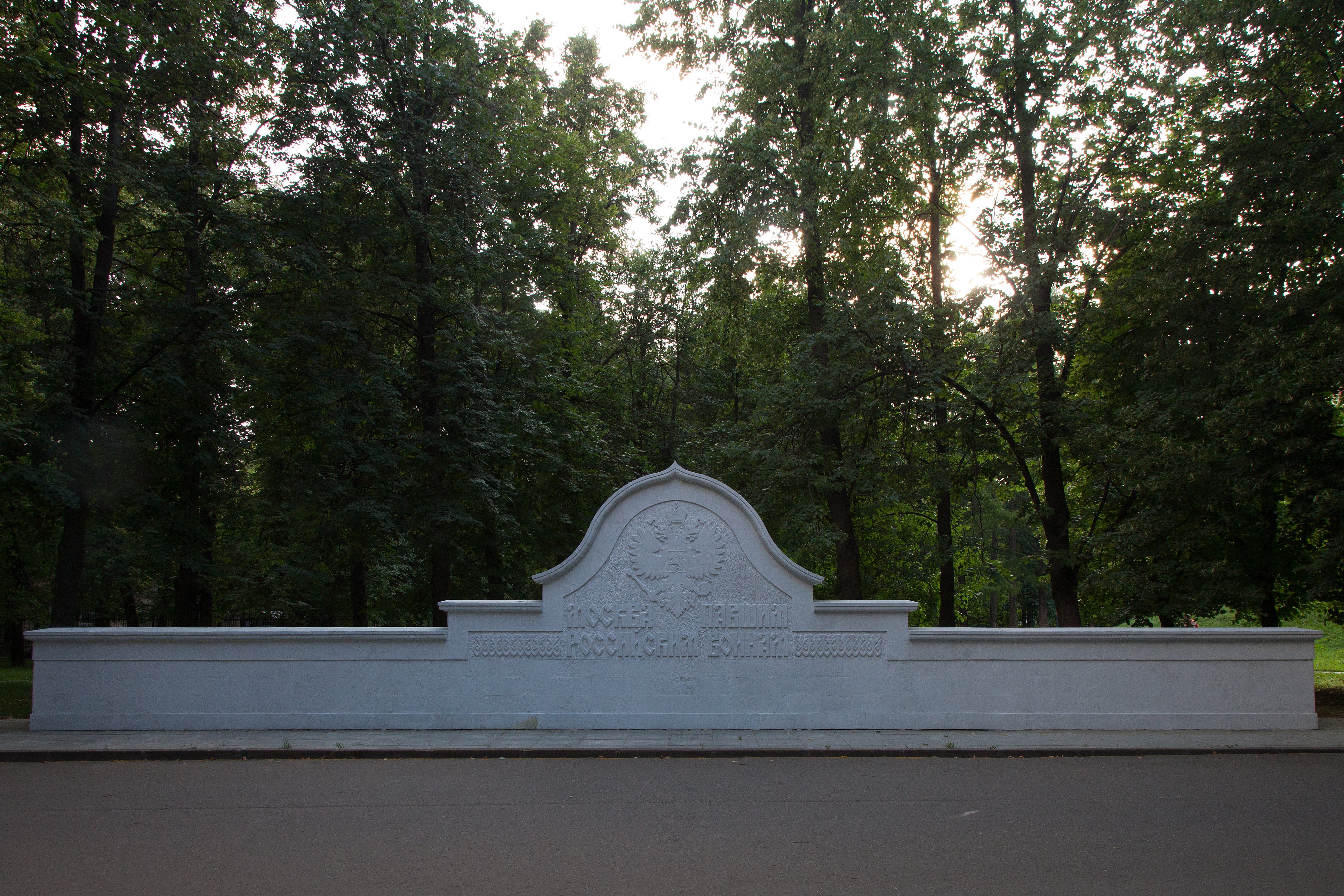 Мемориальная стена установлена у главного входа в Мемориально-парковый комплекс героев Первой мировой войны. Находится на центральной аллее парка неподалеку от обелиска «Павшим за свободу и независимость Родины». На лицевой части находится барельеф в виде двуглавого орла и надпись: «Москва павшим российским воинам». В темное время суток мемориал подсвечивается.