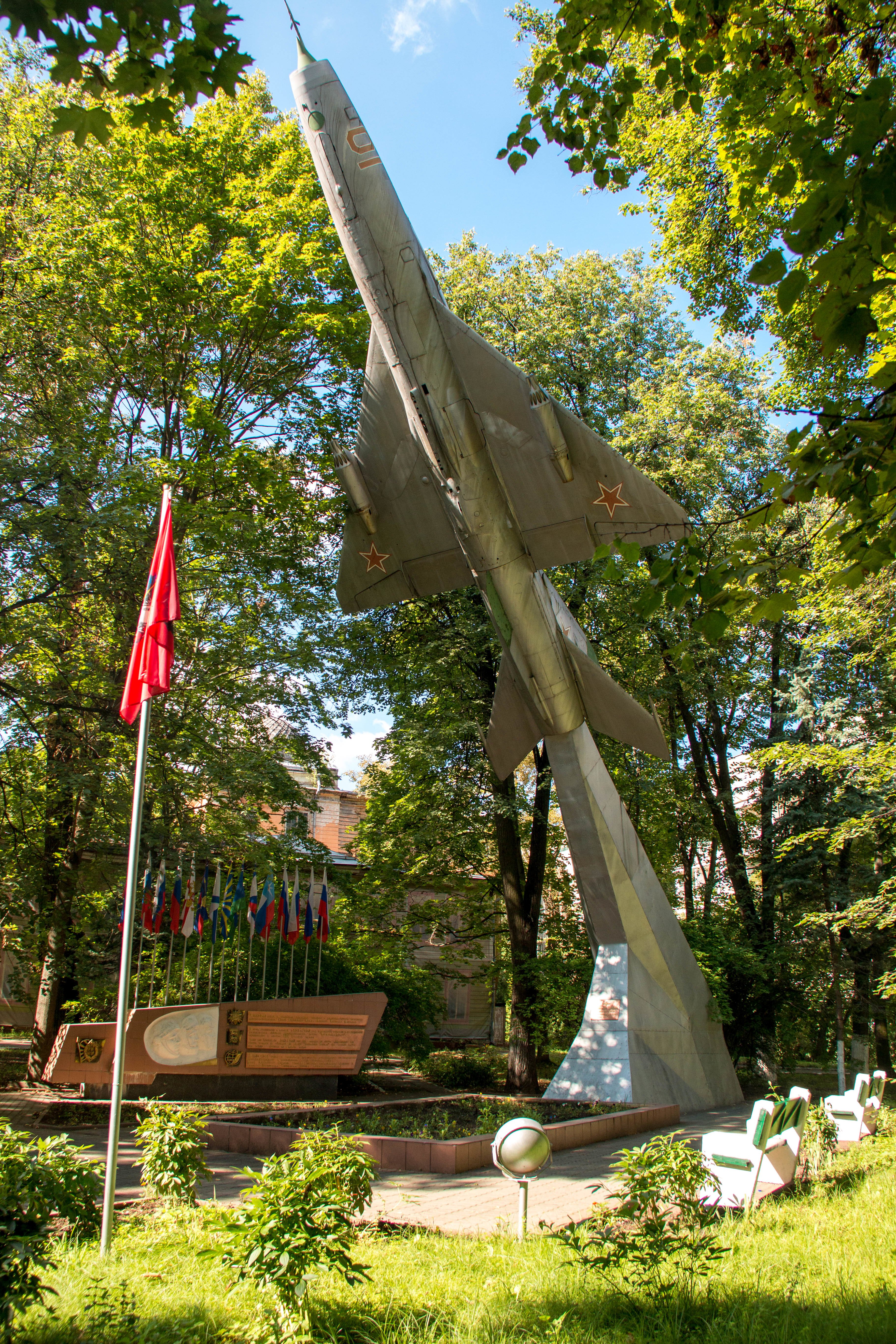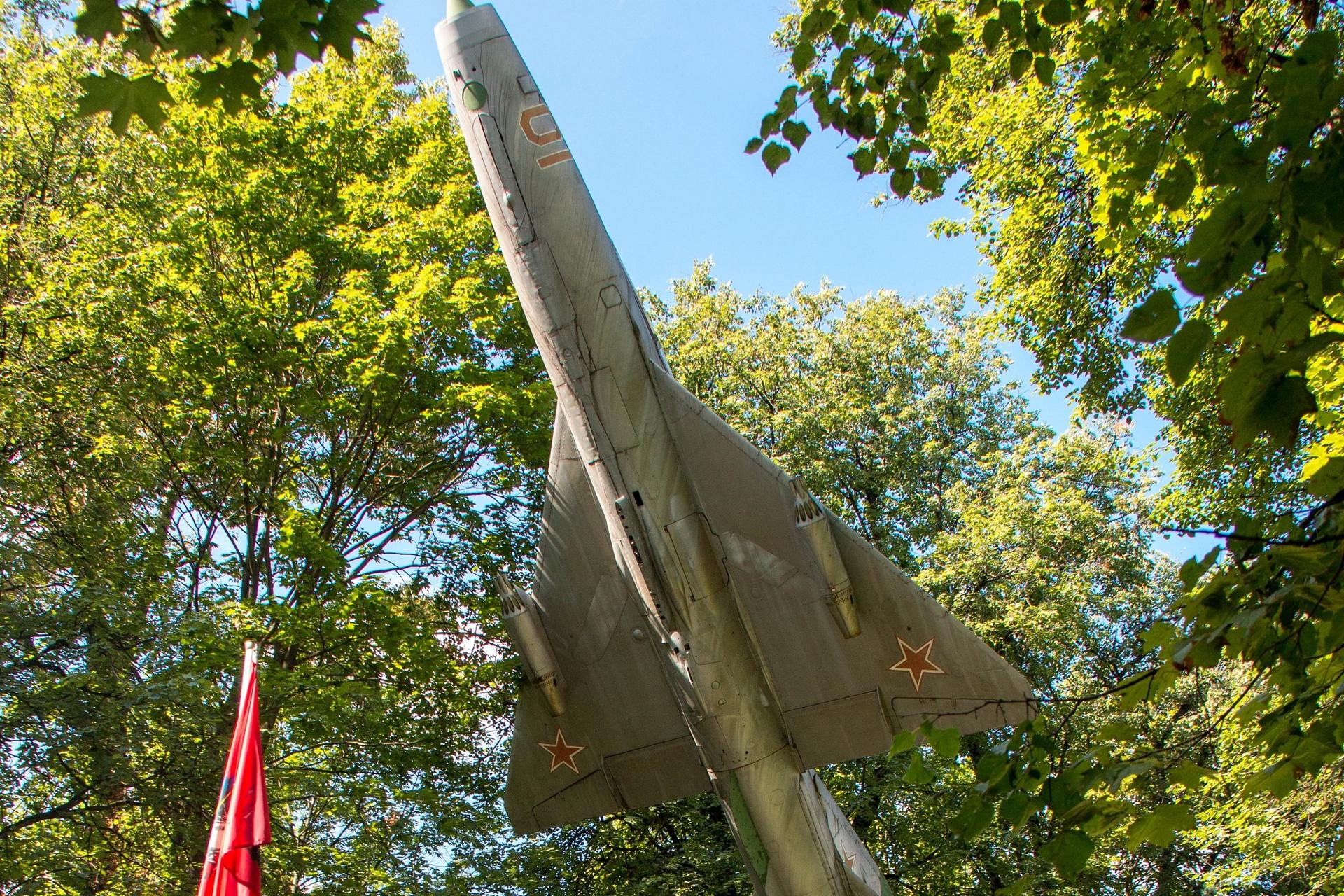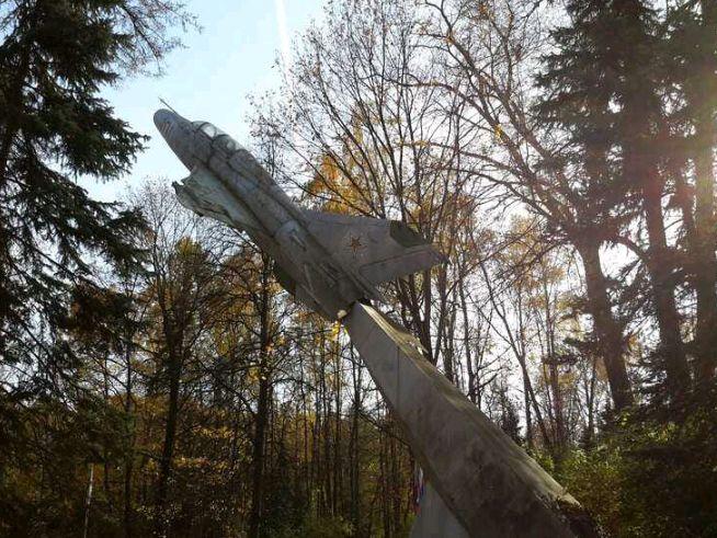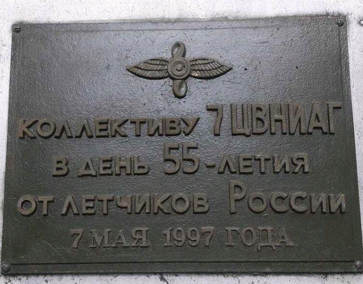 Памятник является мемориальным комплексом. Главным элементом ком-позиции мемориала служит памятник самолету МиГ-21, выполненный из металла и установленный на постаменте сложной конфигурации, облицованном листовым металлом. С фронтальной стороны на постаменте укреплена металлическая мемориальная табличка, на которой объемными буквами исполнена цельнолитая посвятительная надпись: «Коллективу 7 ЦВНИАГ в день 55-летия от летчиков России. 7 мая 1997 г.».