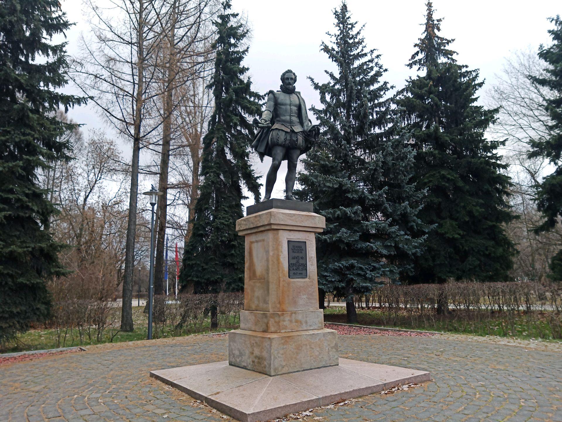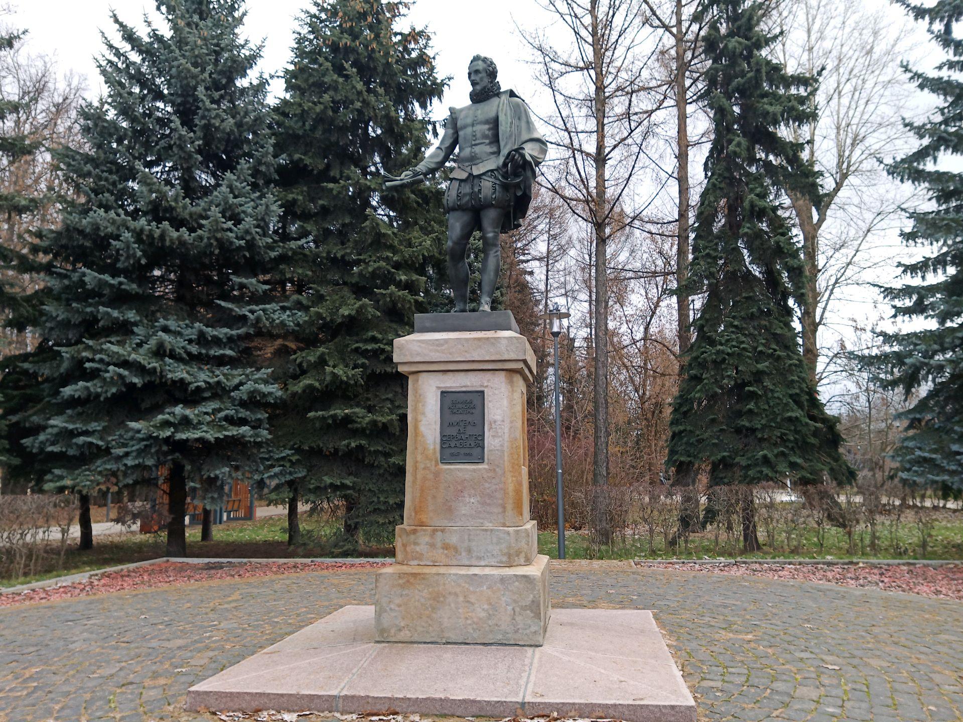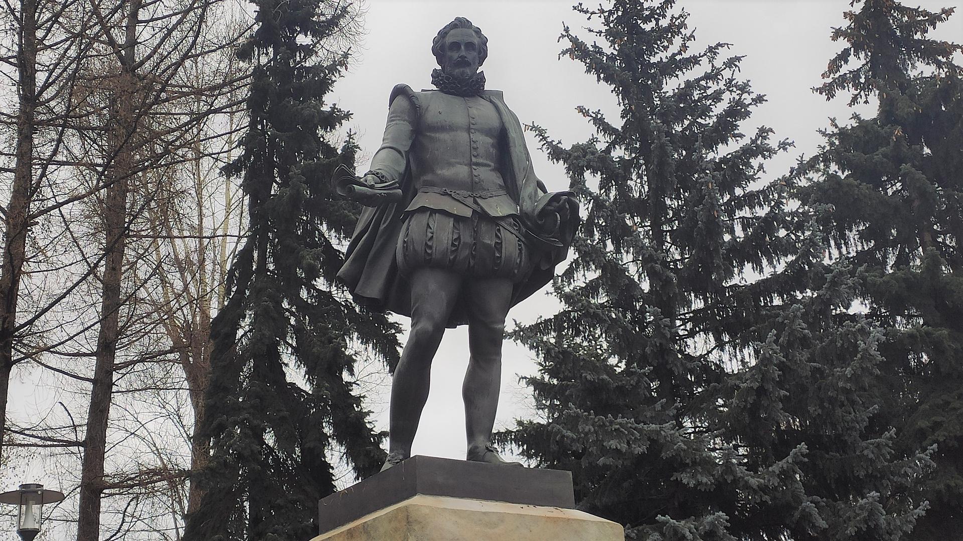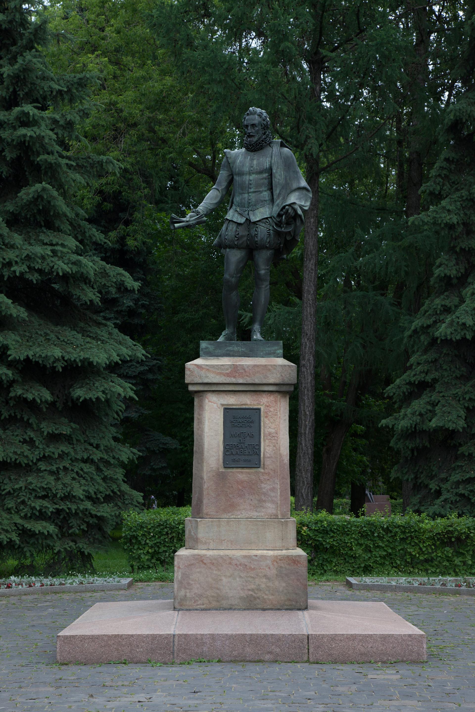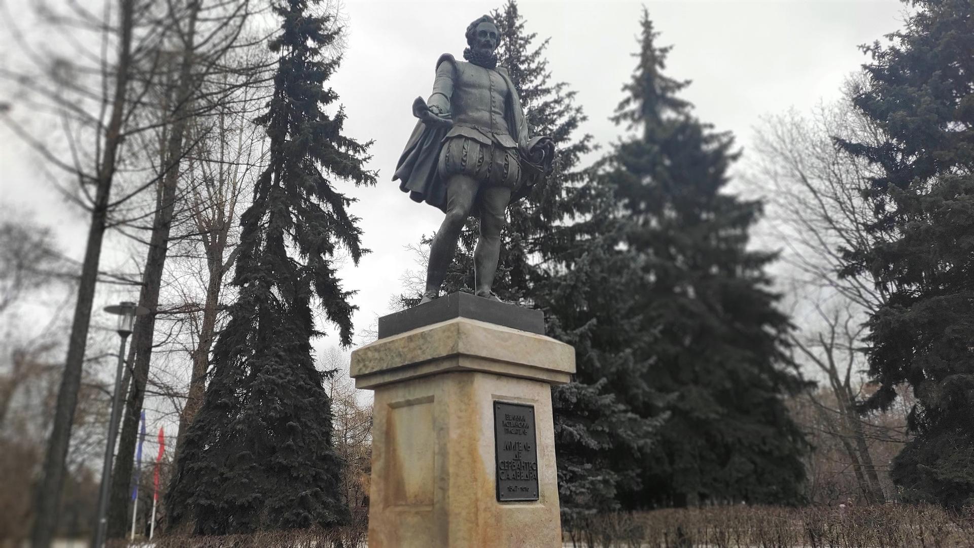 Памятник на Фестивальной улице является даром испанского народа, это копия мадридского оригинала работы скульптора А. Сола. Сервантес изображен в благородном парадном одеянии рыцаря. Реставрационные работы на объекте проводились в 2016 г.