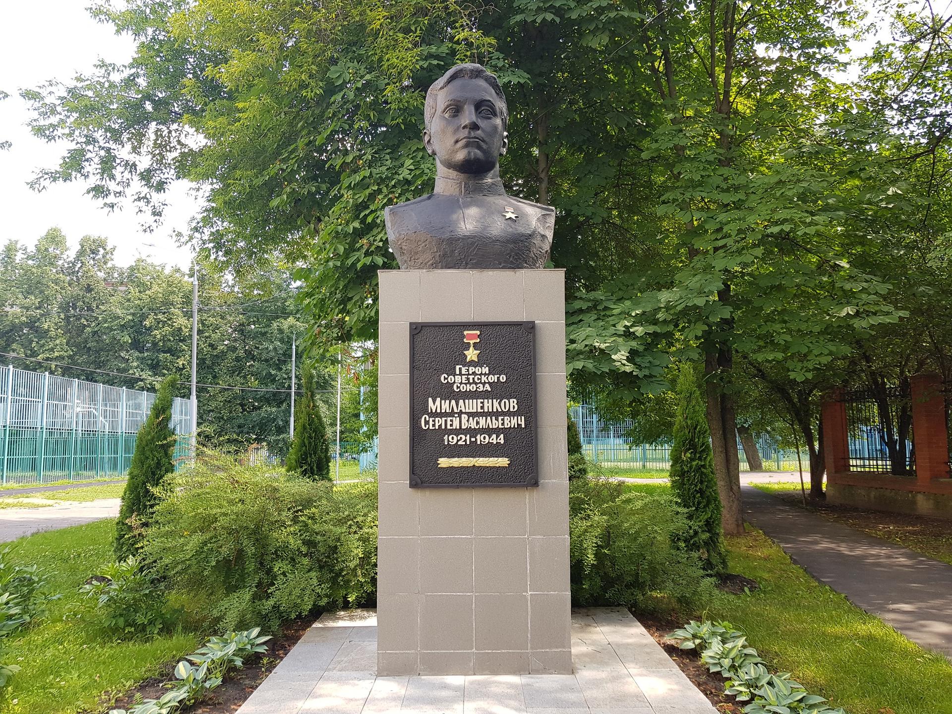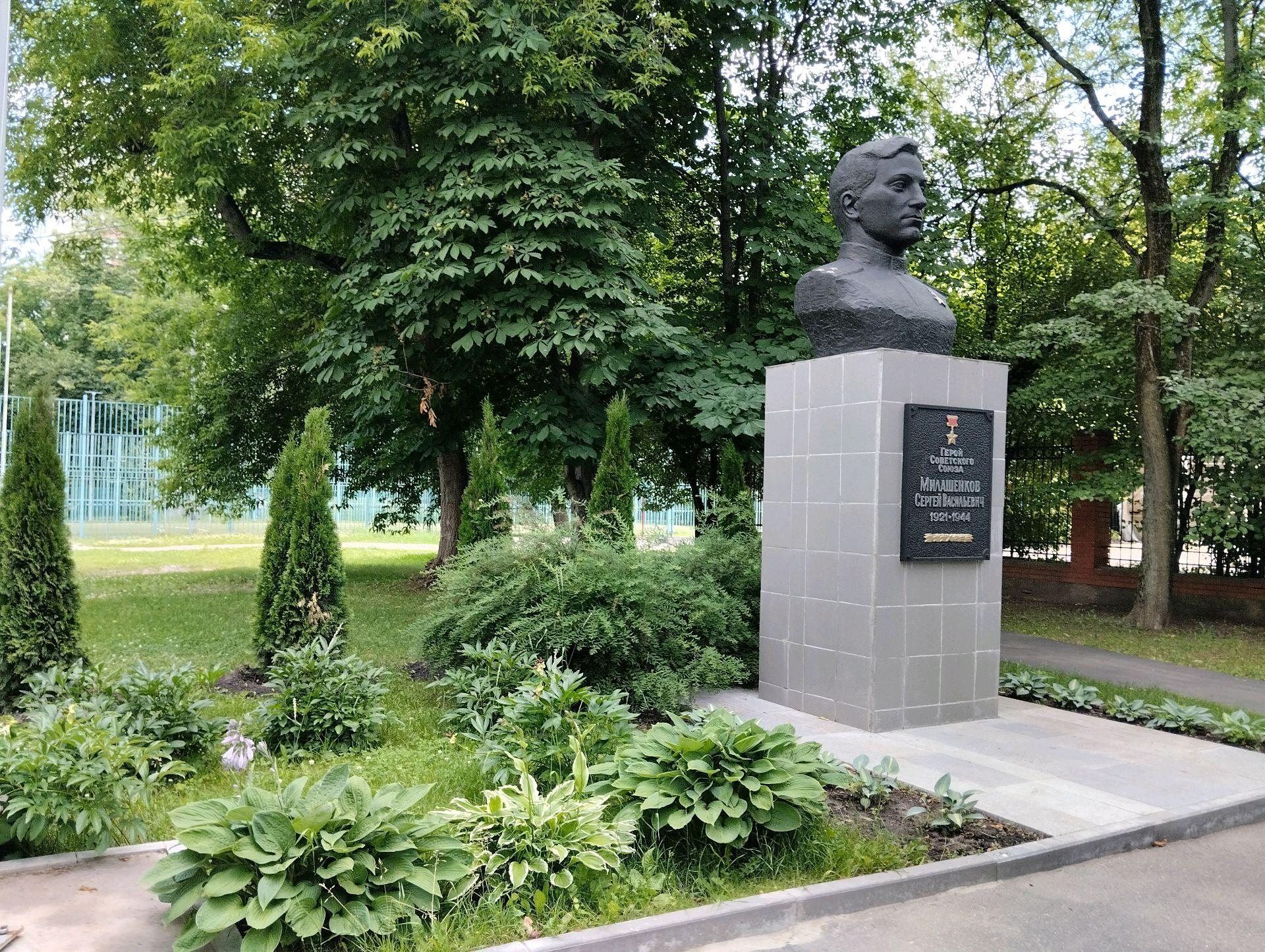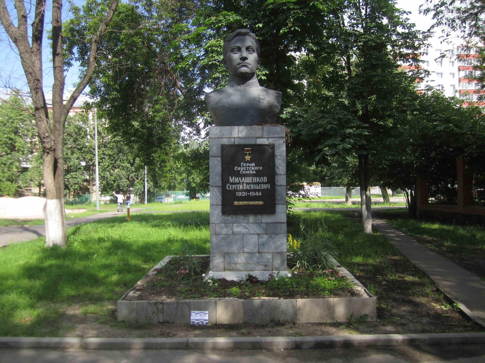 Памятник представляет собой бюст из бетона, установленный на постаменте, облицованном мрамором, и основании, отделанном керамической плиткой. На лицевой стороне постамента закреплена мемориальная табличка из бетона с цельнолитой надписью, буквы которой окрашены в серебряный цвет: «Герой Советского Союза Милашенков Сергей Васильевич. 1921—1944».