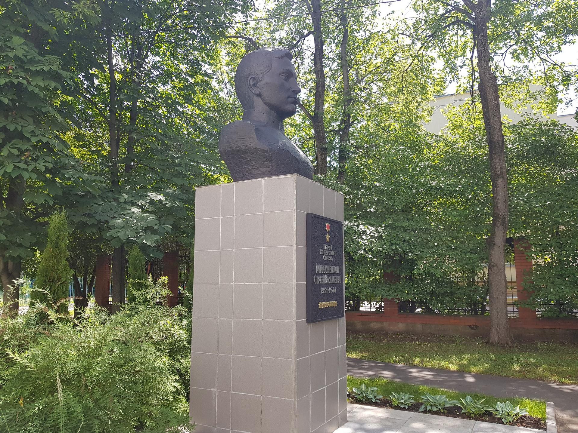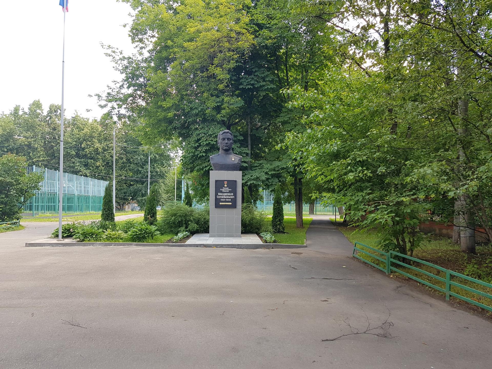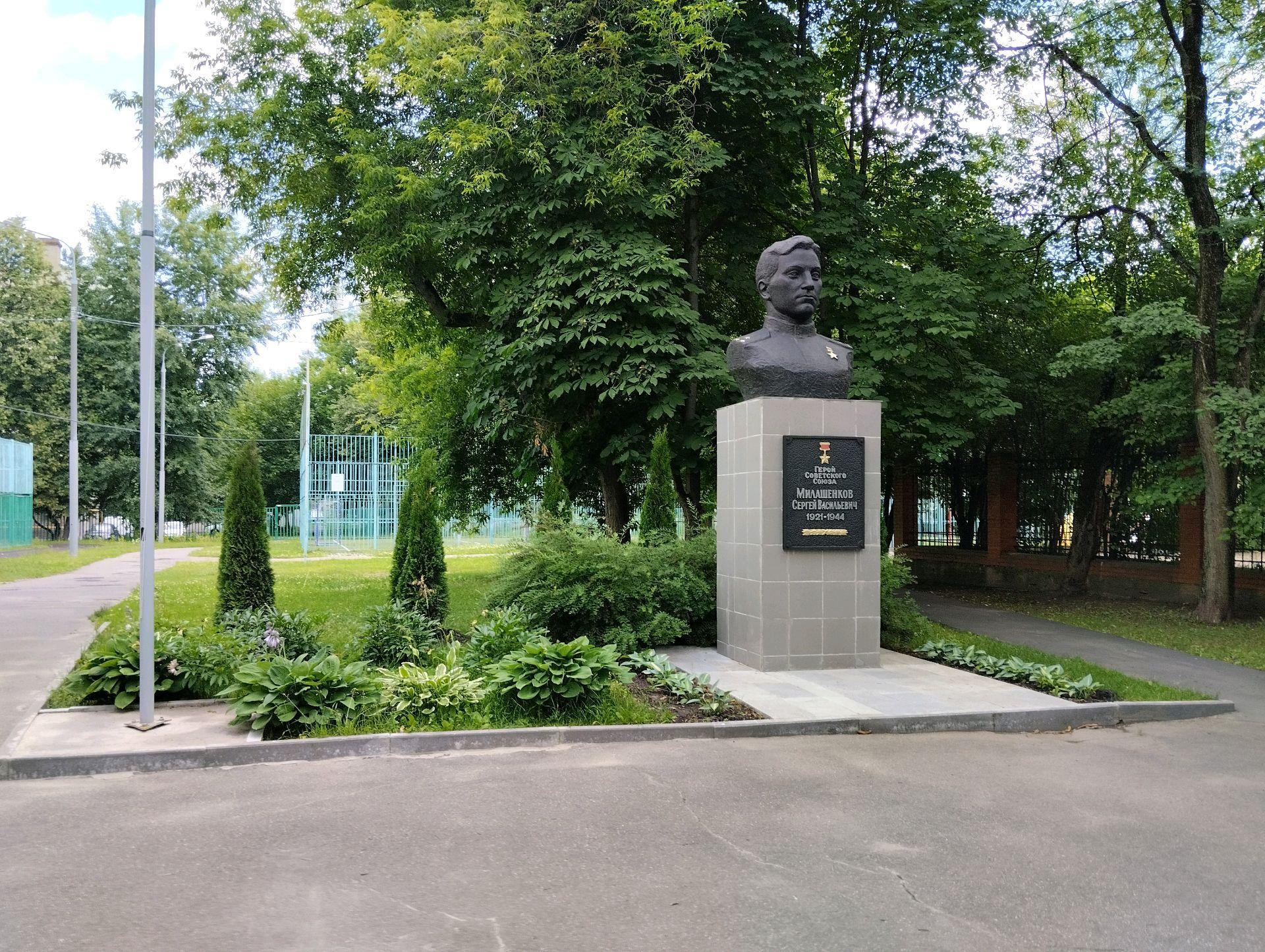 Памятник представляет собой бюст из бетона, установленный на постаменте, облицованном мрамором, и основании, отделанном керамической плиткой. На лицевой стороне постамента закреплена мемориальная табличка из бетона с цельнолитой надписью, буквы которой окрашены в серебряный цвет: «Герой Советского Союза Милашенков Сергей Васильевич. 1921—1944».