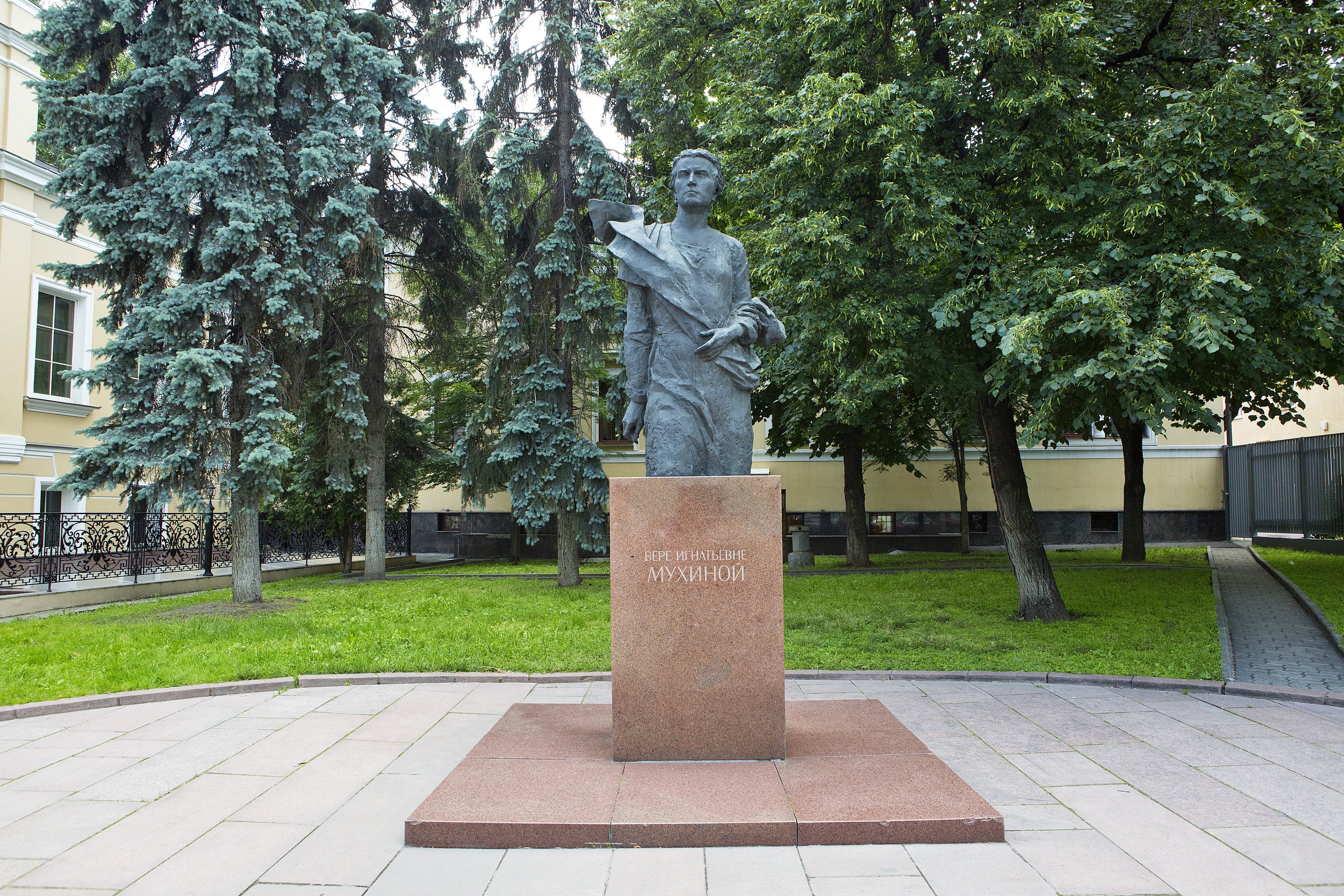 Памятник скульптору В. И. Мухиной был открыт к 100-летию со дня ее рождения. Скульптура выполнена из бронзы, а пьедестал — из красного гранита. На постаменте надпись: «Вере Игнатьевне Мухиной». Скульптур изобразил женщину средних лет. Фигура поколенная, голова поднята и повернута влево. Лицо спокойное и серьезное. Дом, на фоне которого установлен памятник, спроектирован в 1947 г. самой Мухиной, где она прожила несколько лет до самой смерти.