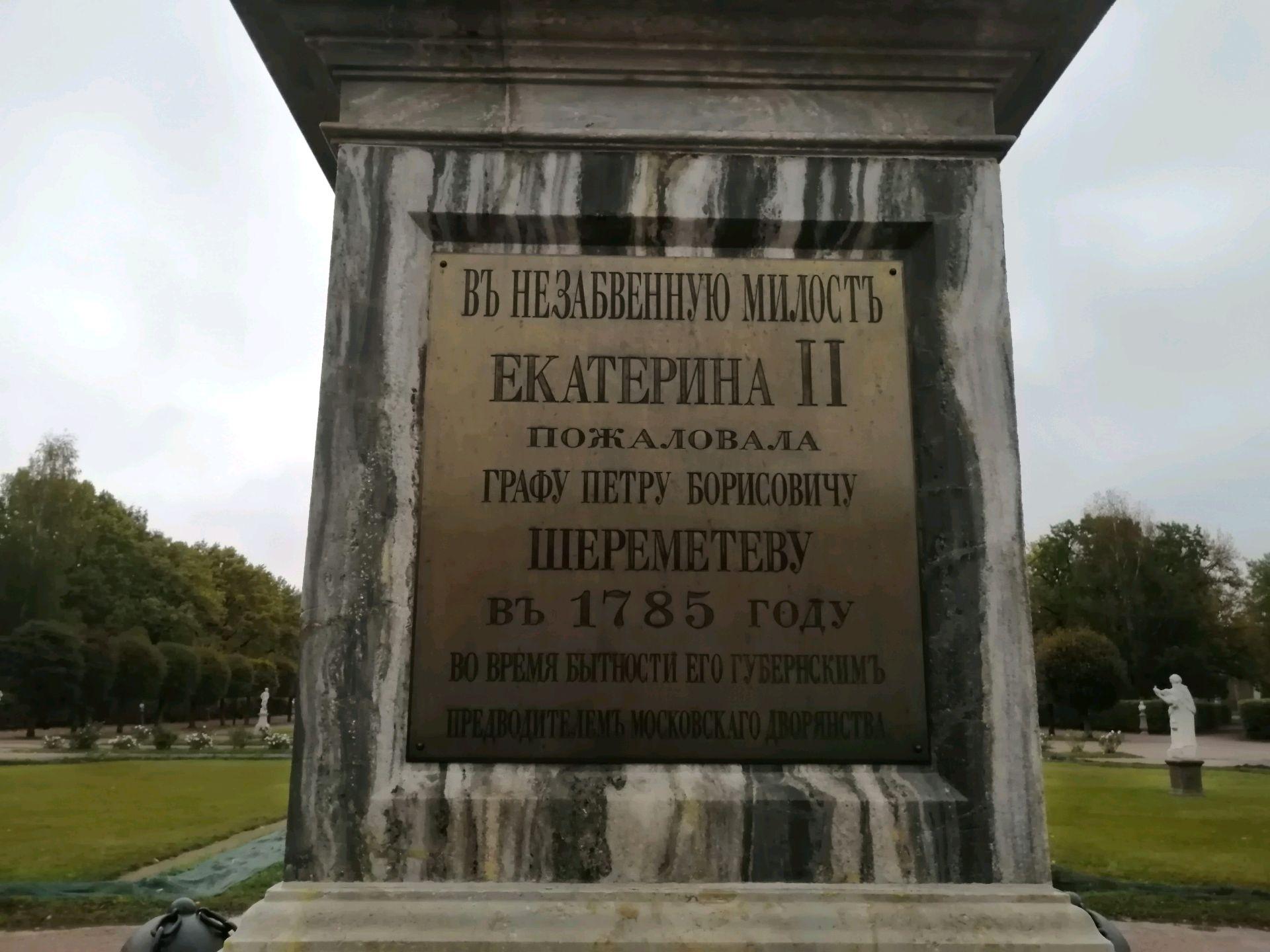 Обелиск был выполнен из мрамора, дарованного Екатериной II. Надпись на Обелиске гласит: «Екатерина II пожаловала графу Петру Борисовичу Шереметеву в 1785 году во время бытности его губернским предводителем Московского дворянства».