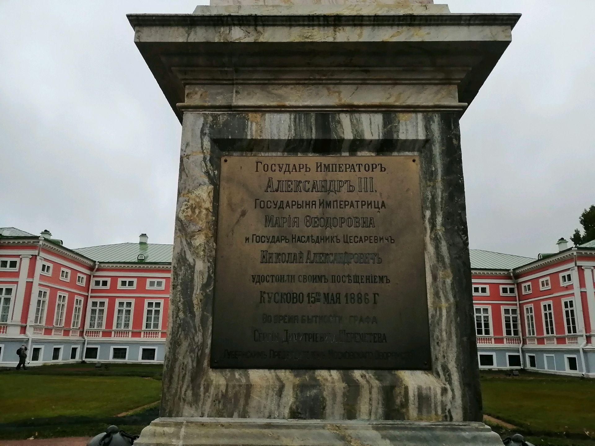 Таким образом, образцом для кусковского послужил царскосельский Кагульский обелиск. Сохранились старинные фотографии начала XXв., где дети последнего хозяина усадьбы С.Д.Шереметева позируют на фоне этого обелиска.