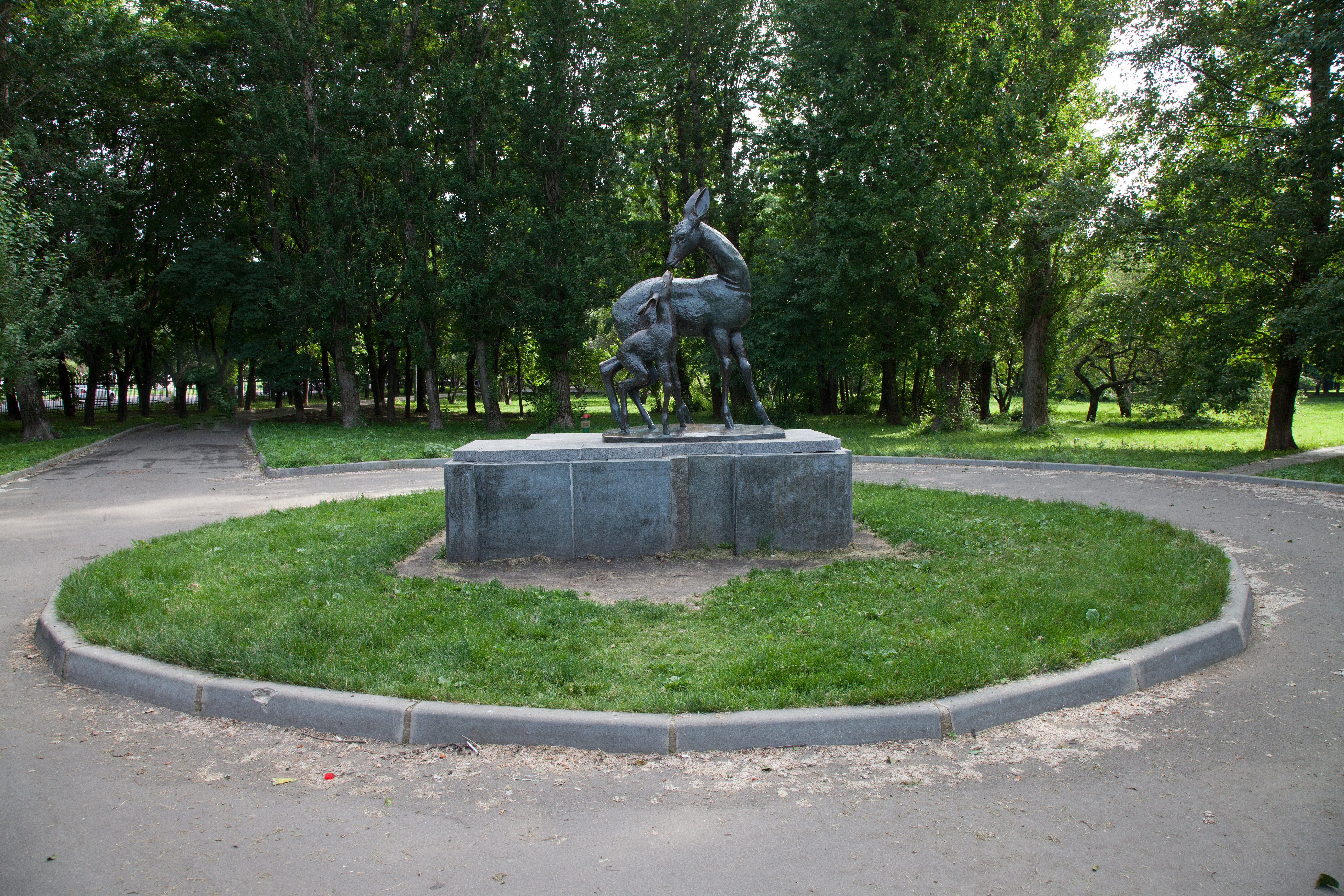 Выполненная в бронзе скульптурная композиция изображает оленя с олененком. Скульптурная группа установлена на высоком постаменте, облицованном полированными гранитными плитами. На бронзовом плинте имеется авторская подпись: «Белашов 76».