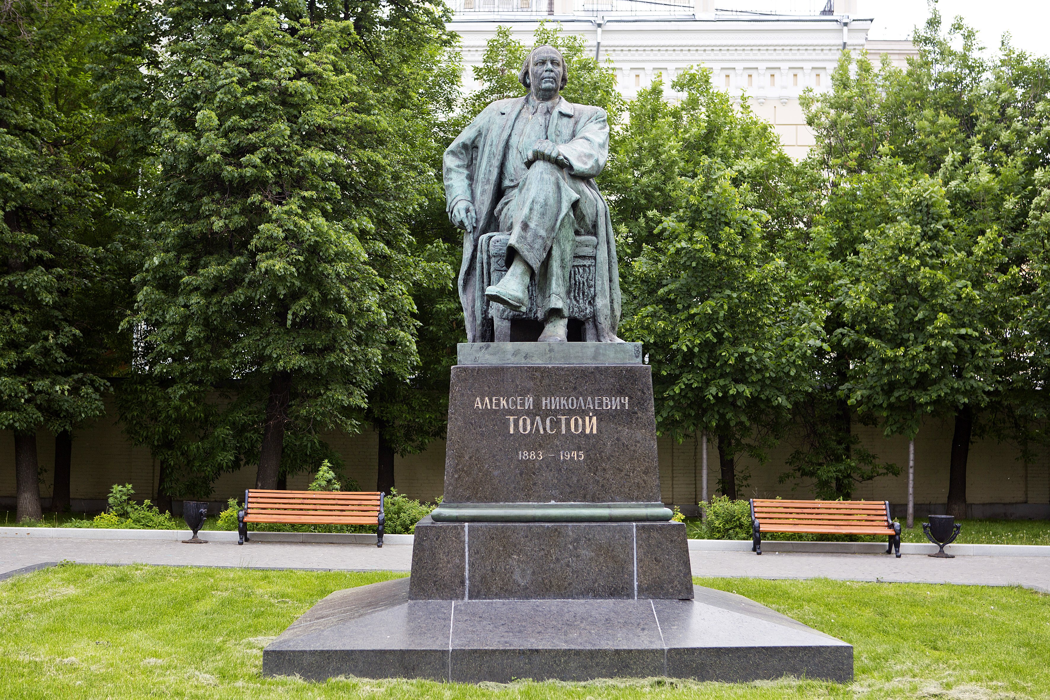 Памятник установлен вблизи дома по улице Спиридоновке, где писатель провел последние годы своей жизни. Алексей Николаевич увековечен в довольно традиционном для писателя образе — задумчиво сидящим в кресле с блокнотом и карандашом в руках. Реставрационные работы на объекте проводились в 2000 г.
