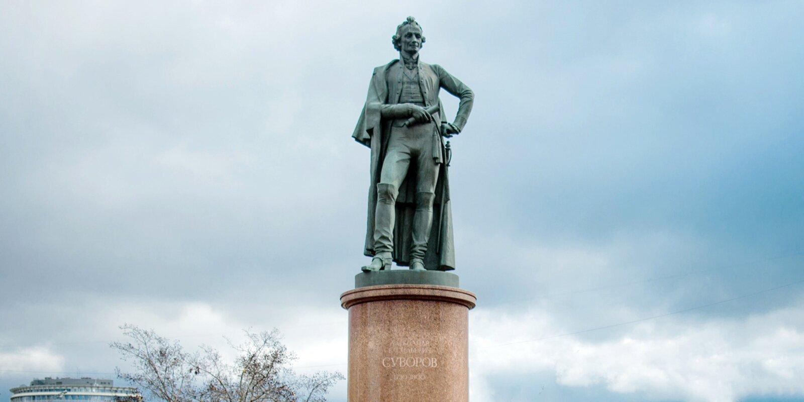 Памятник был открыт в 250-летний юбилей со дня рождения полководца. Представляет собой бронзовую фигуру Суворова в полный рост. Полководец одет в мундир и плащ, в правой руке держит подзорную трубу. Суворов изображен с орденом Святой Анны. Длинный походный плащ придает фигуре устойчивость и монументальность.