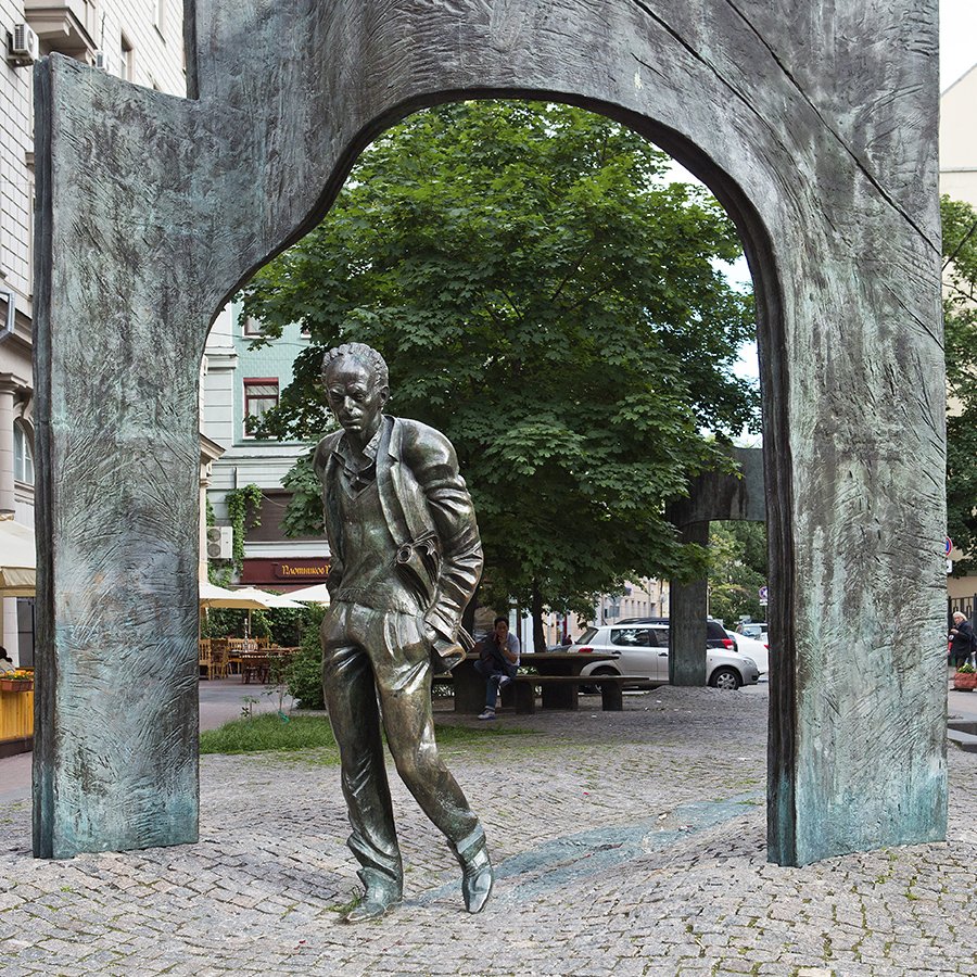 Булат Шалвович Окуджава (1924—1997) — поэт, бард, прозаик, сценарист, композитор. Автор более 200 песен, написанных на собственные стихи, яркий представитель авторской песни в 1950-1980-е гг. Решение о создании памятника, увековечивающего память Булата Окуджавы, было принято через неделю после его смерти. Б. Ельцин лично подписал соответствующий приказ. Открытие памятника было приурочено ко Дню Победы и дню рождения барда. Окуджава родился 9 мая 1924 г., в 1942 г. ушел добровольцем на фронт, был ранен, в 1944-м демобилизован по состоянию здоровья.