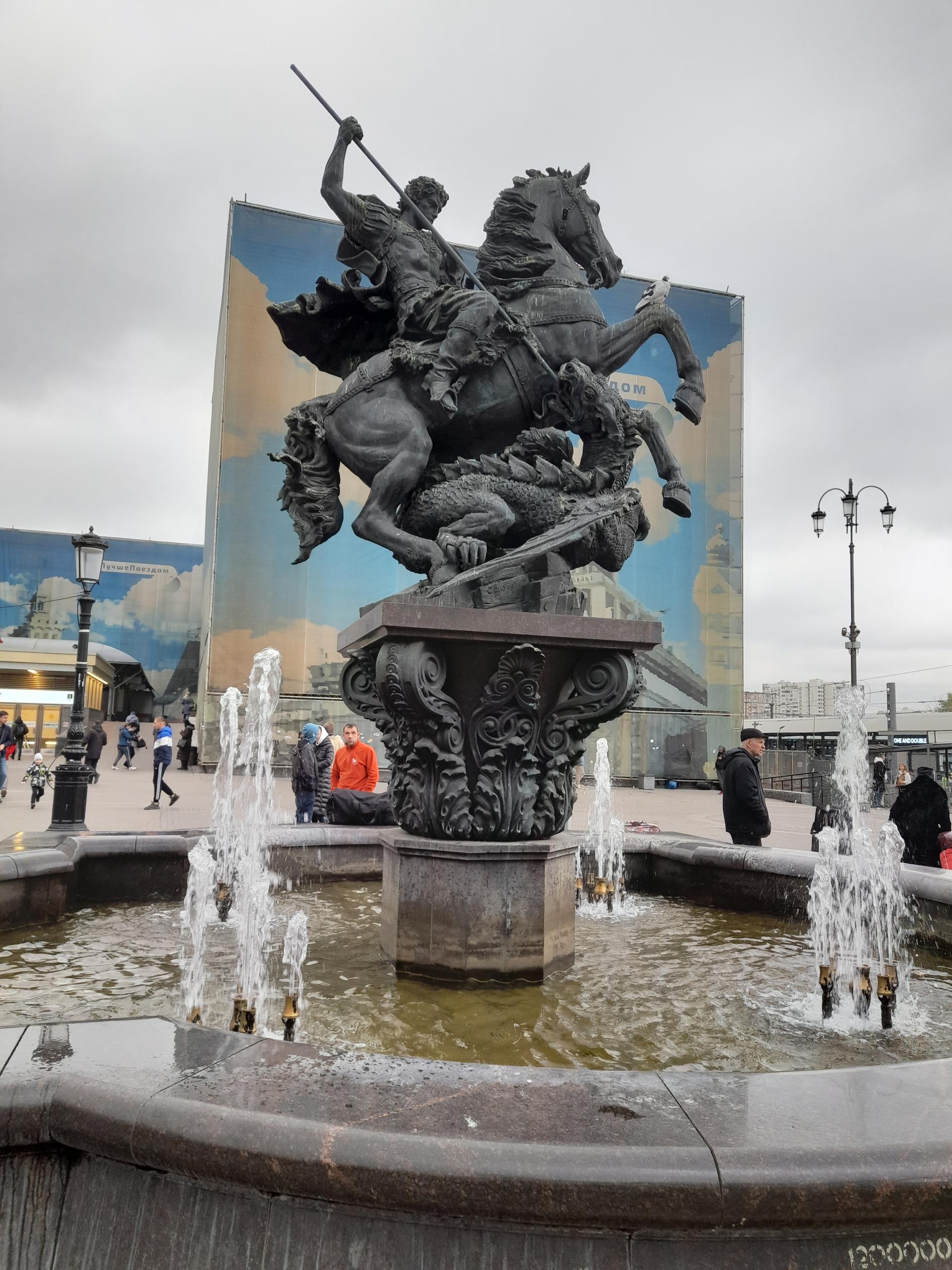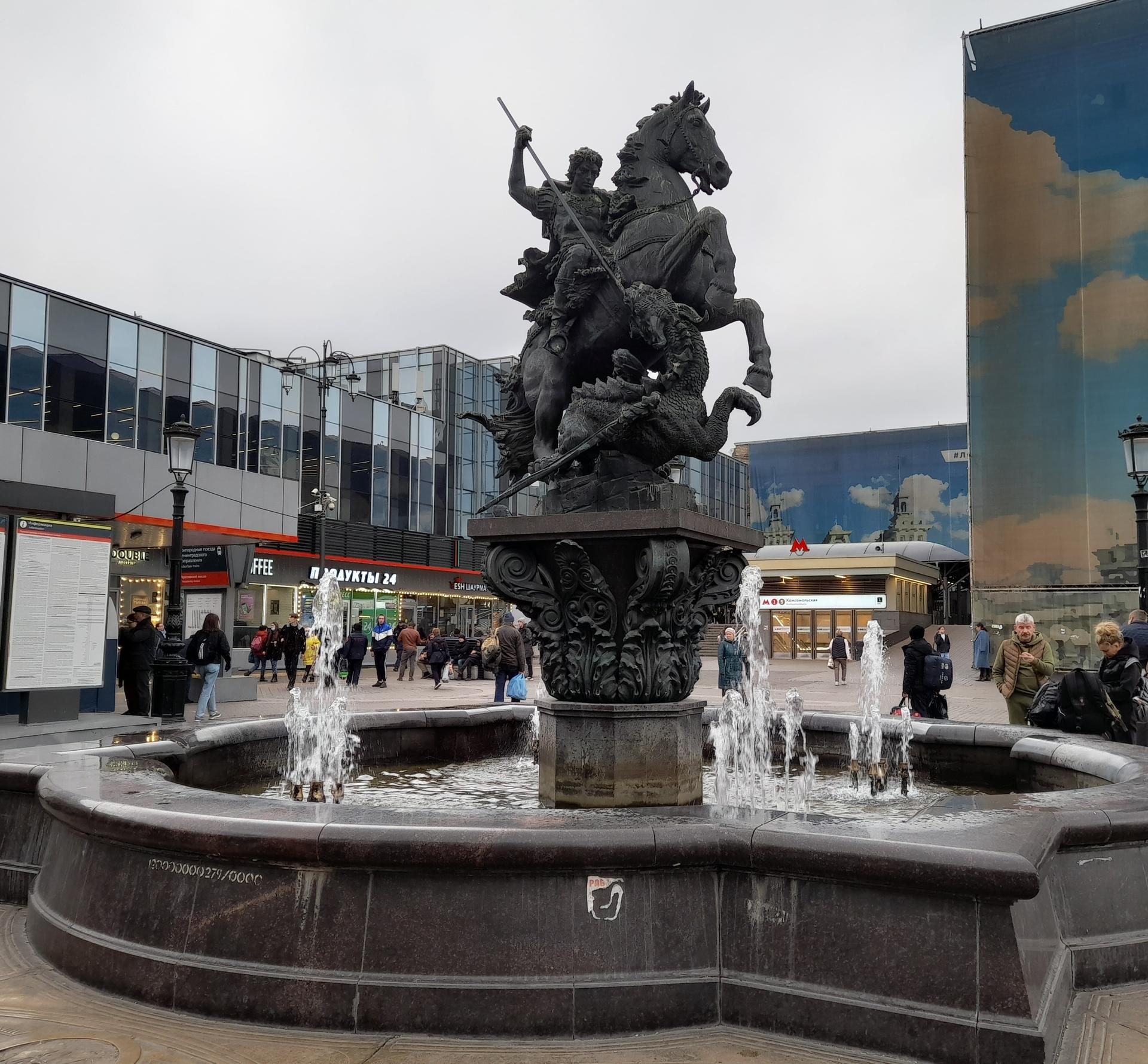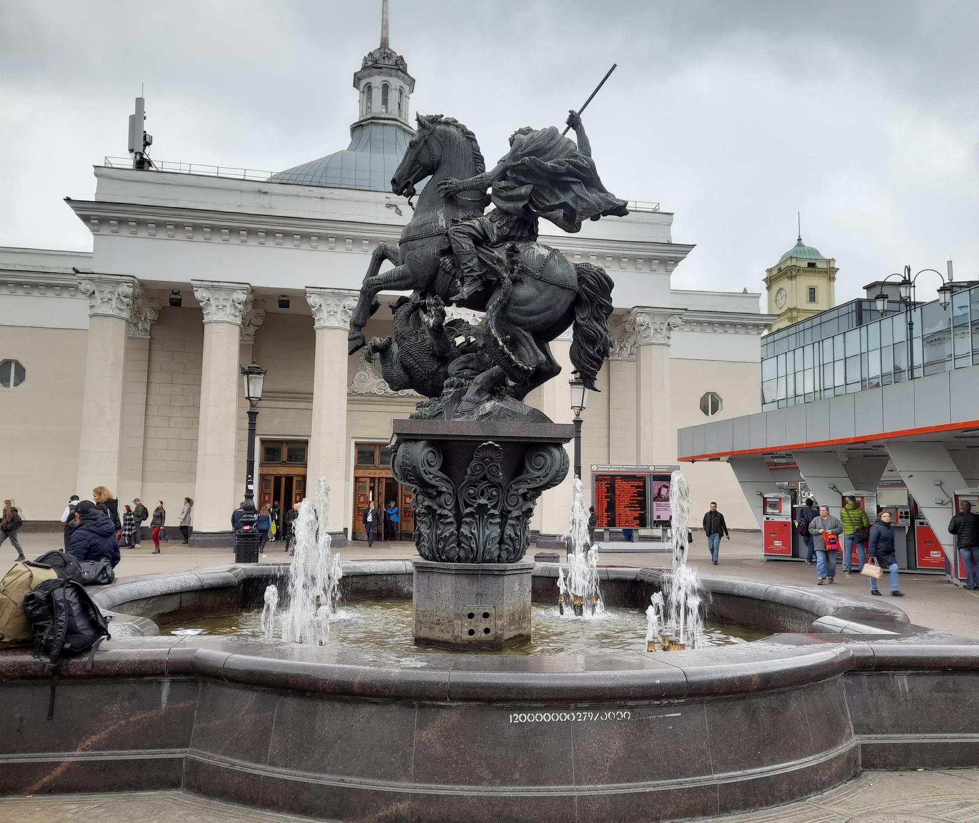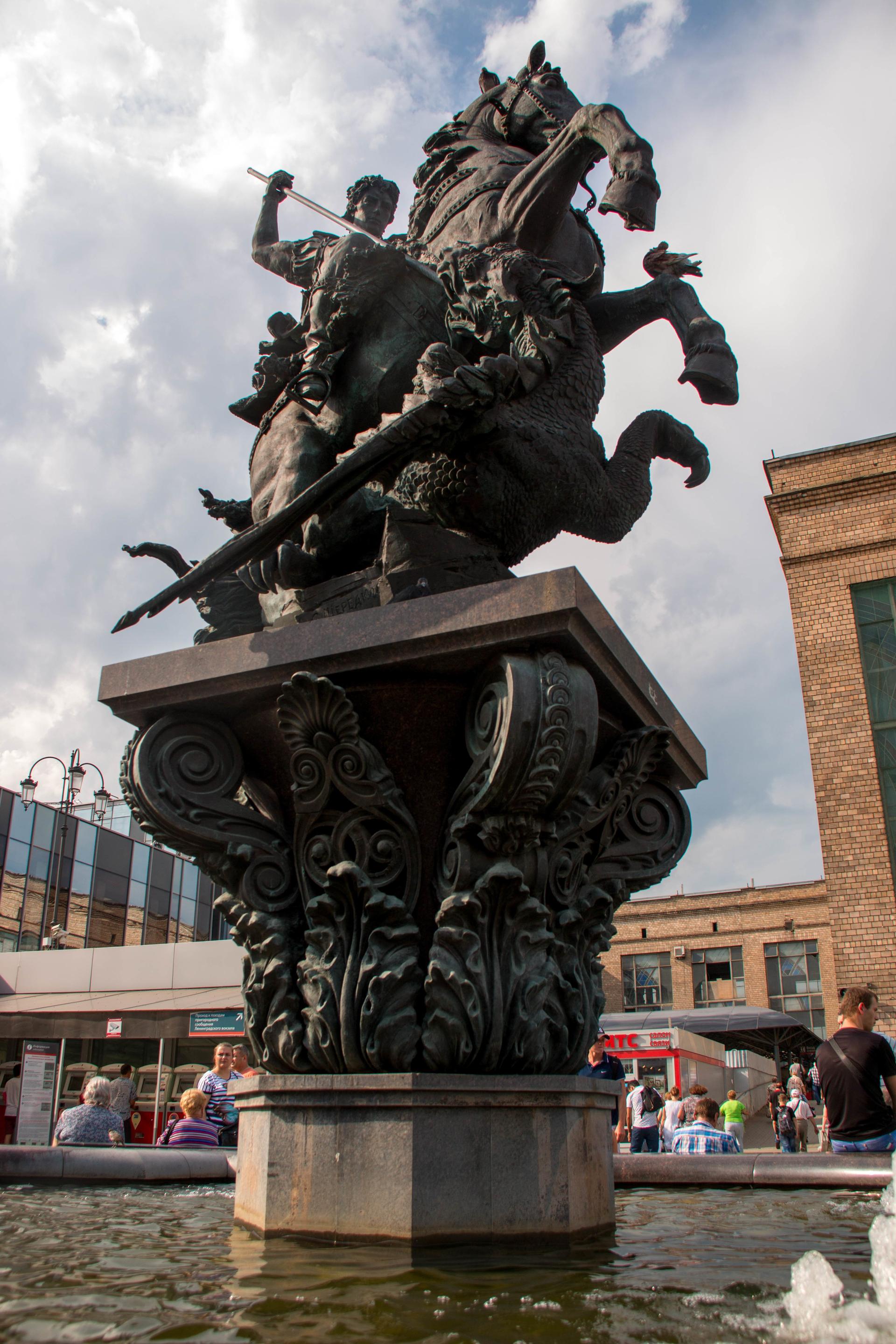 в древний герб города Москвы. Фонтан-памятник представляет собой гранитный бассейн, в центре которого монументальная скульптура Георгия Победоносца, поражающего змея. С четырех сторон ее украшают небольшие разноярусные фонтаны, бьющие вертикально вверх. Вокруг фонтана выложены плиты с названиями всех вокзалов Москвы и городов — пунктов прибытия.