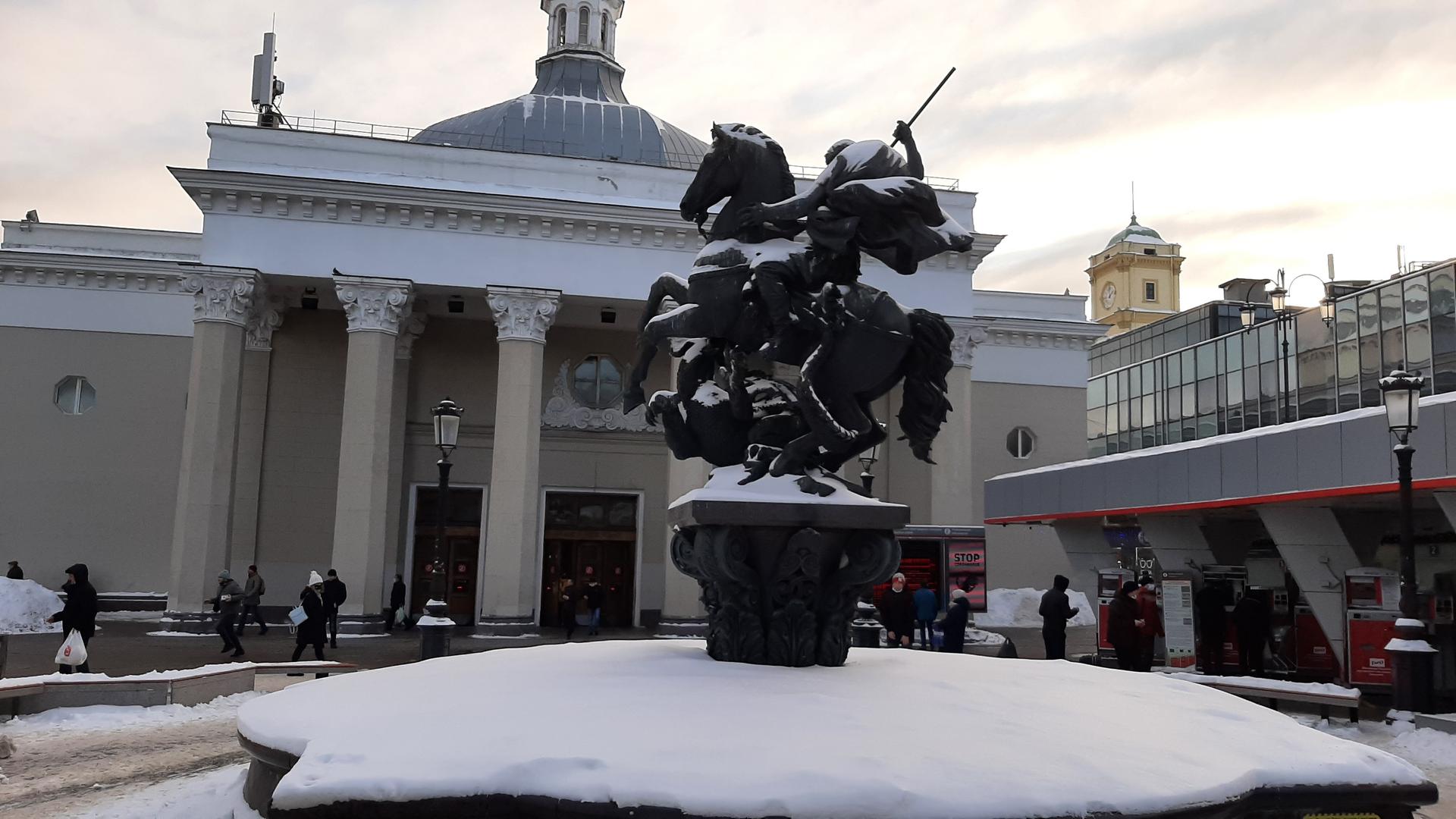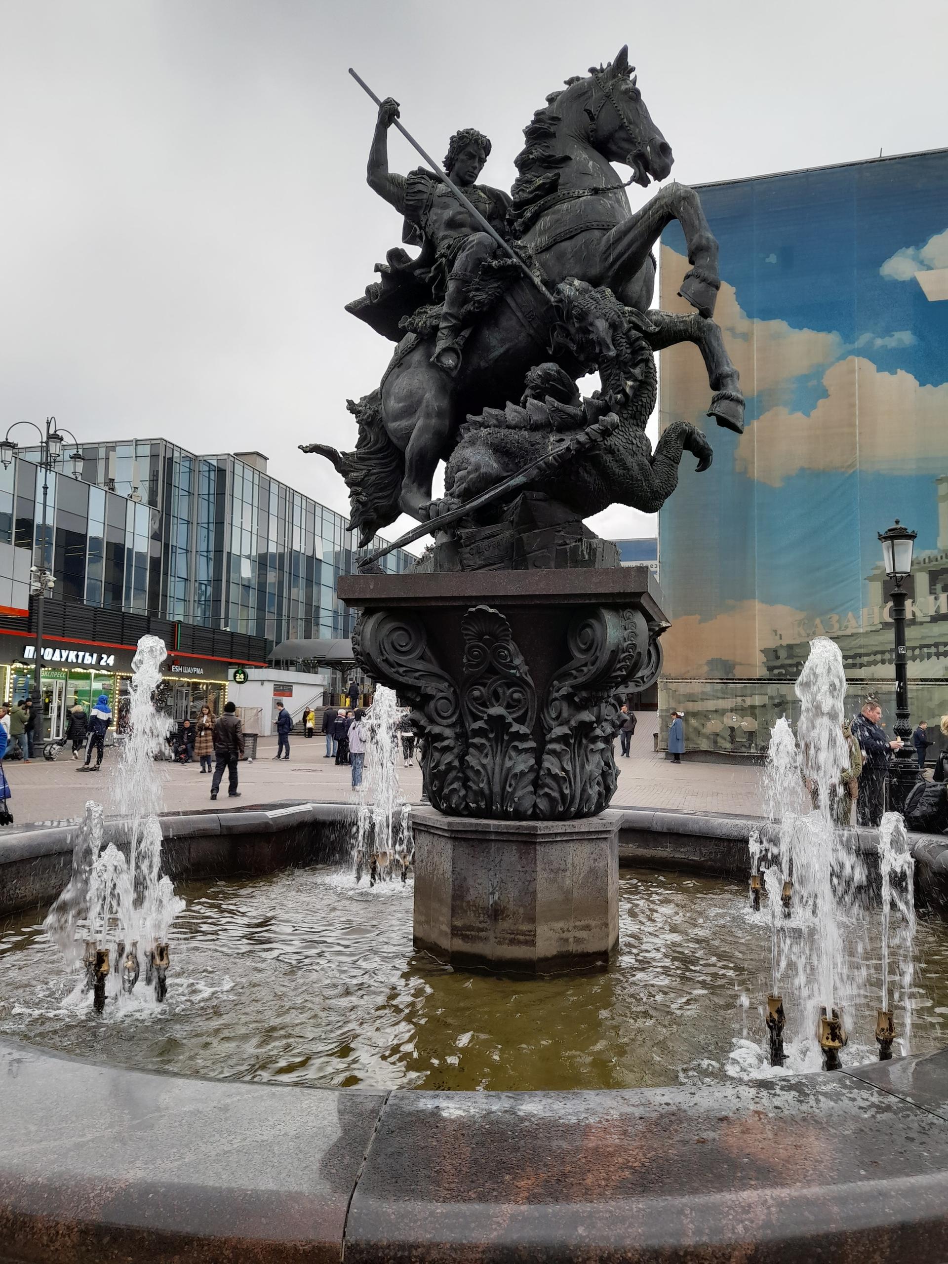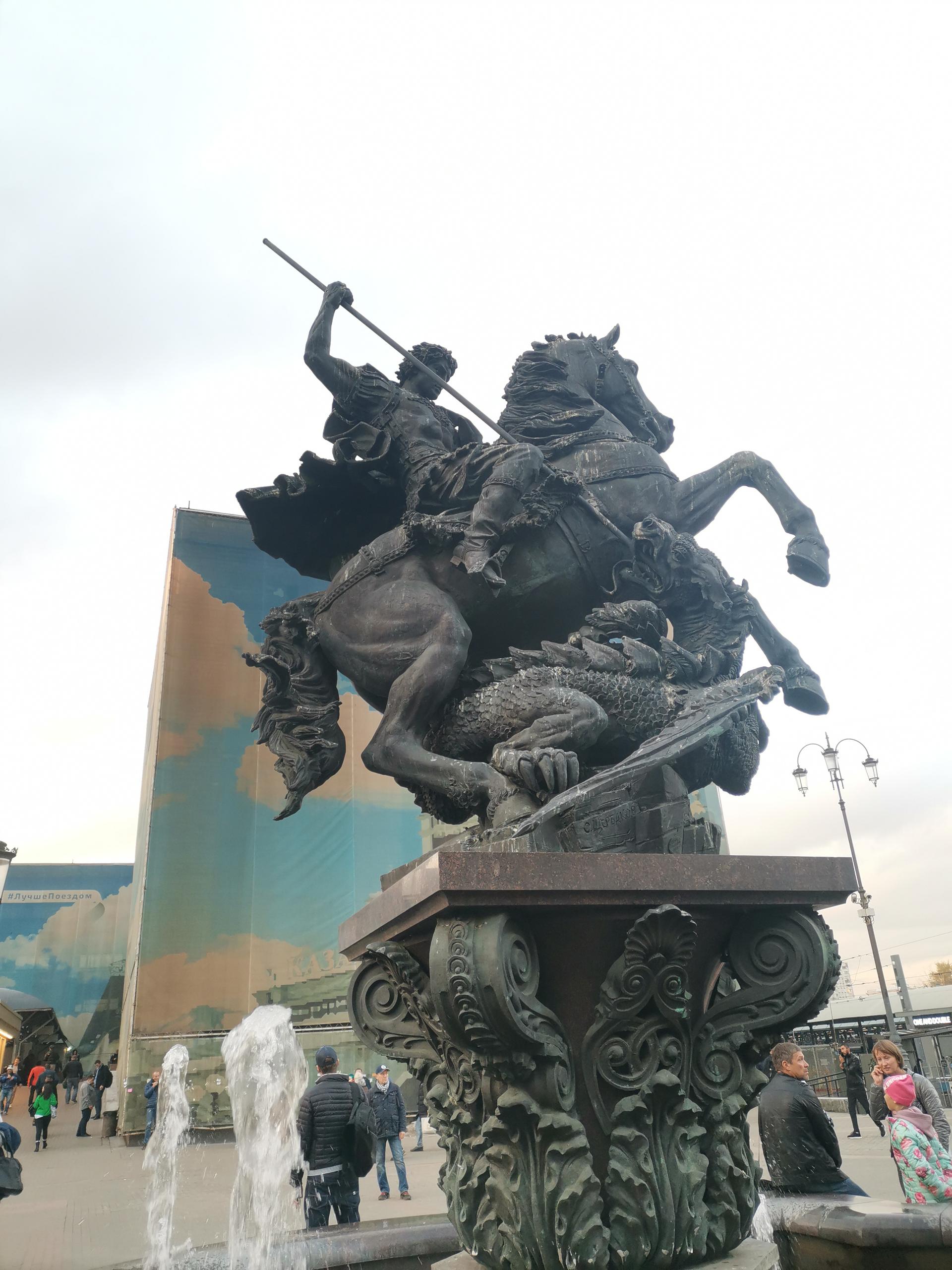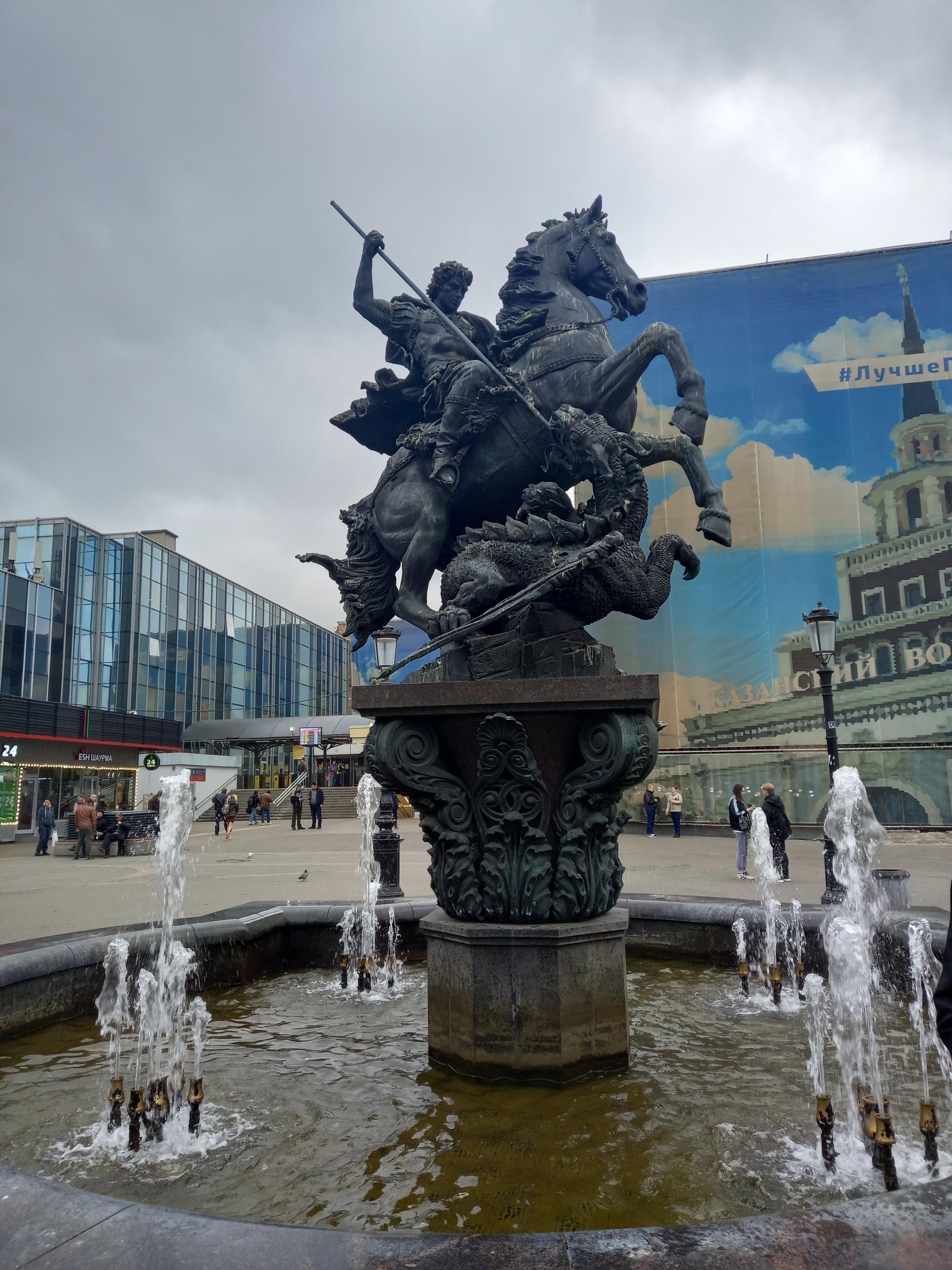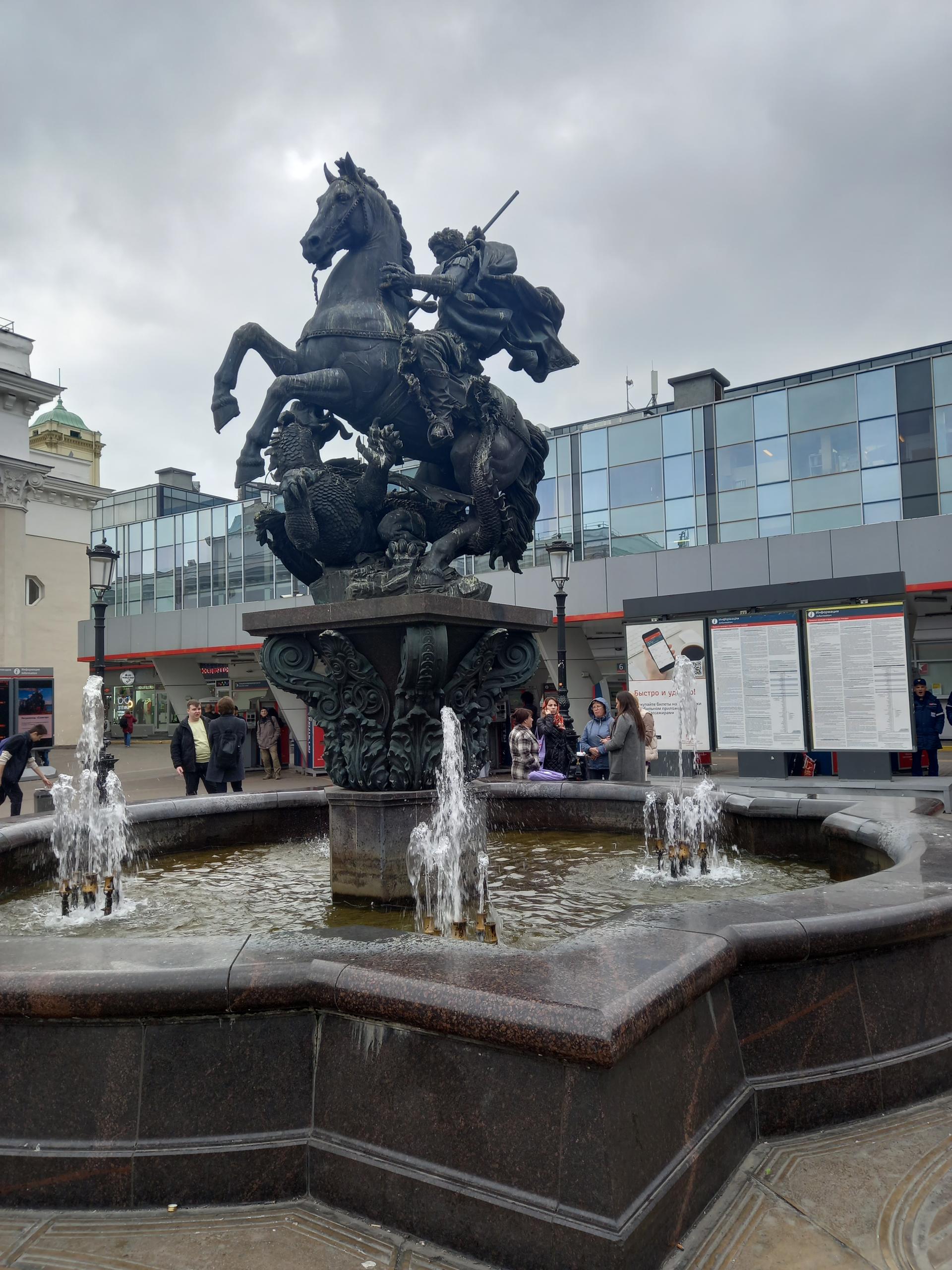 в древний герб города Москвы. Фонтан-памятник представляет собой гранитный бассейн, в центре которого монументальная скульптура Георгия Победоносца, поражающего змея. С четырех сторон ее украшают небольшие разноярусные фонтаны, бьющие вертикально вверх. Вокруг фонтана выложены плиты с названиями всех вокзалов Москвы и городов — пунктов прибытия.