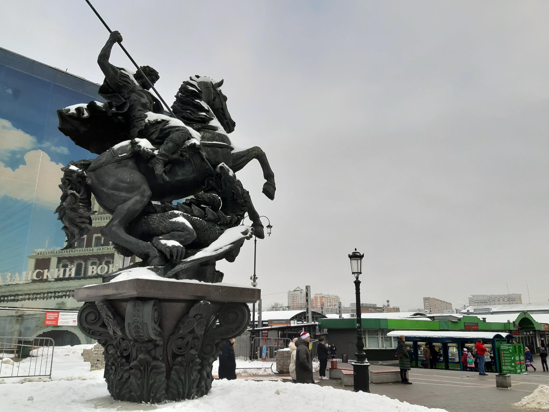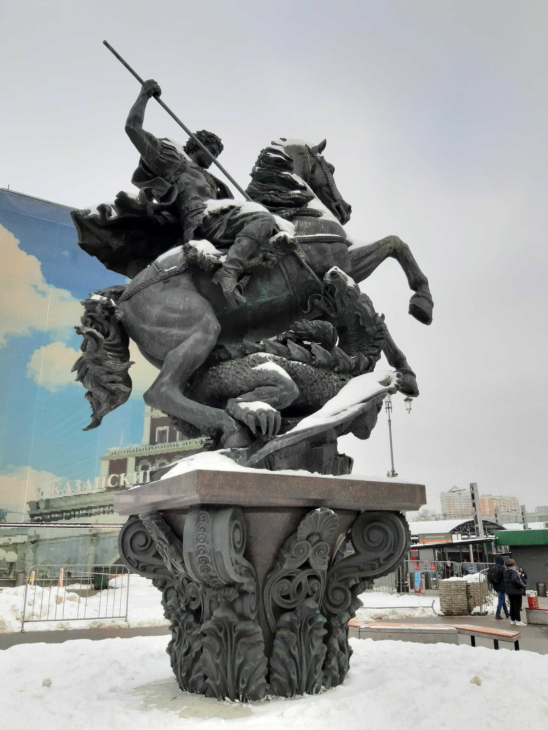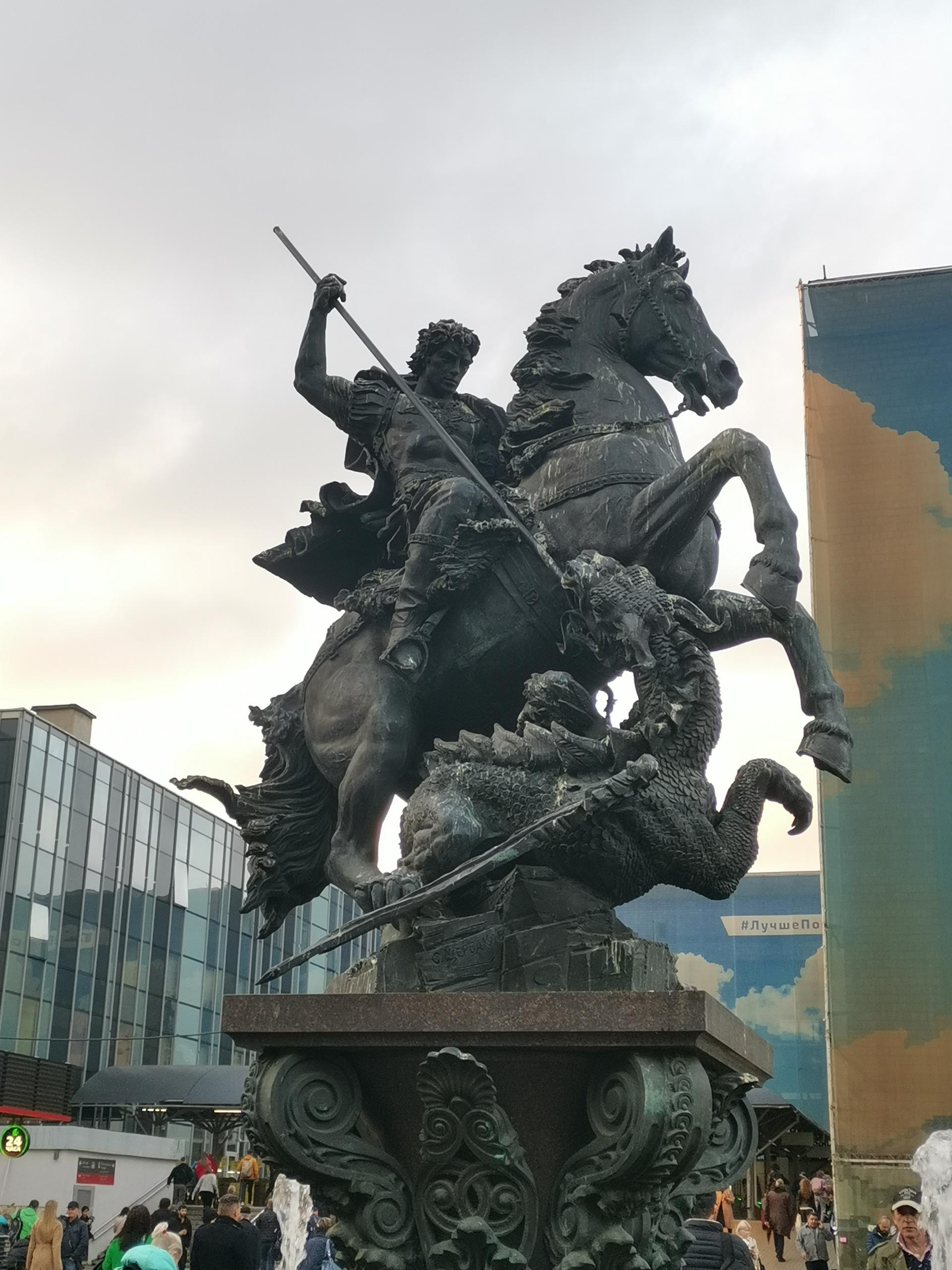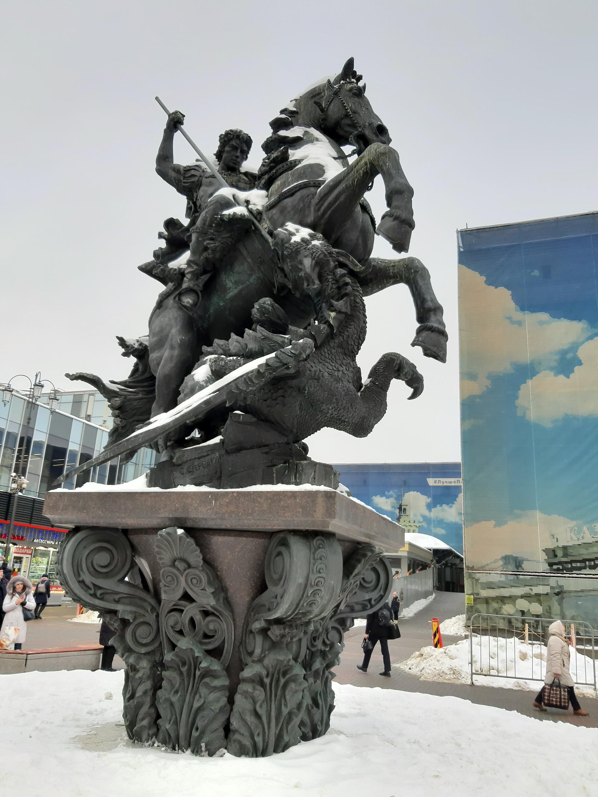 в древний герб города Москвы. Фонтан-памятник представляет собой гранитный бассейн, в центре которого монументальная скульптура Георгия Победоносца, поражающего змея. С четырех сторон ее украшают небольшие разноярусные фонтаны, бьющие вертикально вверх. Вокруг фонтана выложены плиты с названиями всех вокзалов Москвы и городов — пунктов прибытия.