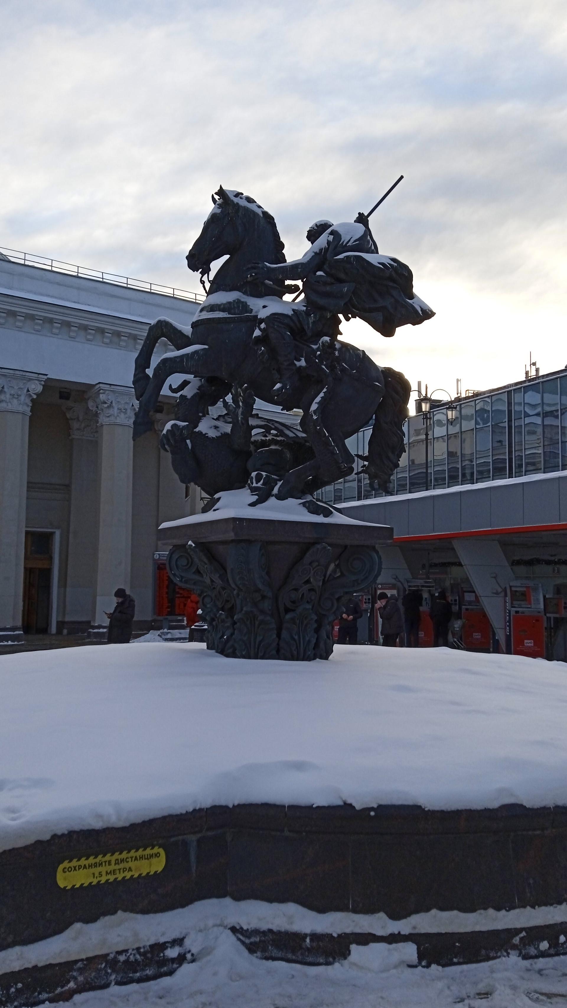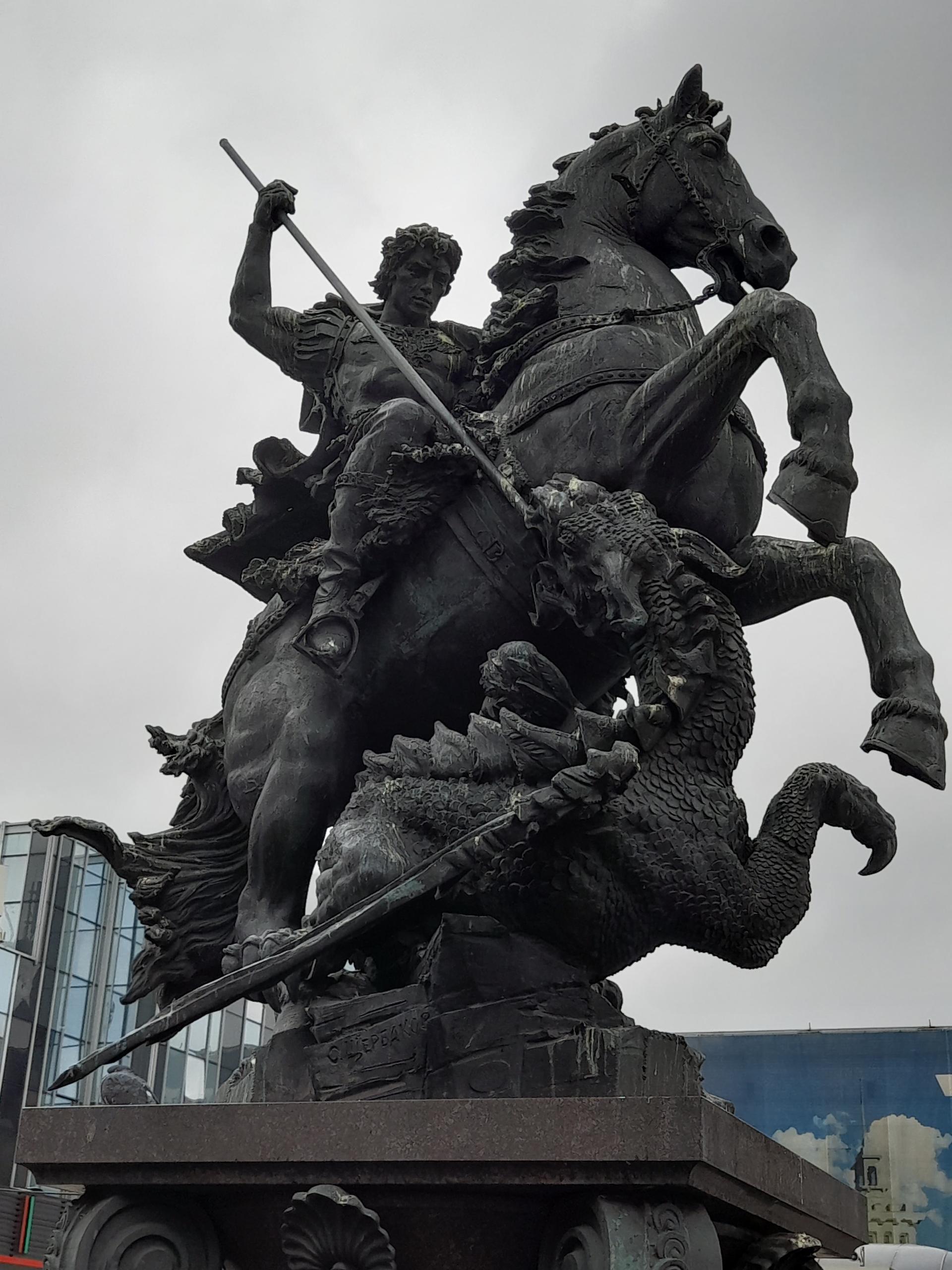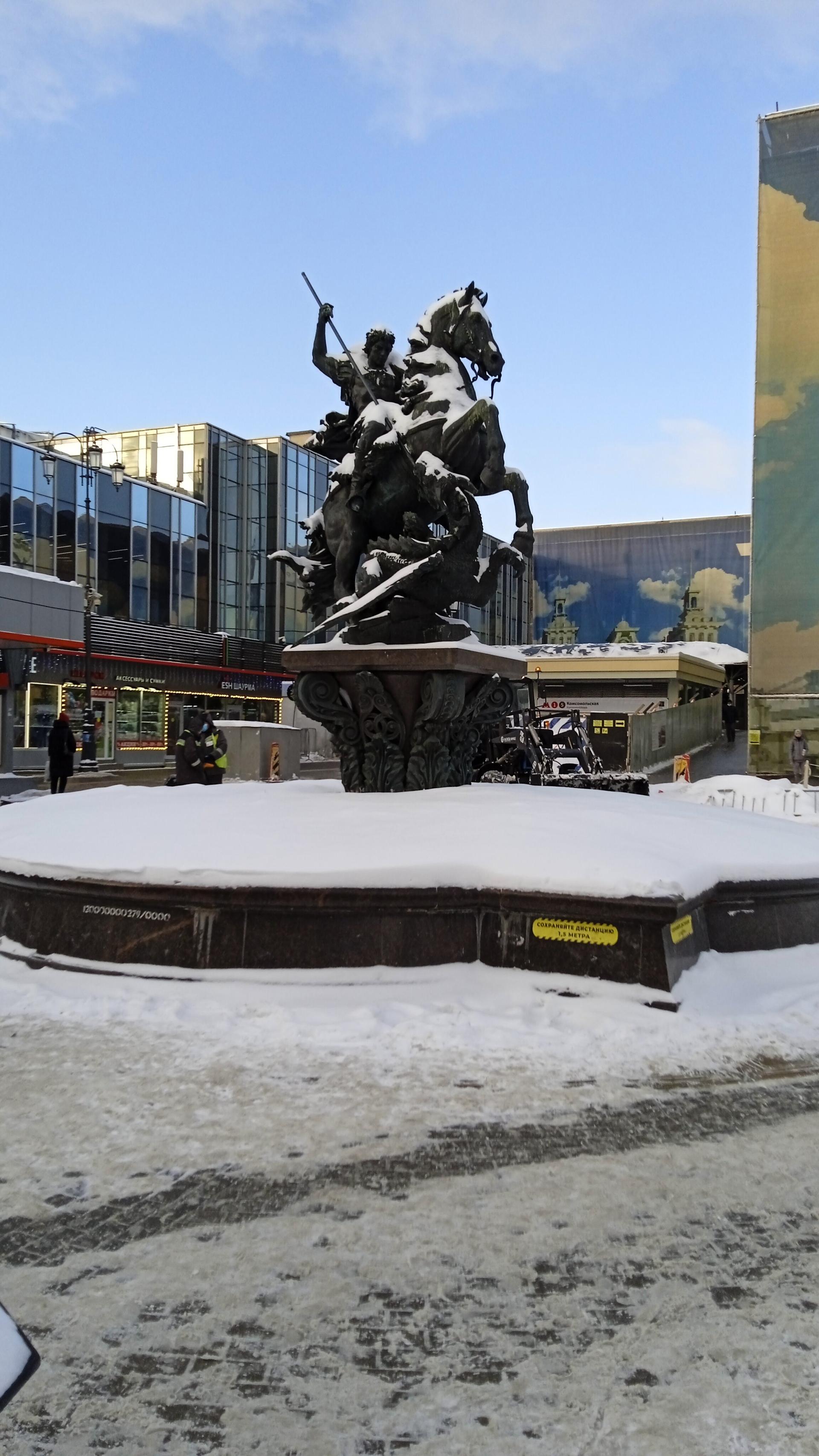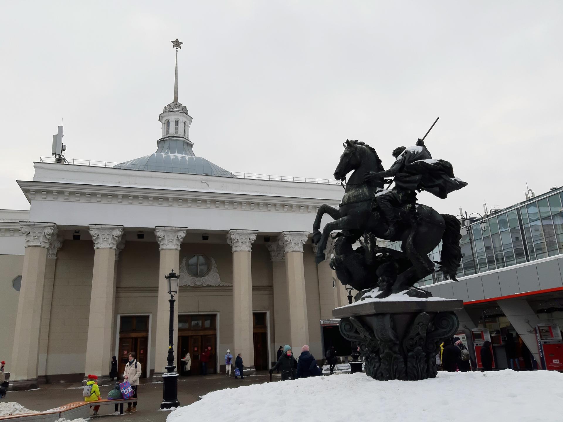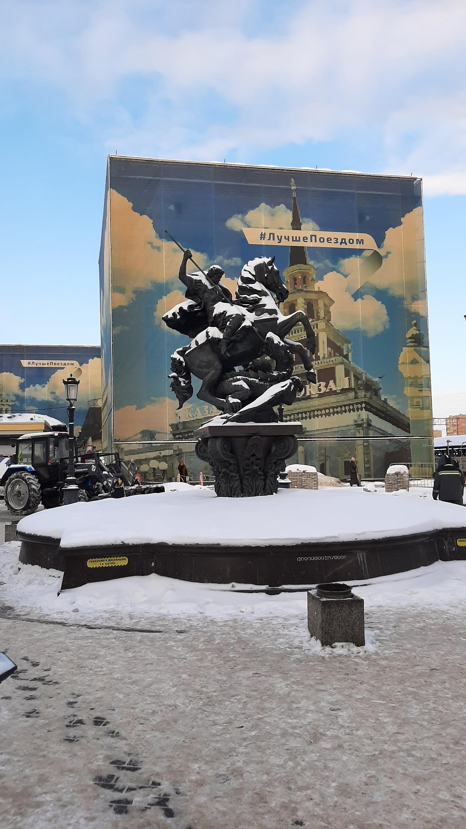 в древний герб города Москвы. Фонтан-памятник представляет собой гранитный бассейн, в центре которого монументальная скульптура Георгия Победоносца, поражающего змея. С четырех сторон ее украшают небольшие разноярусные фонтаны, бьющие вертикально вверх. Вокруг фонтана выложены плиты с названиями всех вокзалов Москвы и городов — пунктов прибытия.