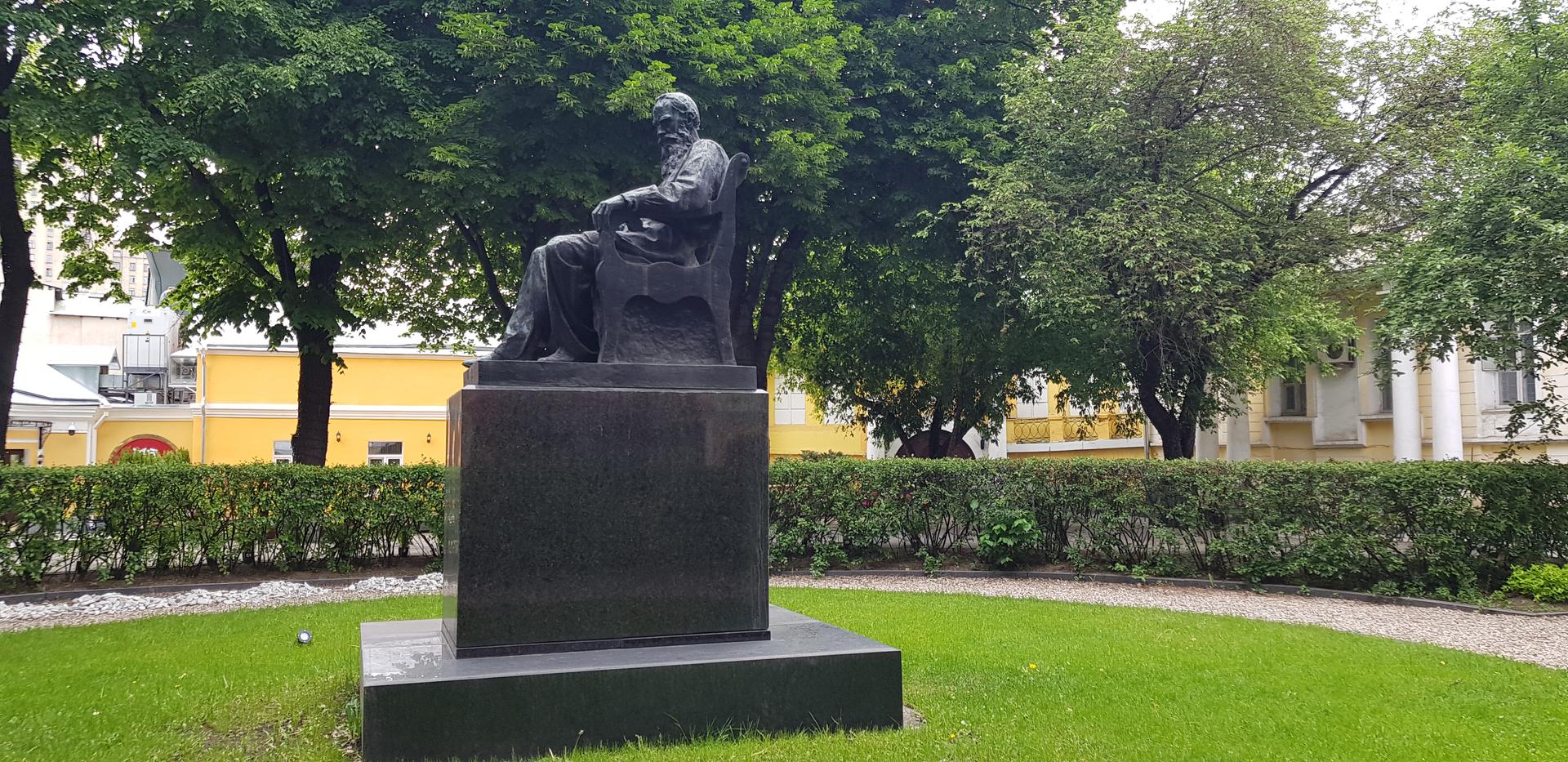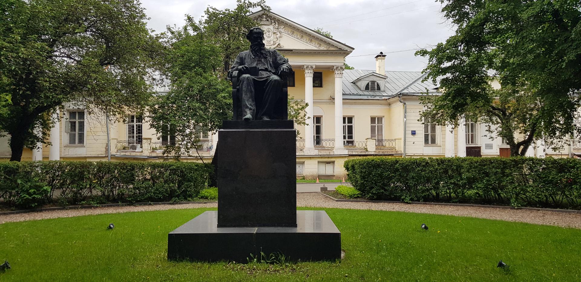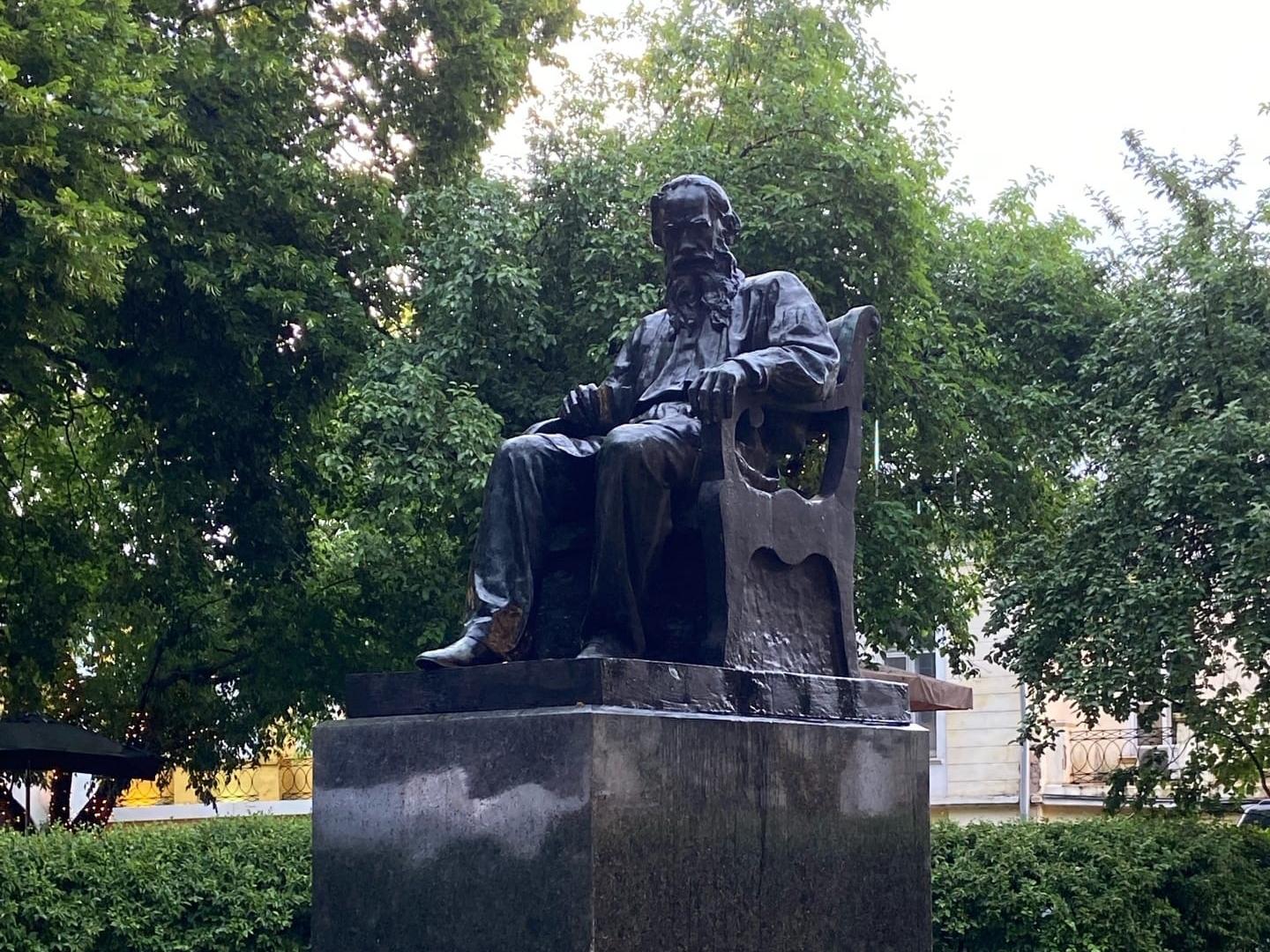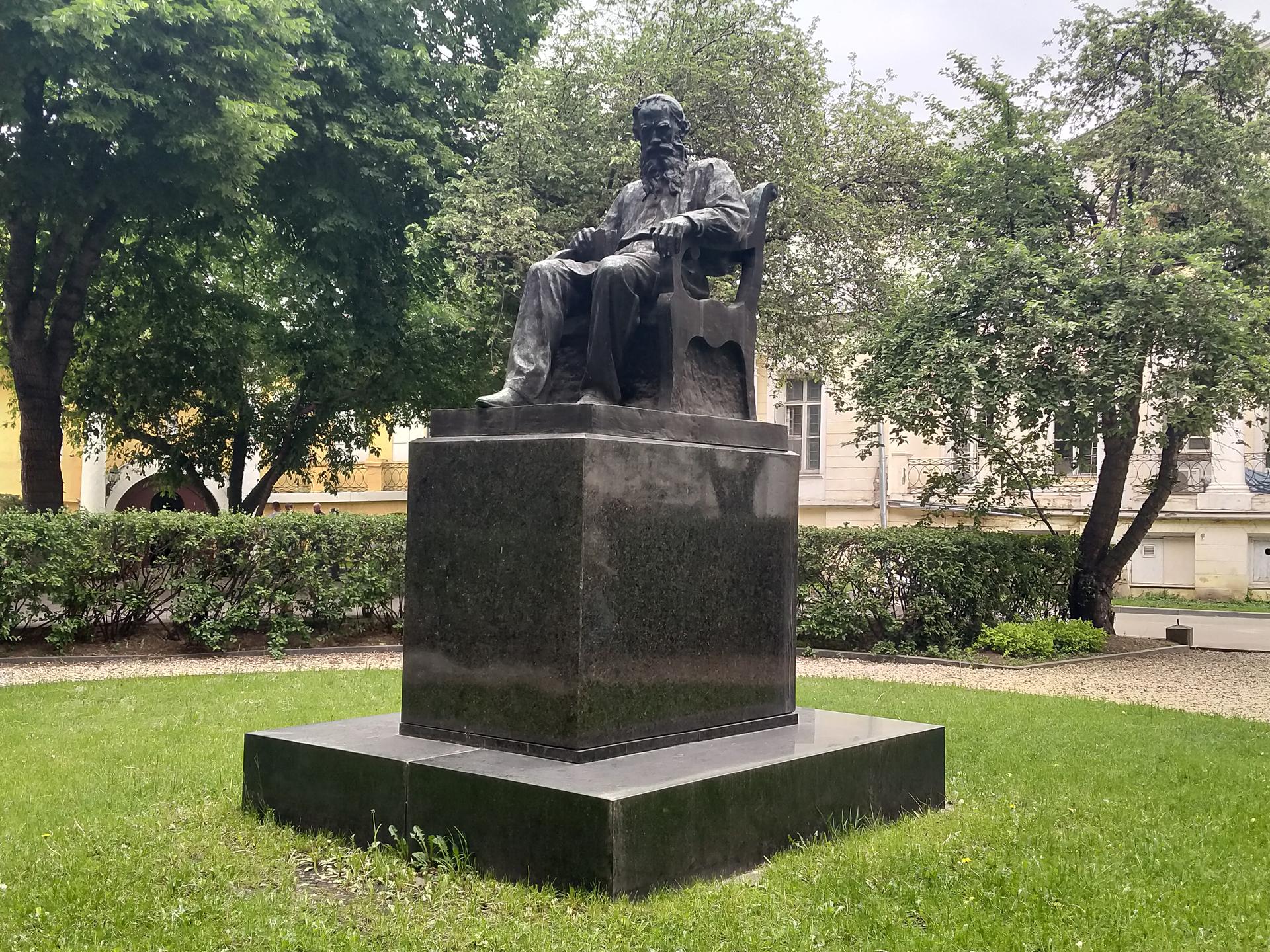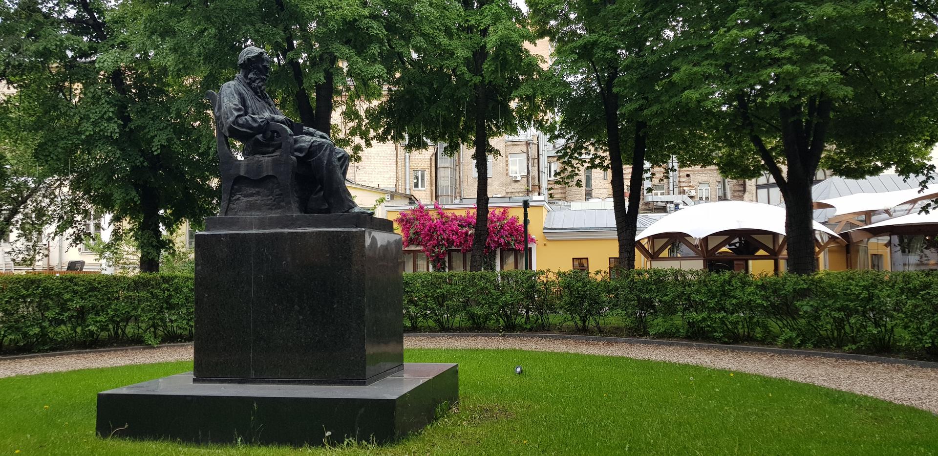 Скульптурный памятник Л. Н. Толстому установлен в 1956 году перед старинным особняком на Поварской улице. Именно эта усадьба была описана Львом Николаевичем в романе-эпопее «Война и Мир», как дом Ростовых, в котором он поселил героев своего произведения, об этом напоминает мемориальная доска. Ныне усадьбу занимают писательские организации. Бронзовая фигура Л.Н. Толстого - подарок писателей Украины московским собратьям по перу в связи с 300-летием воссоединения Украины с Россией.