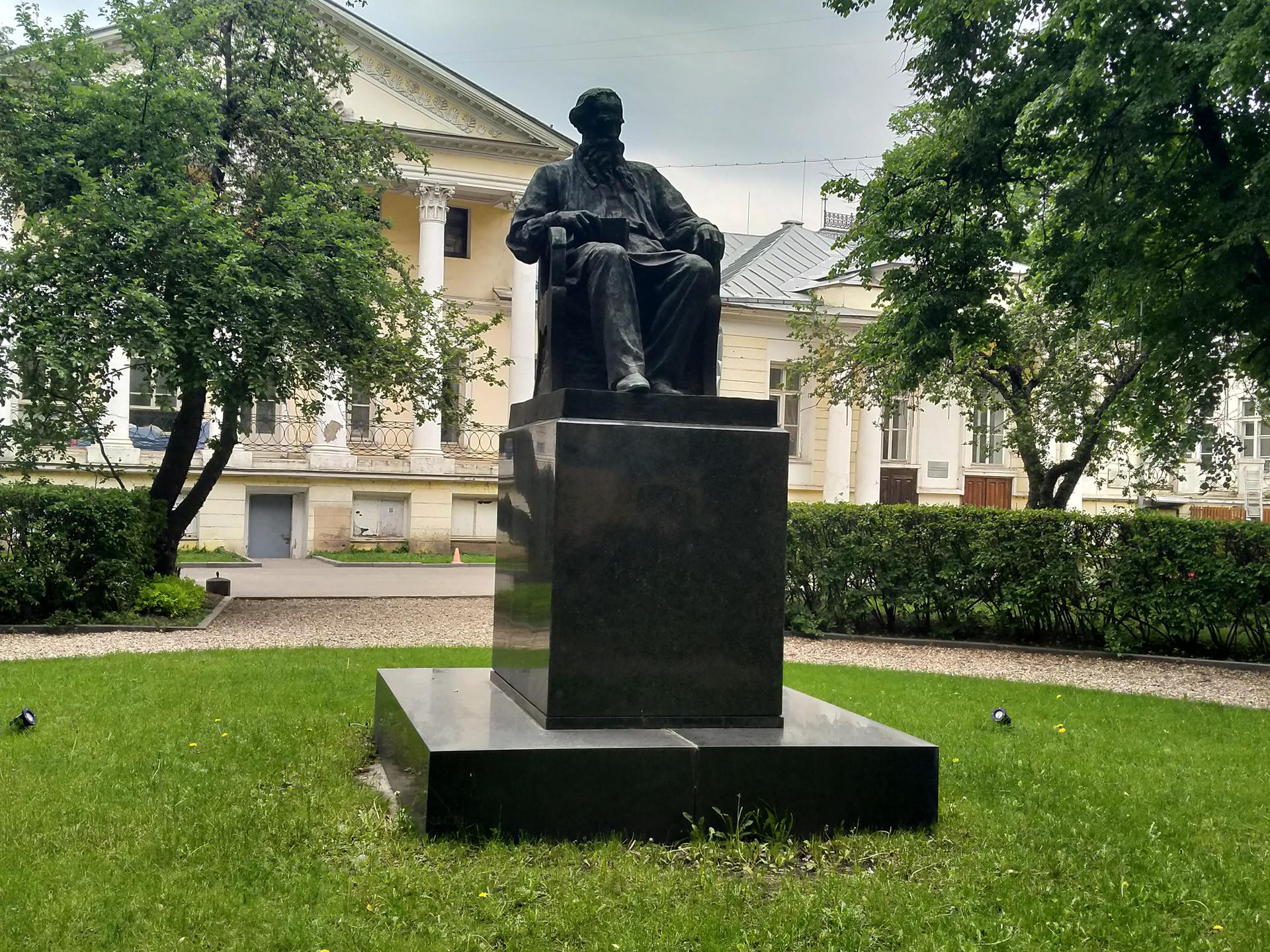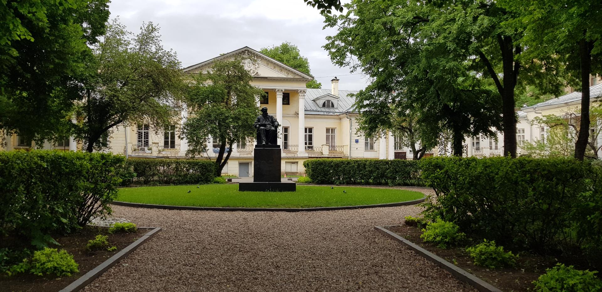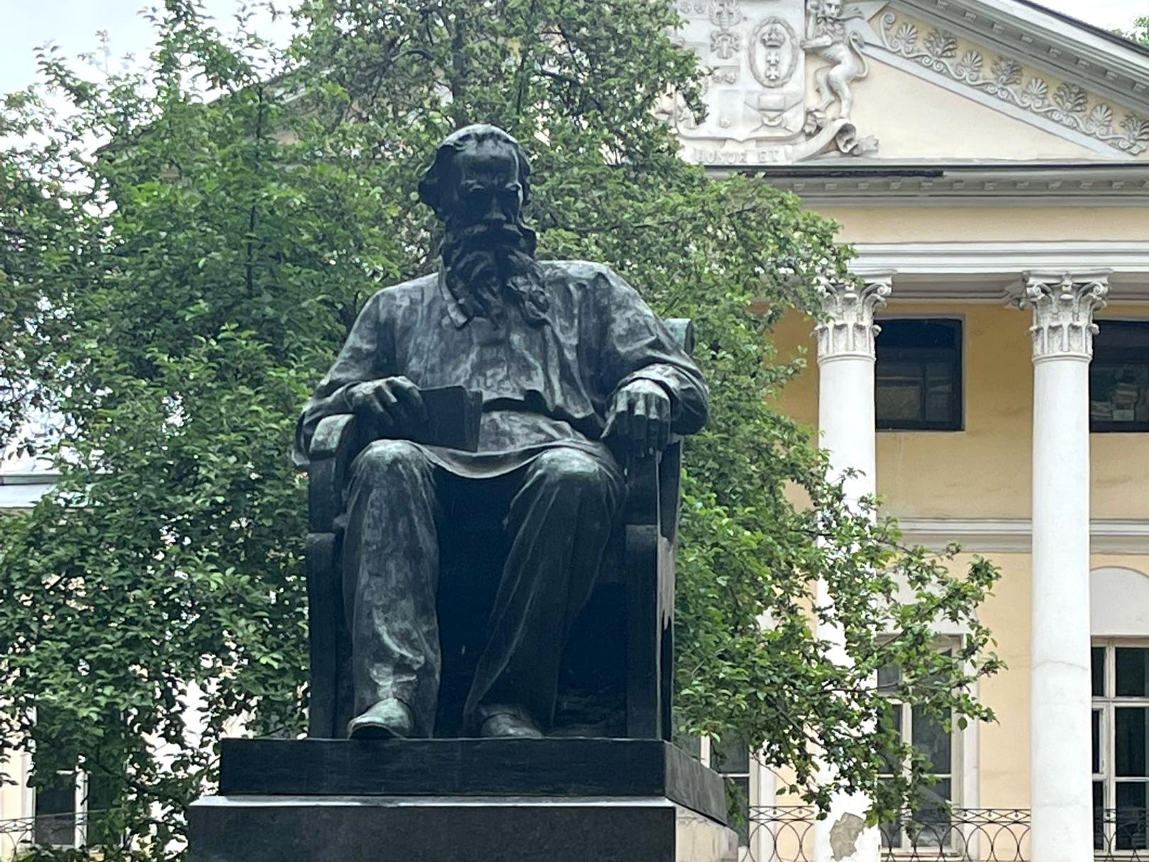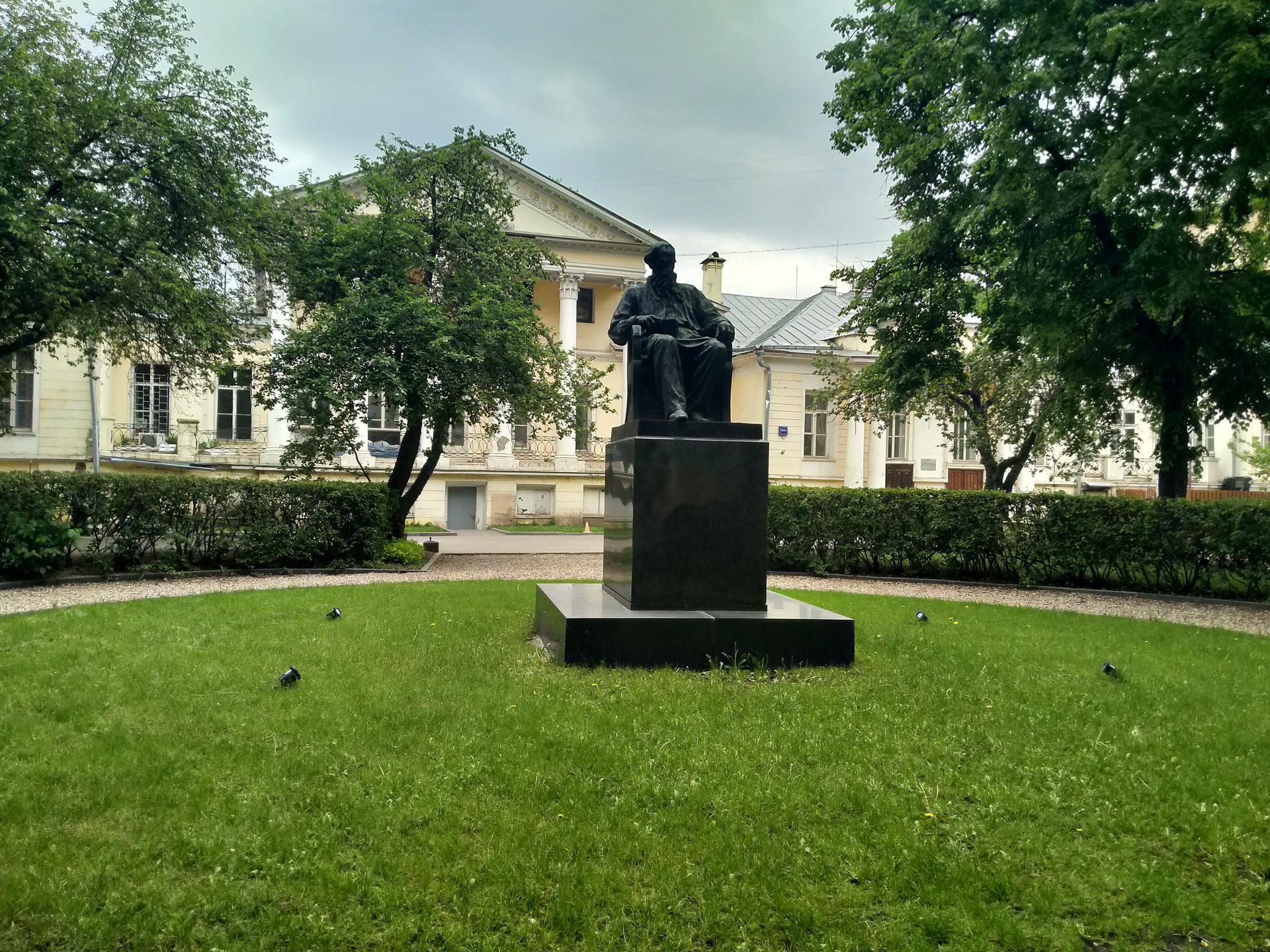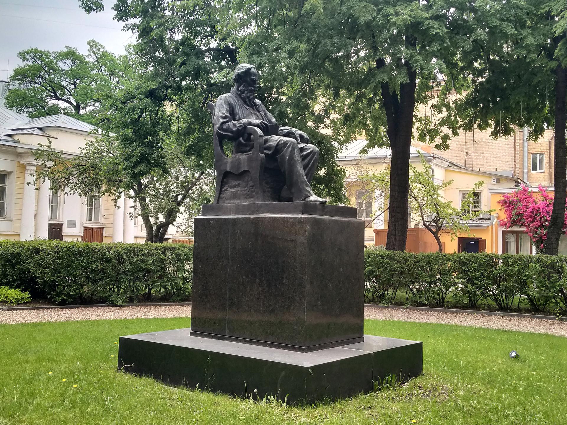 Скульптурный памятник Л. Н. Толстому установлен в 1956 году перед старинным особняком на Поварской улице. Именно эта усадьба была описана Львом Николаевичем в романе-эпопее «Война и Мир», как дом Ростовых, в котором он поселил героев своего произведения, об этом напоминает мемориальная доска. Ныне усадьбу занимают писательские организации. Бронзовая фигура Л.Н. Толстого - подарок писателей Украины московским собратьям по перу в связи с 300-летием воссоединения Украины с Россией.