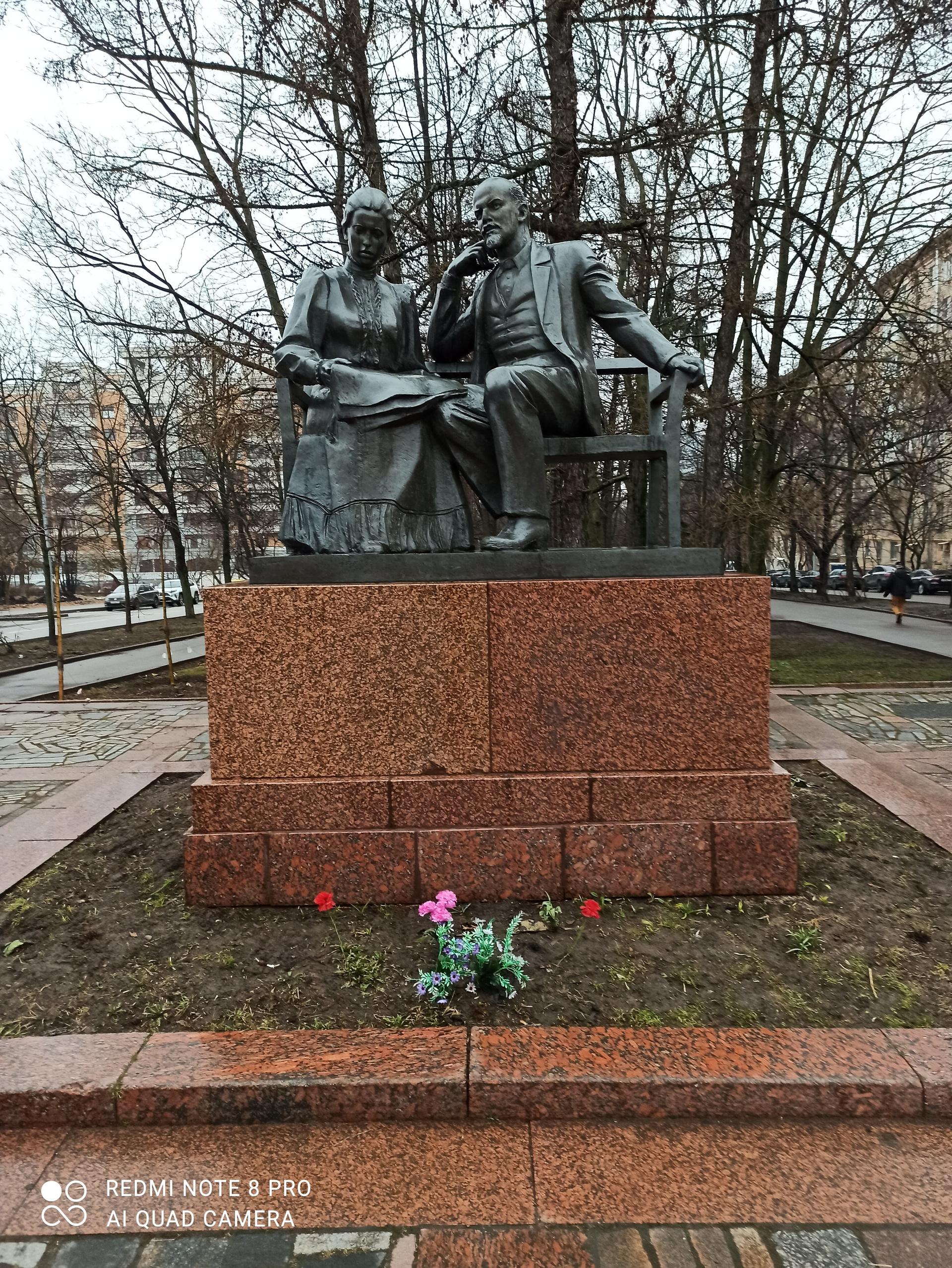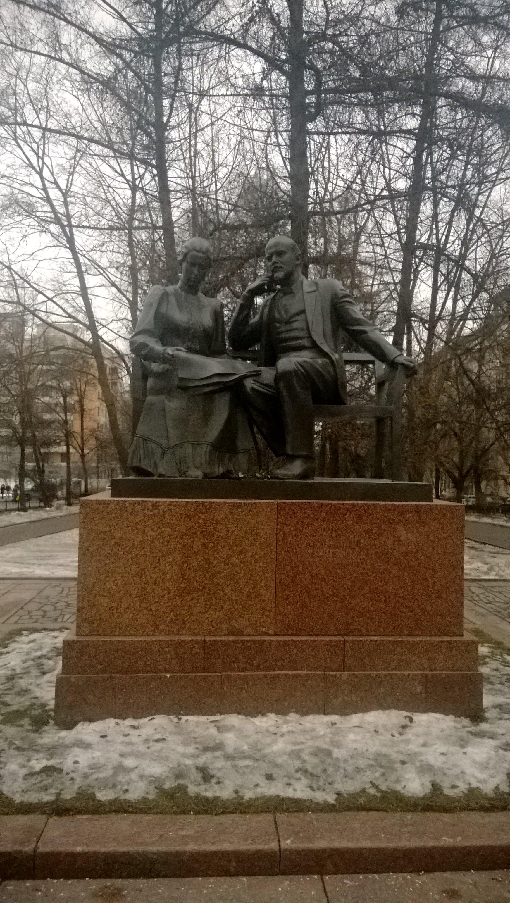 Скульптор изобразил В.И. Ленина и Н.К. Крупскую молодыми, беззаботными. Ленин вдумчиво смотрит вдаль, возможно, слушает Крупскую. Крупская читает газету "Искра". Пара смотрится очень мило. Памятник был открыт 21 апреля 1989 г. (к 119 годовщине со дня рождения Ленина) в сквере, находящемся на углу Ленинского проспекта и улицы Крупской.