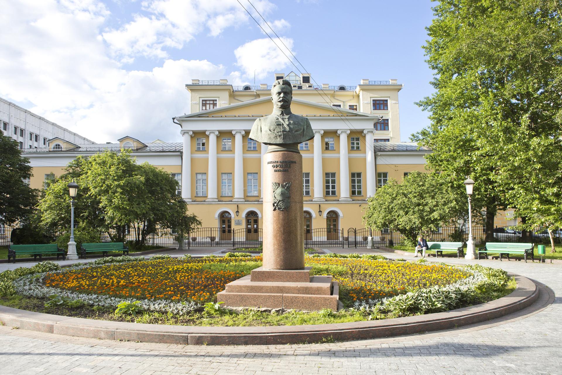 Михаил Васильевич Фрунзе (1885—1925) — советский государственный и военный деятель, один из наиболее крупных военачальников, видный деятель Октябрьской революции и Гражданской войны, военный теоретик. Бронзовый бюст М. В. Фрунзе установлен на гранитном постаменте-колонне. Революционер представлен в военной форме, без головного убора.