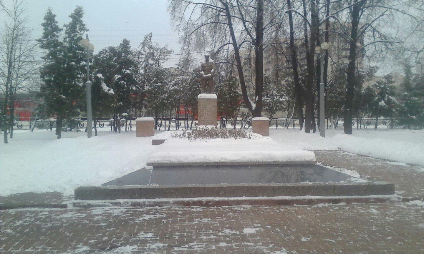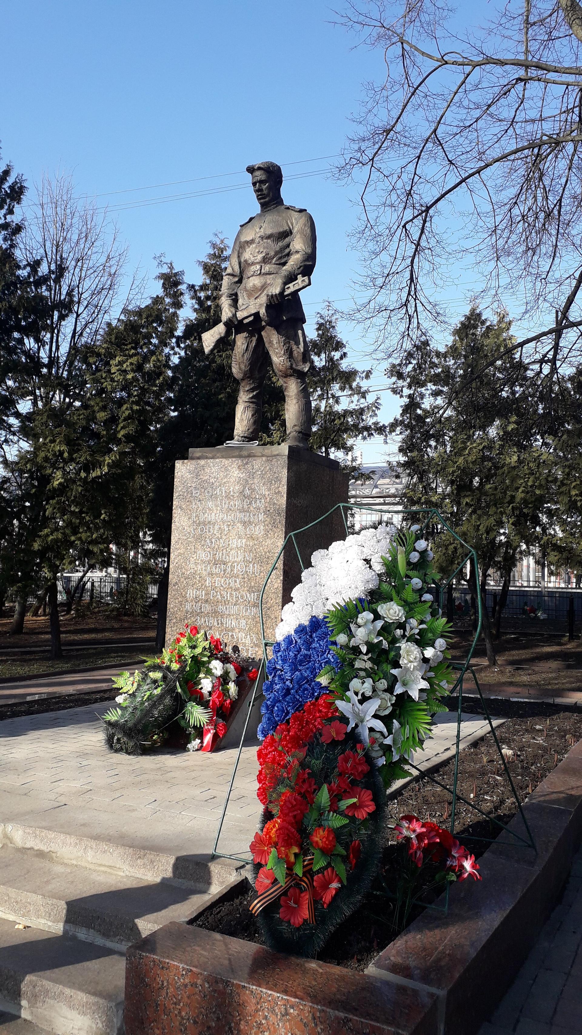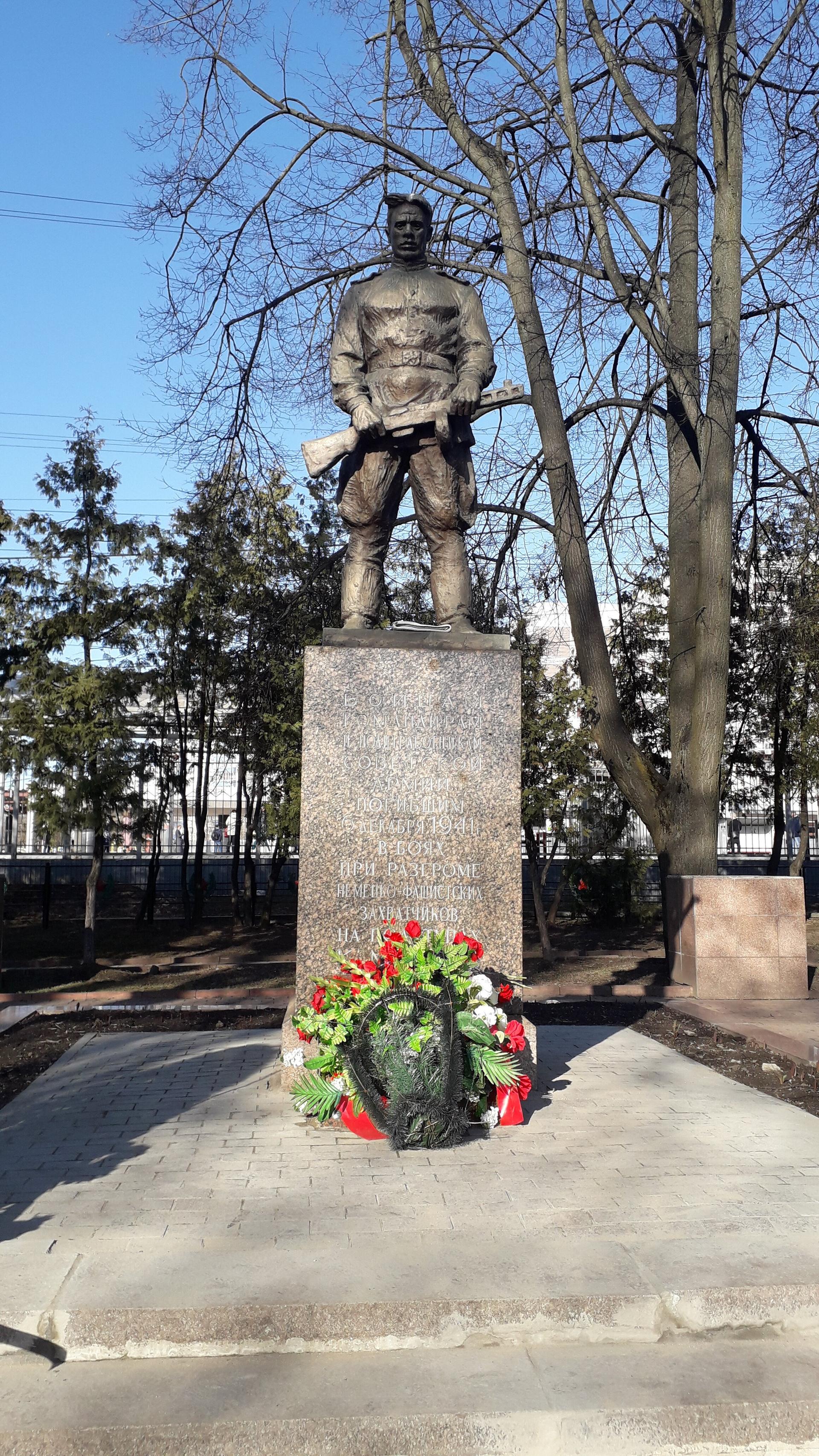 На постаменте текст: «Бойцам, командирам и политработникам Советской Армии, погибшим 6 декабря 1941 г. в боях при разгроме немецко-фашистских захватчиков на подступах к Москве».