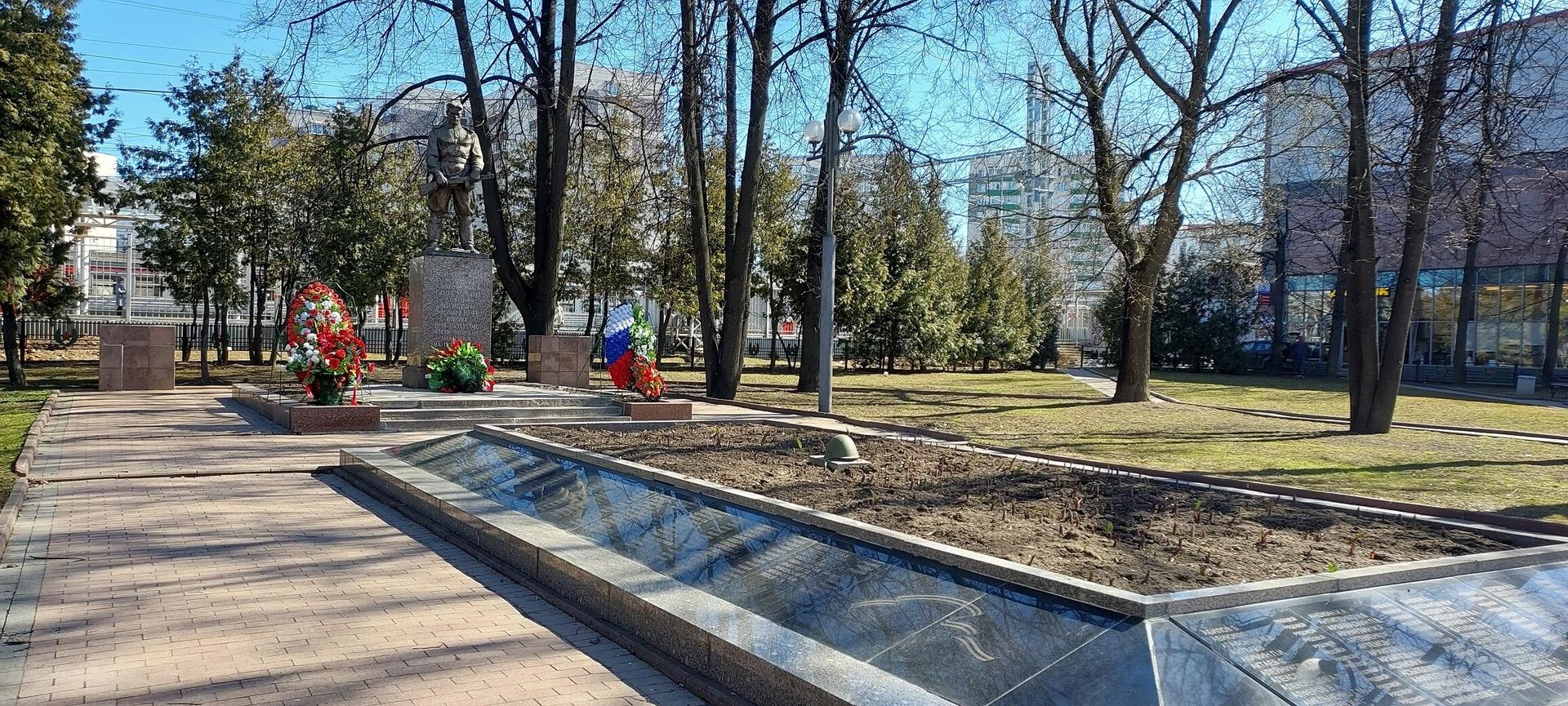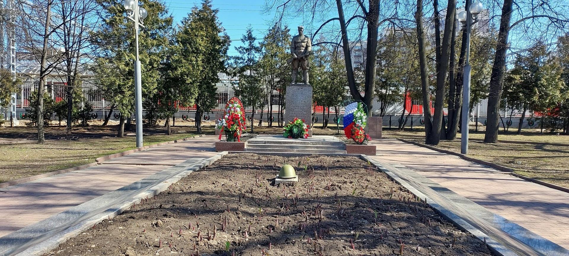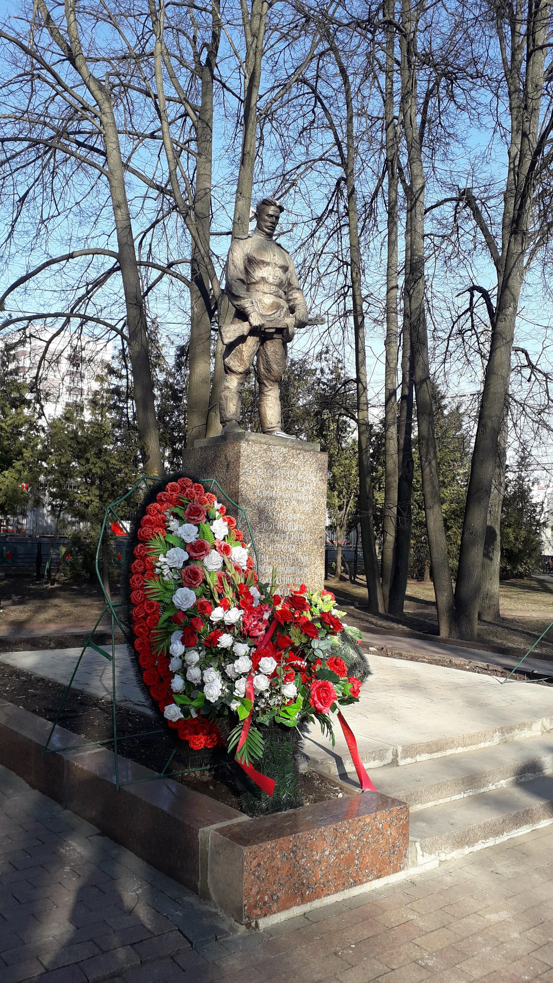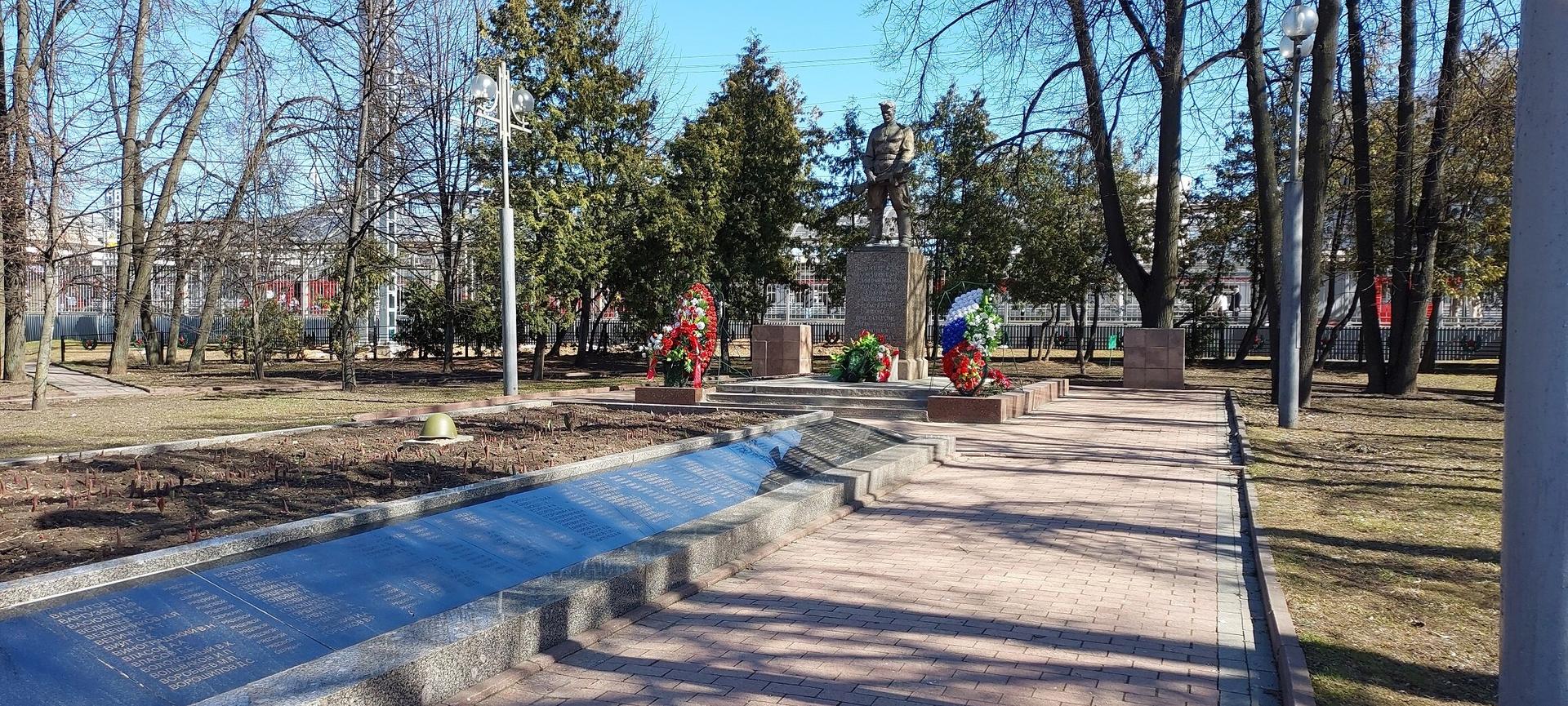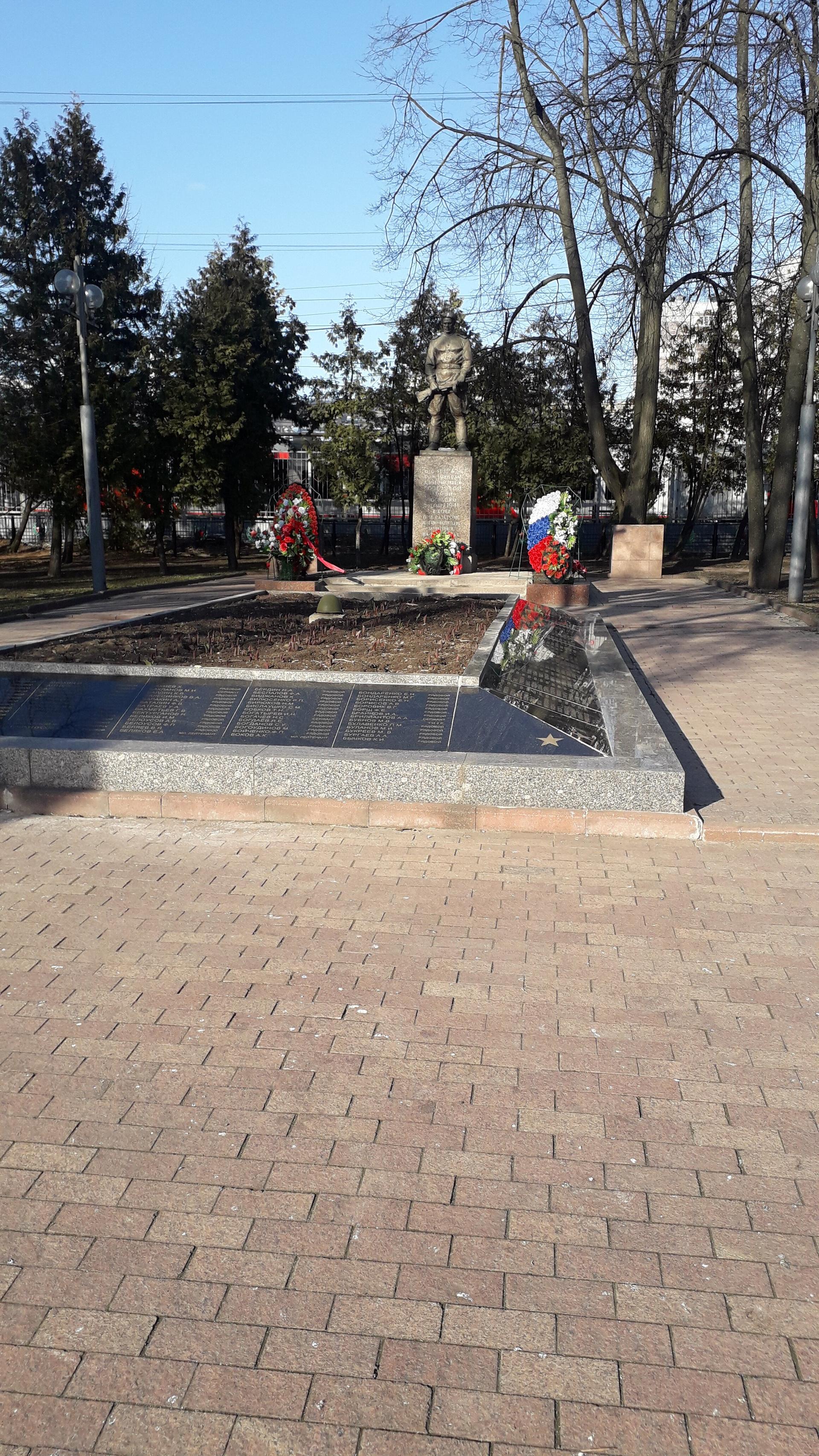 Текст на доске перед списком погибших солдат: «Вечная слава воинам, павшим в боях с немецко-фашистскими захватчиками при обороне Москвы зимой 1941 г.» При первоначальной установке, в 1956 году, скульптура была повернута в другую сторону. Самый первый памятник на братском захоронении был выполнен из дерева по проекту местного жителя Н.Н. Бухарова.