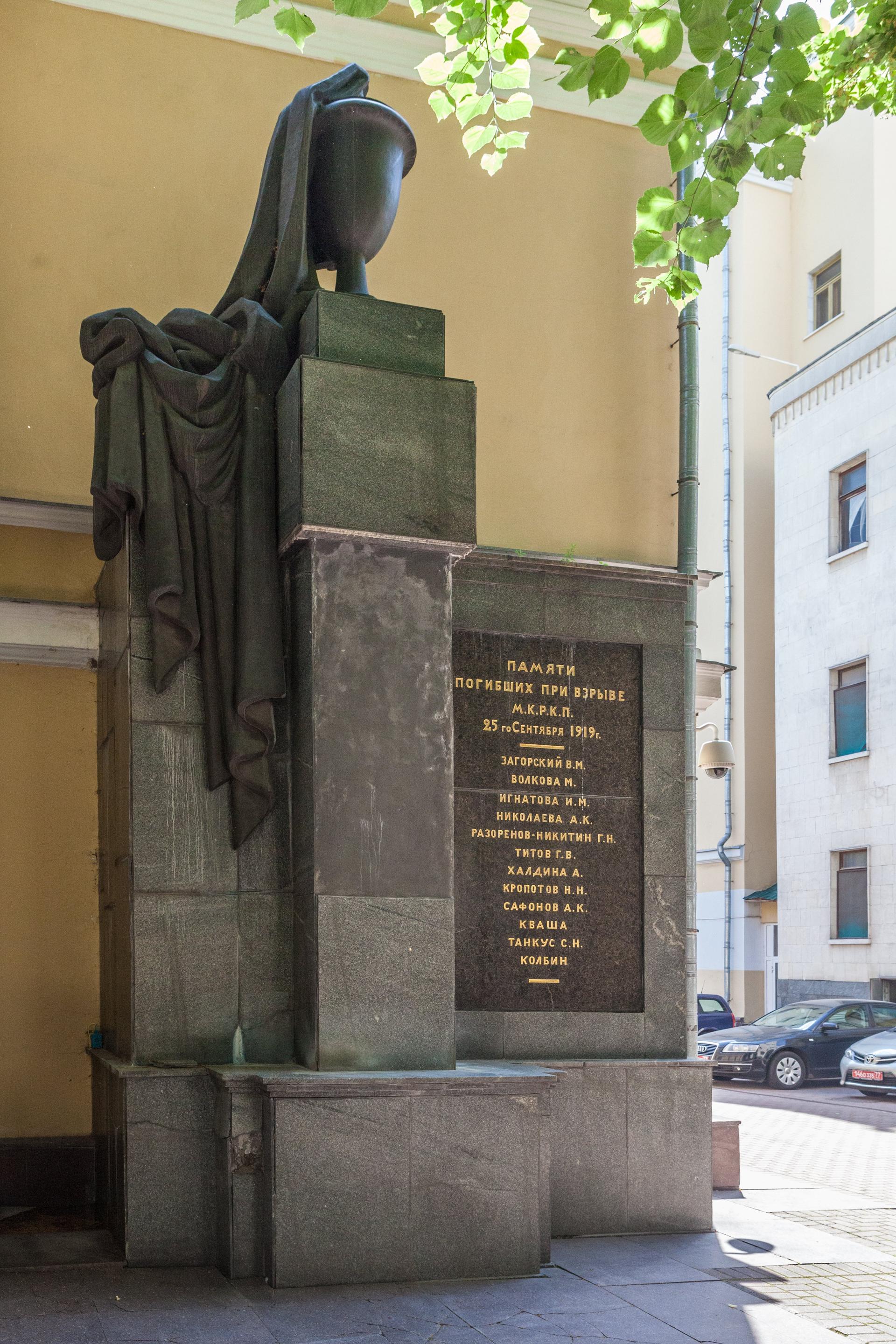 25 сентября 1919 г. в доме по Леонтьевскому переулку проходило заседание московского комитета РКП(б). Террористический акт совершила группа анархистов, в результате взрыва брошенной террористом Соболевым бомбы погибли 12 человек, еще 55 получили ранения. Памятник представляет собой урну с траурным покрывалом на высоком постаменте. В правой части постамента закреплена плита со списком погибших большевиков.