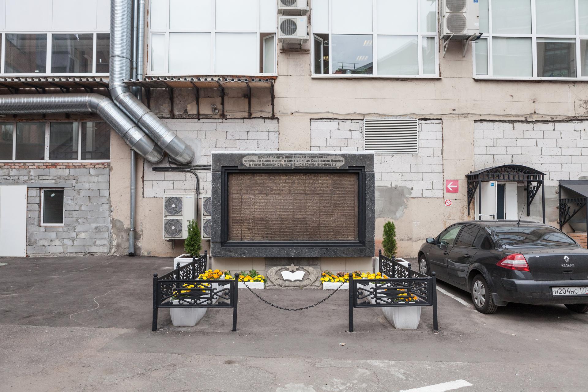 Стела из черного полированного гранита. В верхней части прорезная надпись: «Вечная память работникам типографии, отдавшим свои жизни в боях за нашу Советскую Родину в годы Великой Отечественной войны 1941-1945 гг.». Ниже расположены бронзовые таблички, на которых перечислены имена 250 погибших в годы ВОВ работников типографии. Всего на фронты Великой Отечественной войны 1941-1945 гг. отправилось около 800 работников типографии.