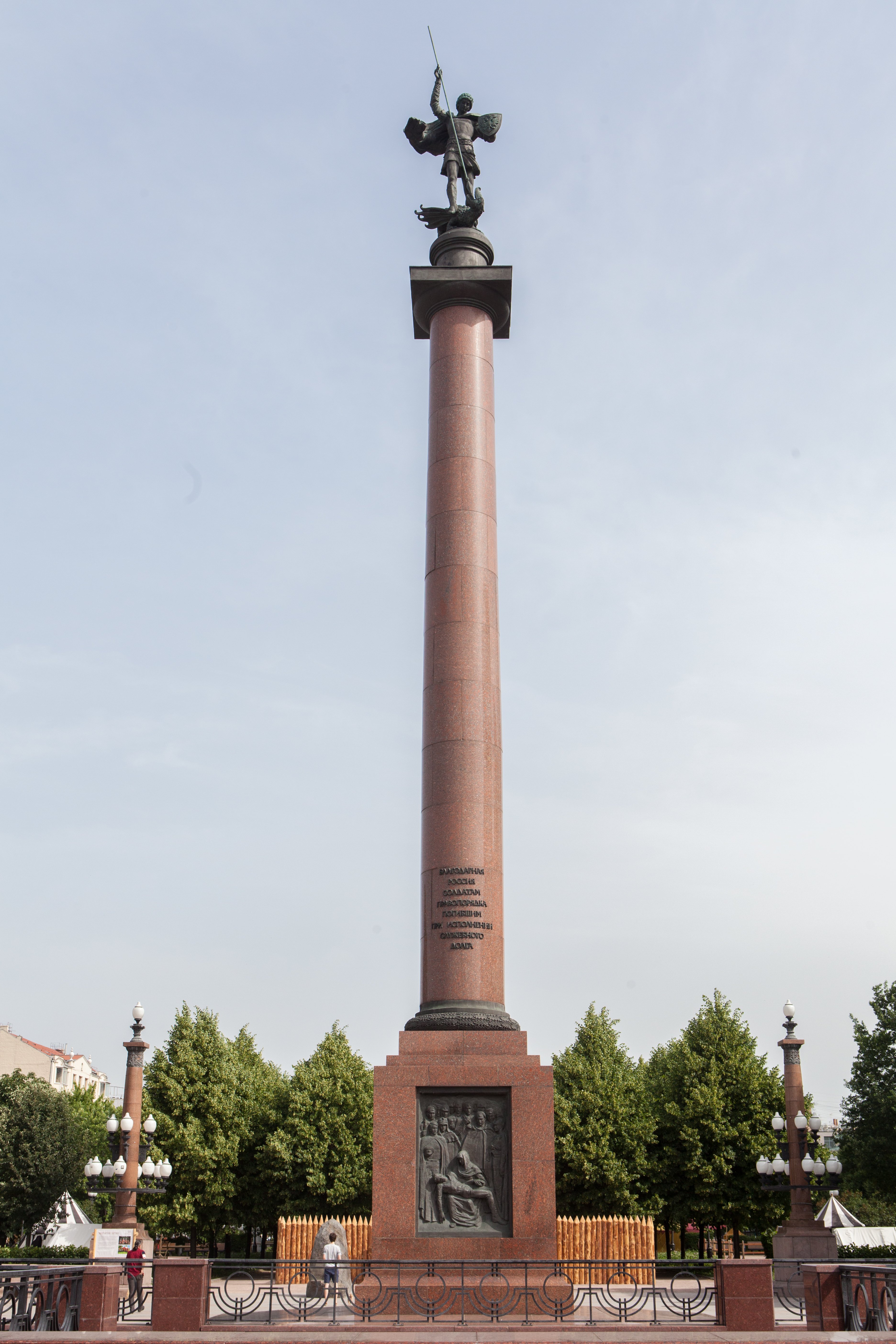 Высокую колонну из полированного гранита венчает бронзовая дорическая капитель с бронзовой скульптурой Георгия Победоносца, поражающего змея, на бронзовом же постаменте. Колонна размещена на гранитном постаменте с четырьмя бронзовыми барельефами. На центральном изображена скорбящая мать, держащая на коленях тело погибшего сына, вокруг нее воины.