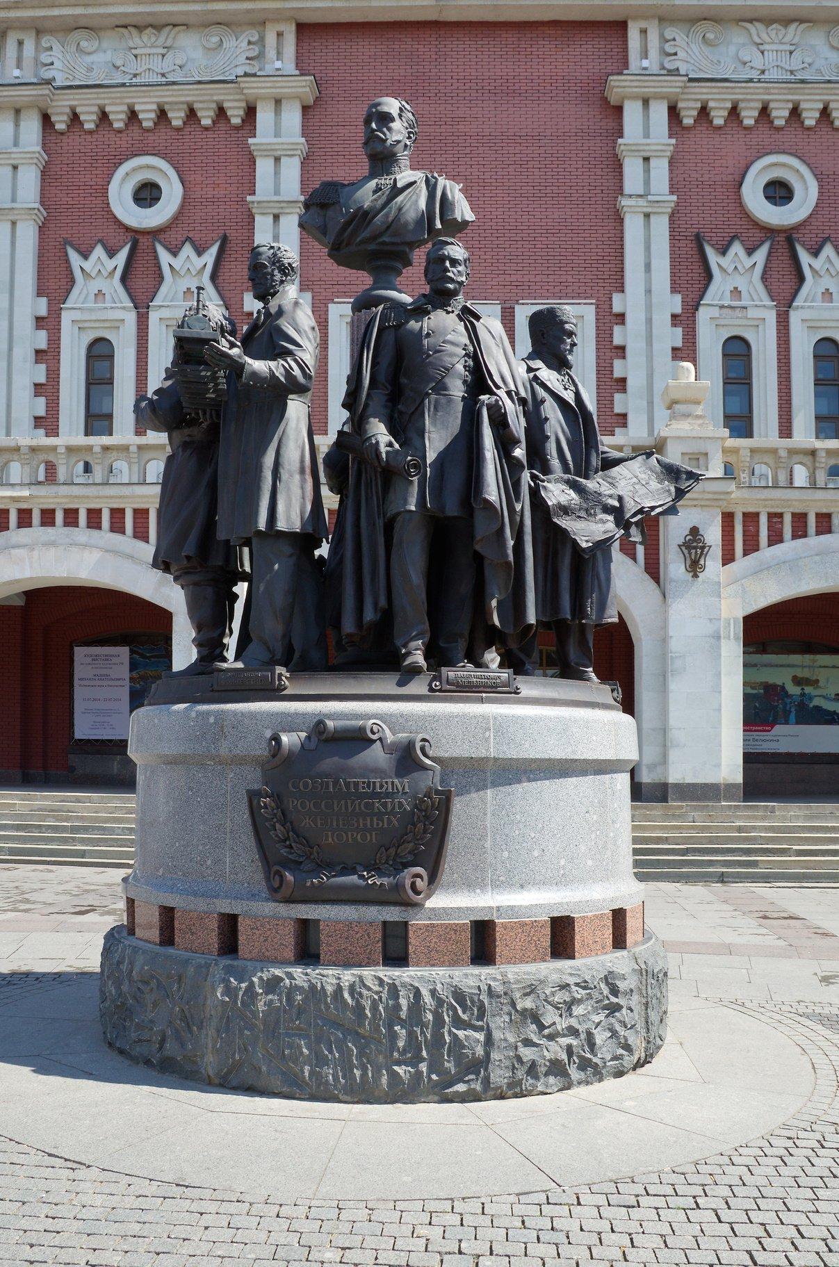 Памятник представляет собой постамент, на котором расположена скульптурная композиция. Центральное место в ней занимает бюст императора Николая I — при нем в России появились железные дороги. Окружают его фигуры выдающихся деятелей, с чьими именами связано развитие железных дорог в России: Франца Антона фон Герстнера, Павла Мельникова, Михаила Хилкова, Ефима и Мирона Черепановых, Сергея Витте.