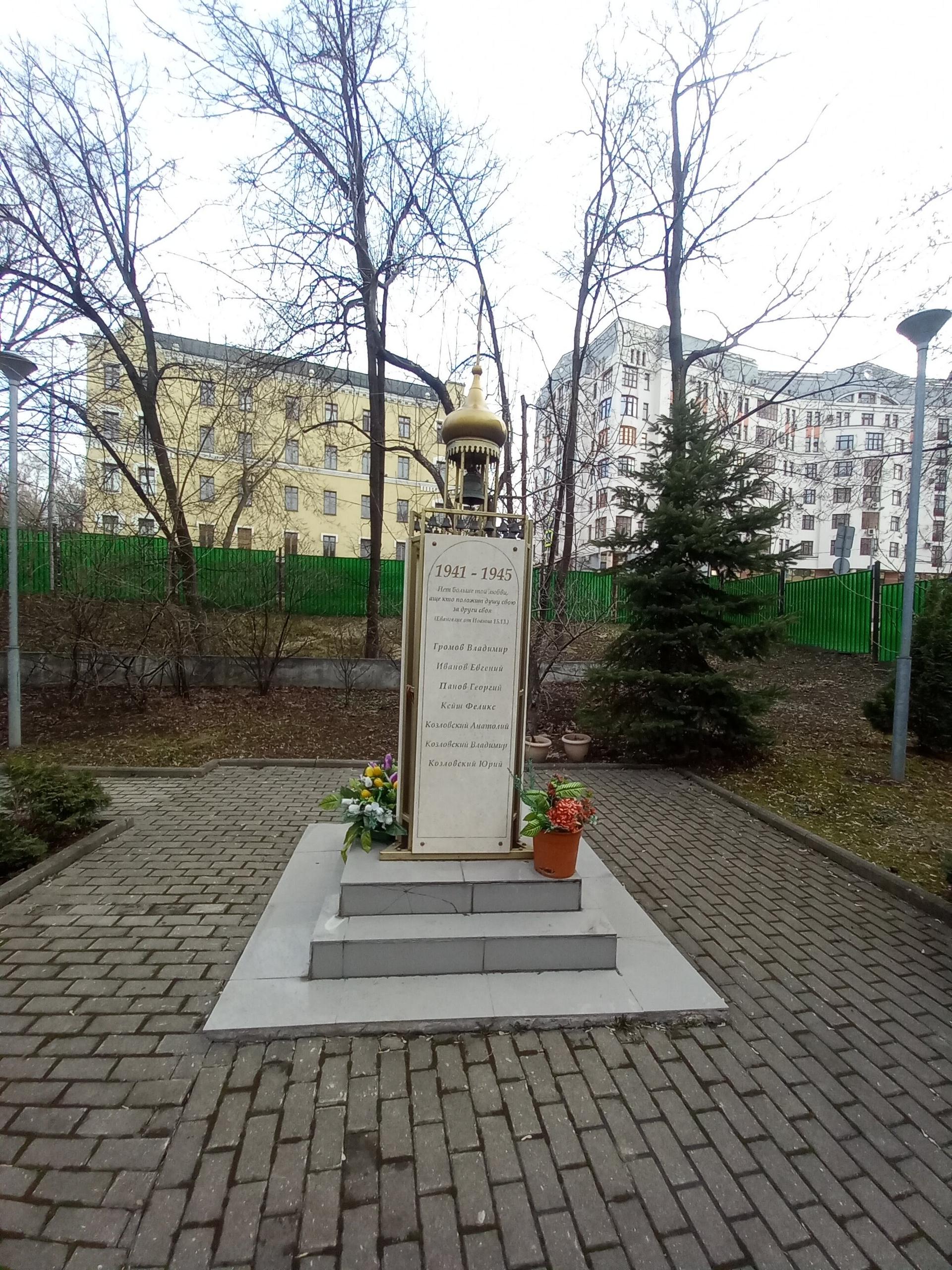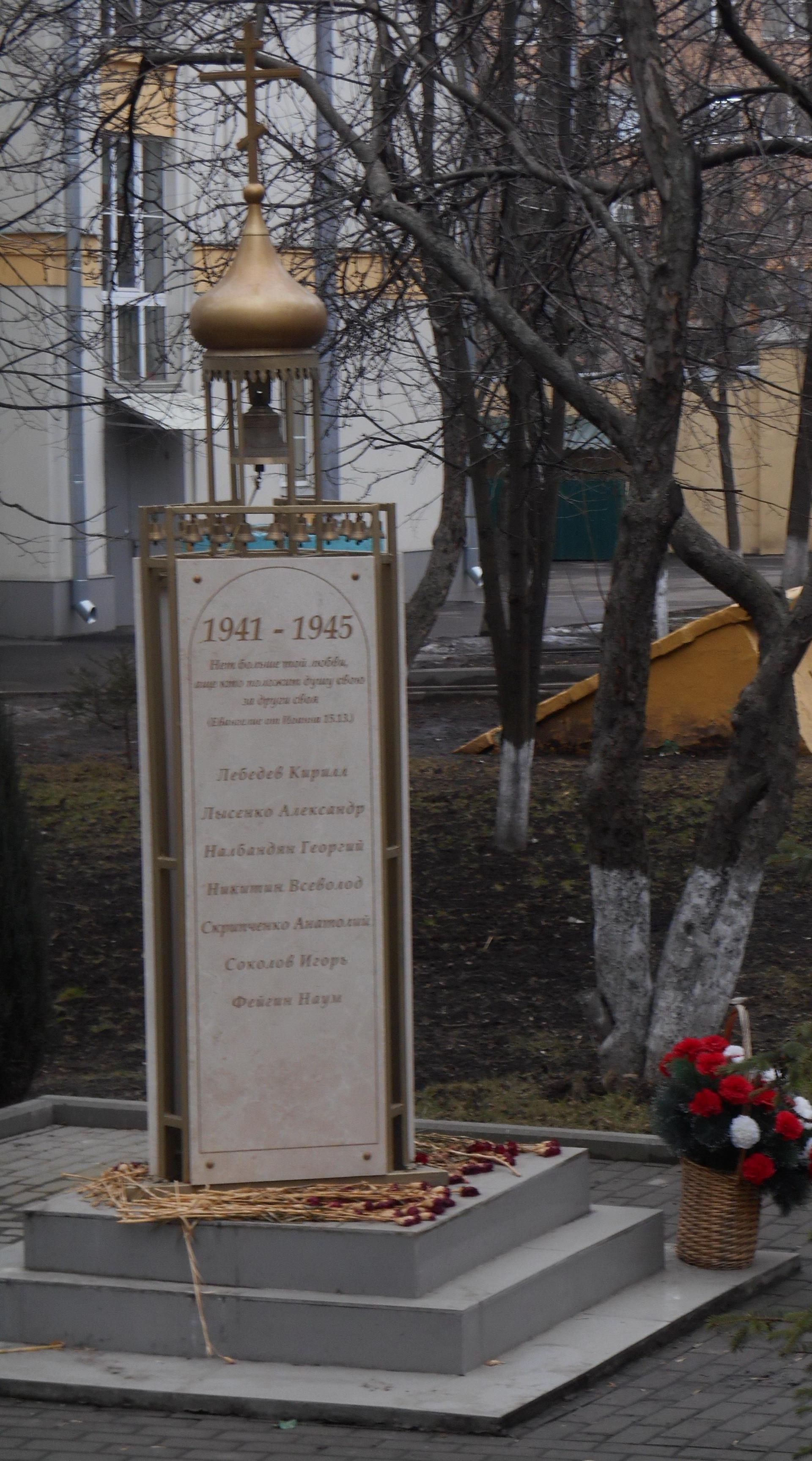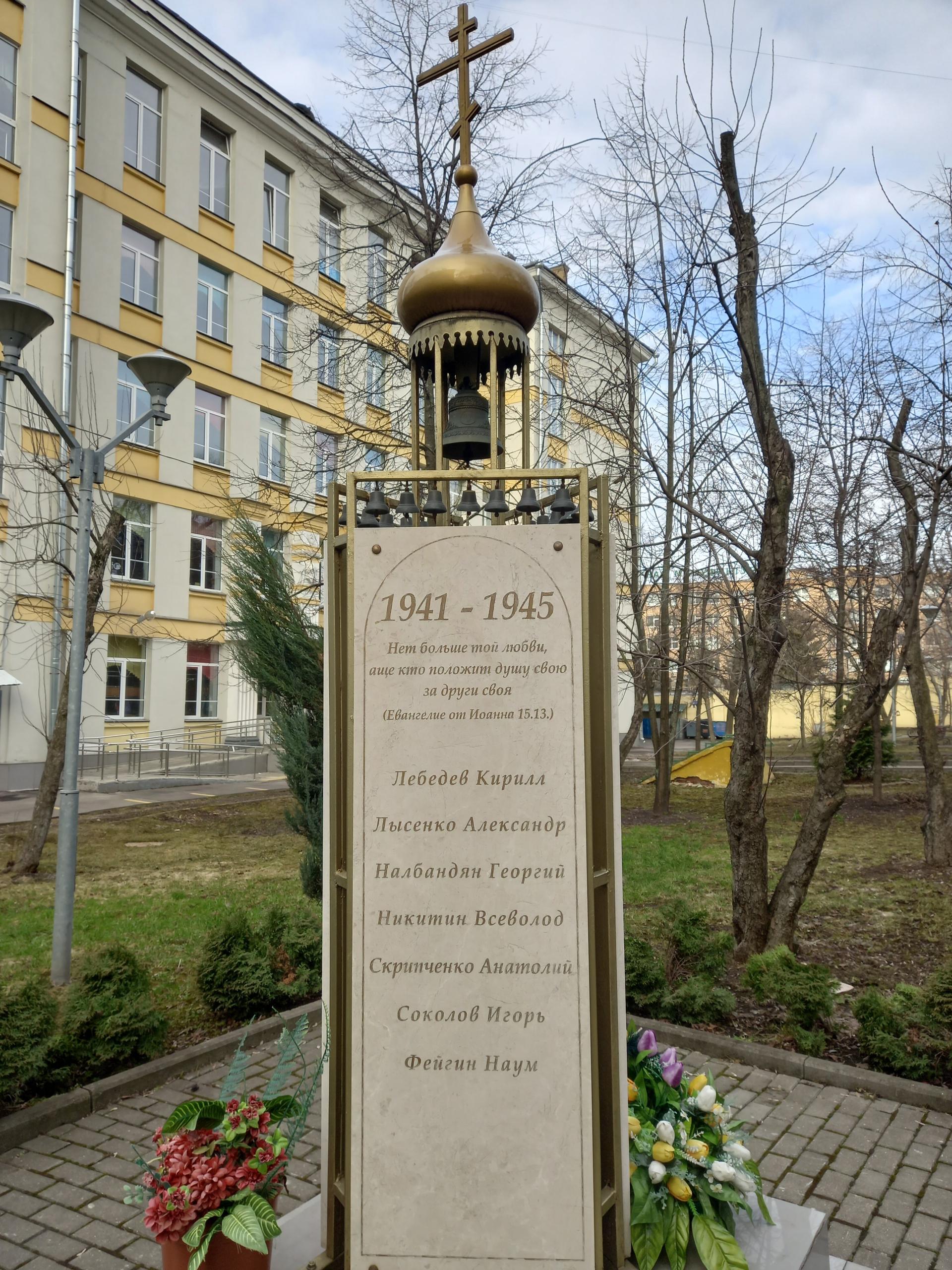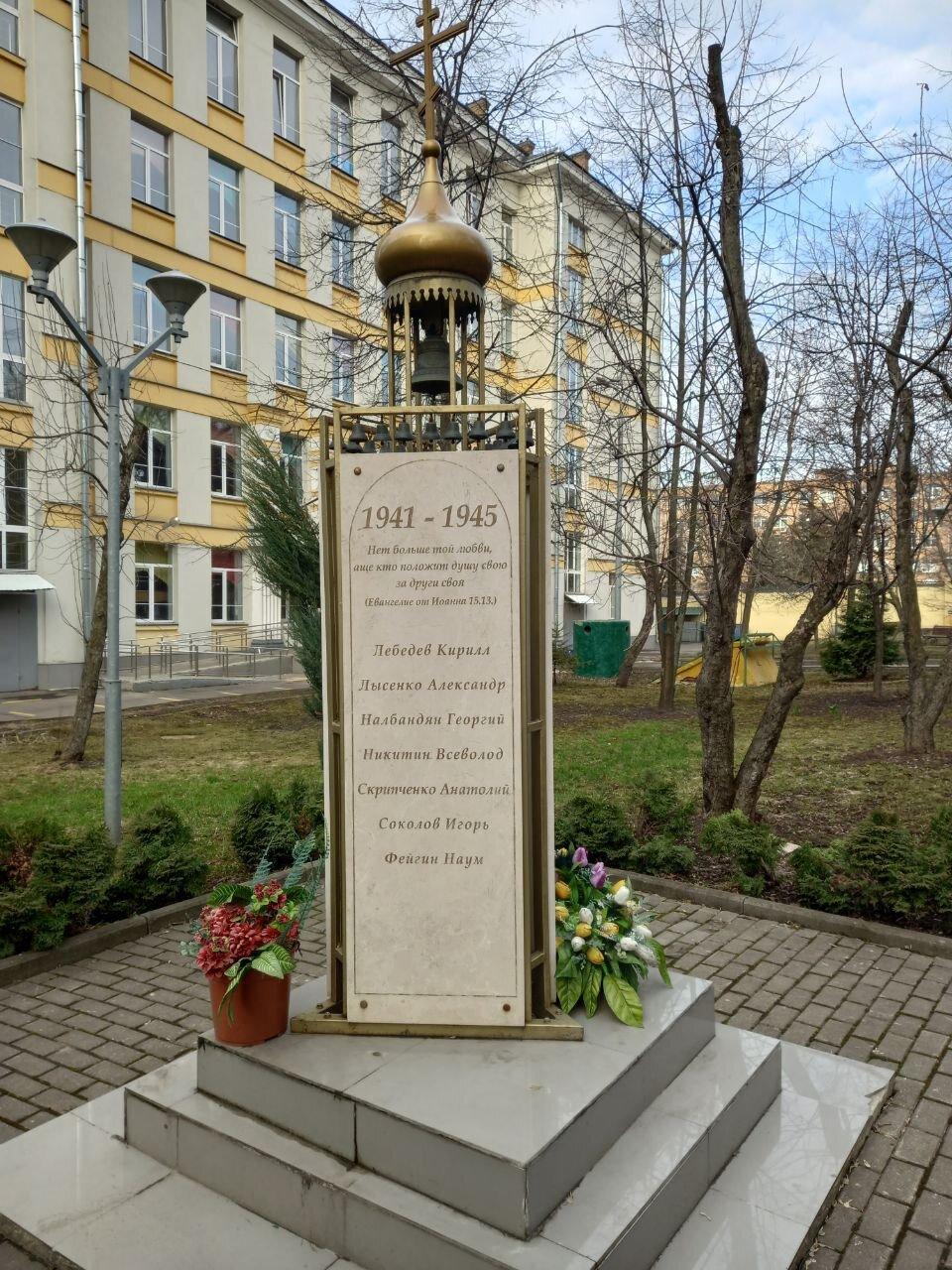 Очень необычный для школы памятник - выполнен в виде часовенки с позолоченным куполом с крестом, на плитах по периметру памятника перечислены имена и фамилии. Предполагаю, что это фамилии учеников школы, погибших во время Великой Отечественной войны в 1941-1945 гг. Под куполом висит маленький колокол, а над плитами маленькие колокольчики. Над поименным списком цитата из Евангелия от Иоанна:"Нет больше той любви еще кто положит душу свою за други своя".