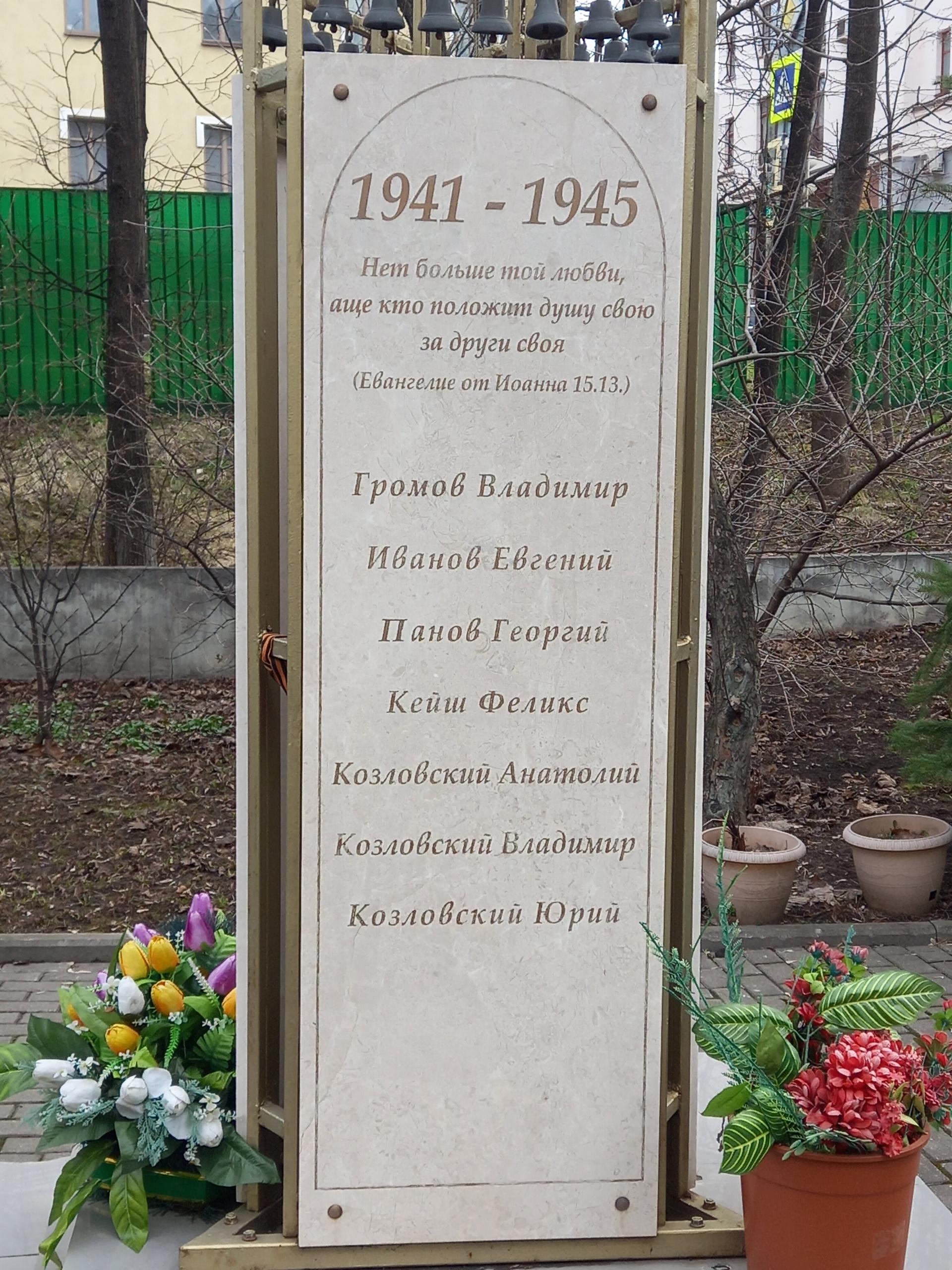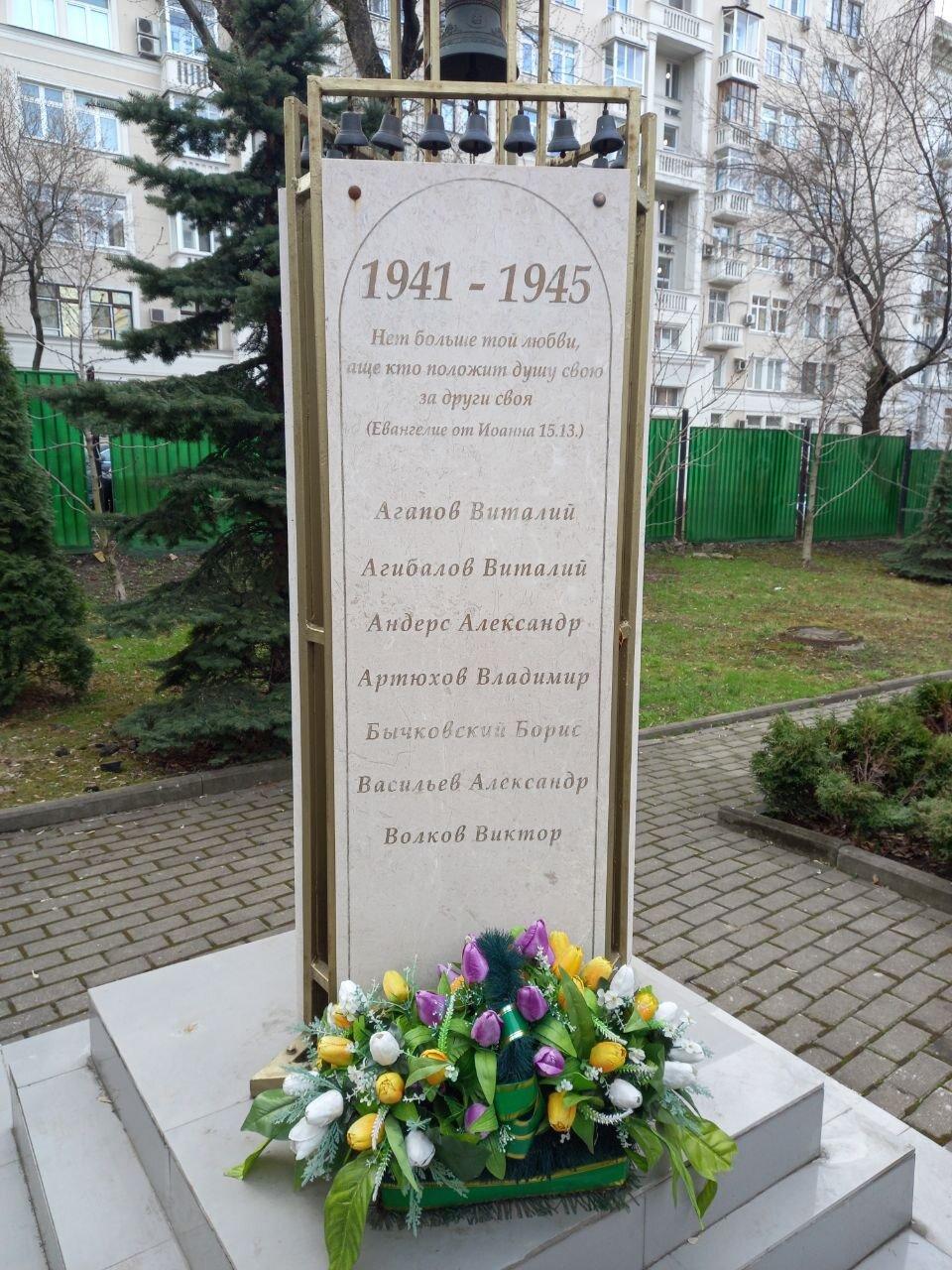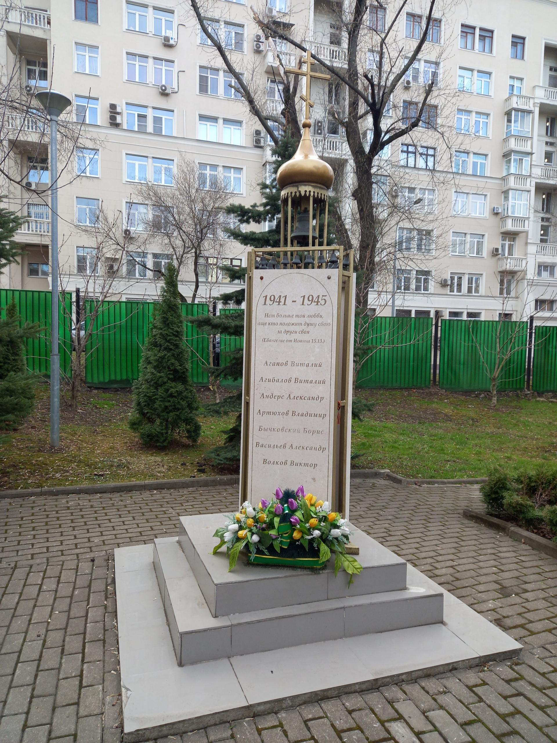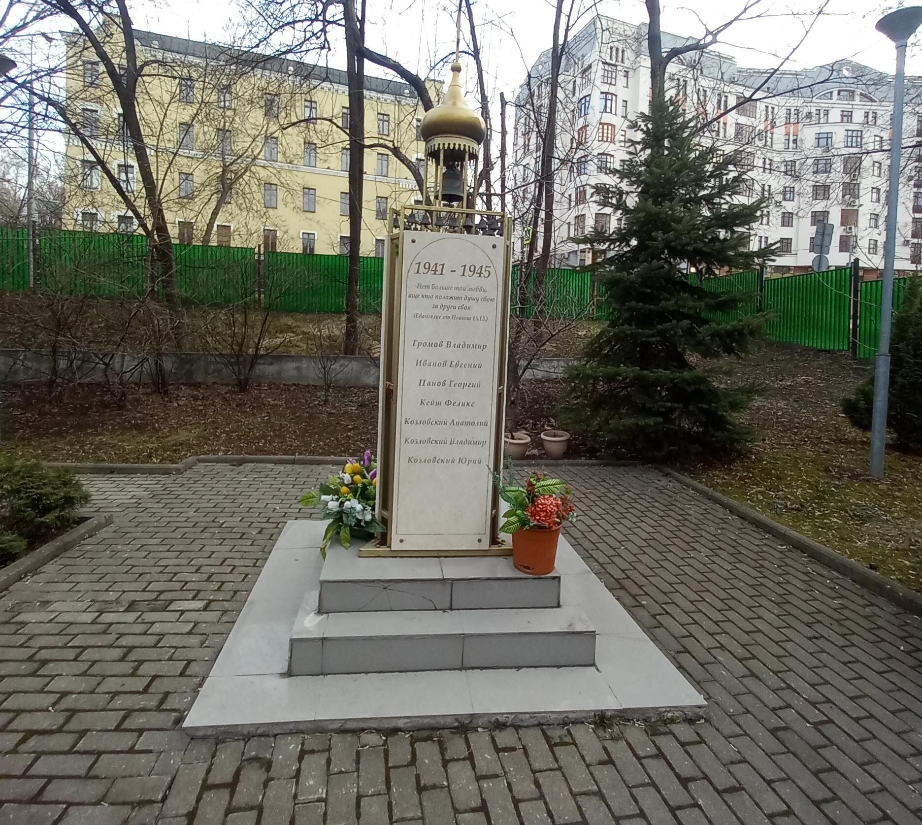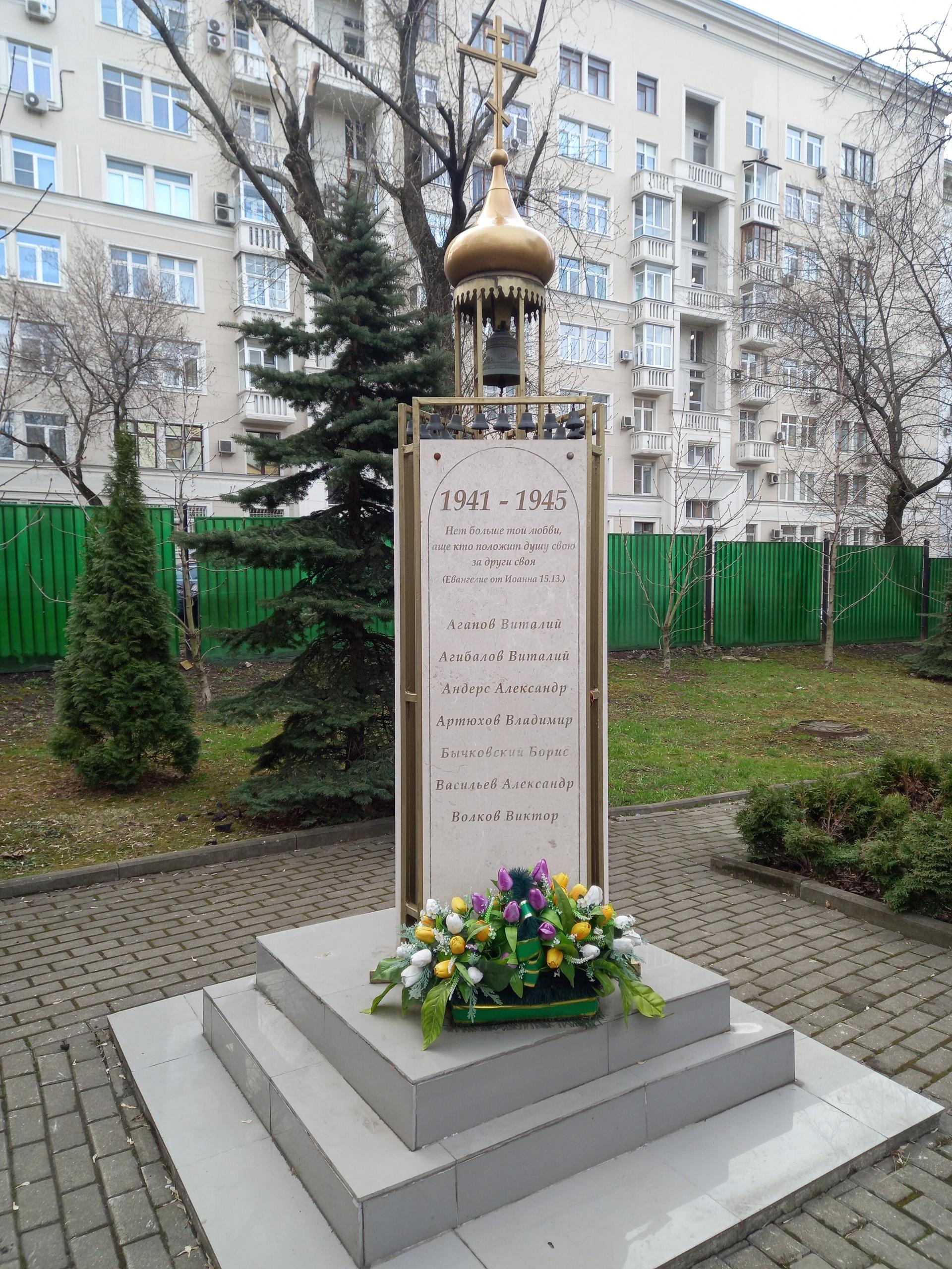 Очень необычный для школы памятник - выполнен в виде часовенки с позолоченным куполом с крестом, на плитах по периметру памятника перечислены имена и фамилии. Предполагаю, что это фамилии учеников школы, погибших во время Великой Отечественной войны в 1941-1945 гг. Под куполом висит маленький колокол, а над плитами маленькие колокольчики. Над поименным списком цитата из Евангелия от Иоанна:"Нет больше той любви еще кто положит душу свою за други своя".