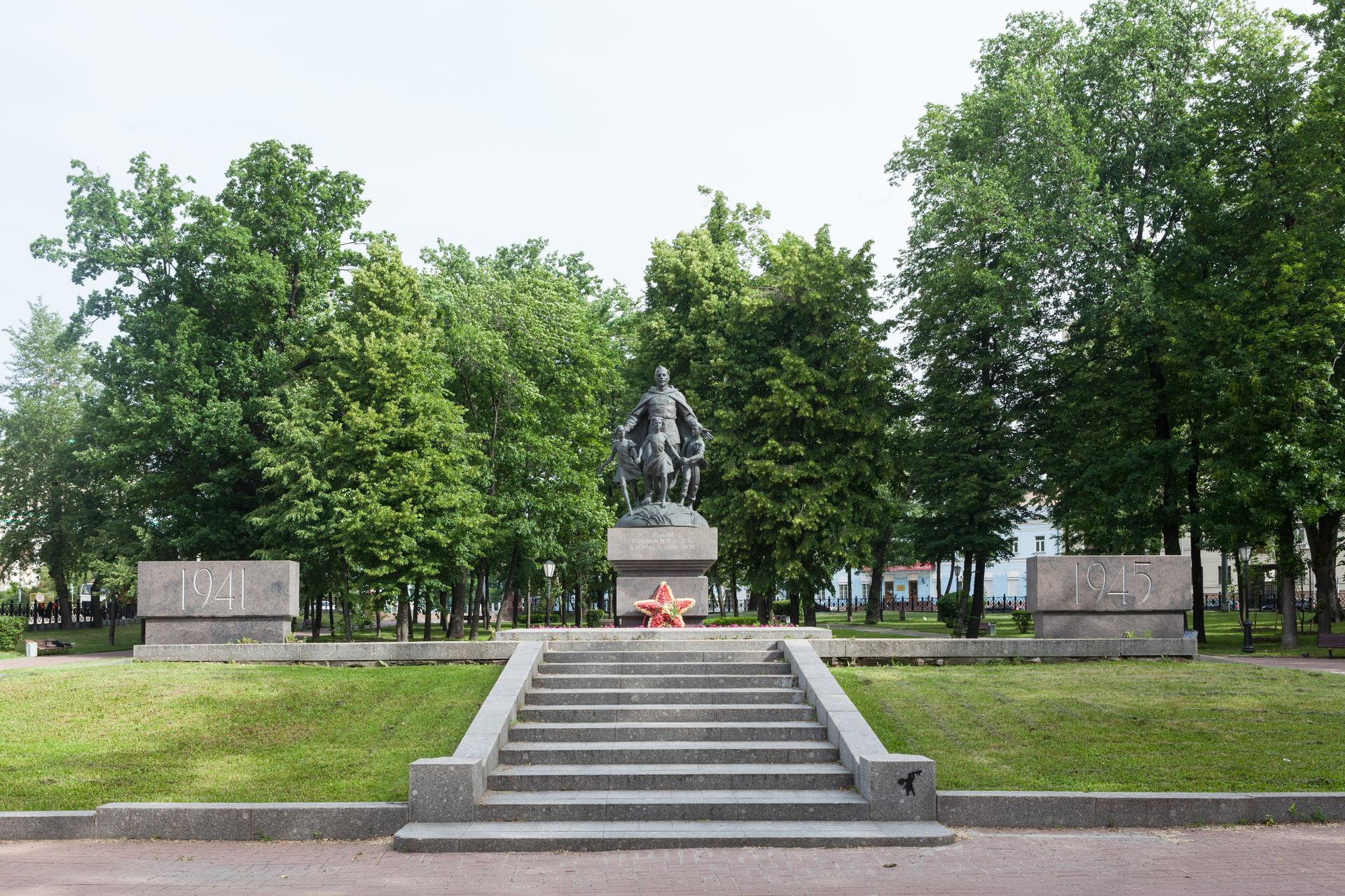 Бронзовые фигуры установлены на квадратном гранитном постаменте и бронзовом плинте в виде полусферы. Стоящий по центру солдат свободно разводит руки в стороны, как бы защищая и направляя вперед троих детей, шагающих перед ним. Посвятительная надпись на постаменте: «Воинам, отстоявшим мир и свободу в борьбе с фашизмом». На границах площадки памятника по обе стороны стоят две стелы с датами ВОВ: 1941 и 1945. Постамент памятника окружает большая квадратная цветочная клумба.