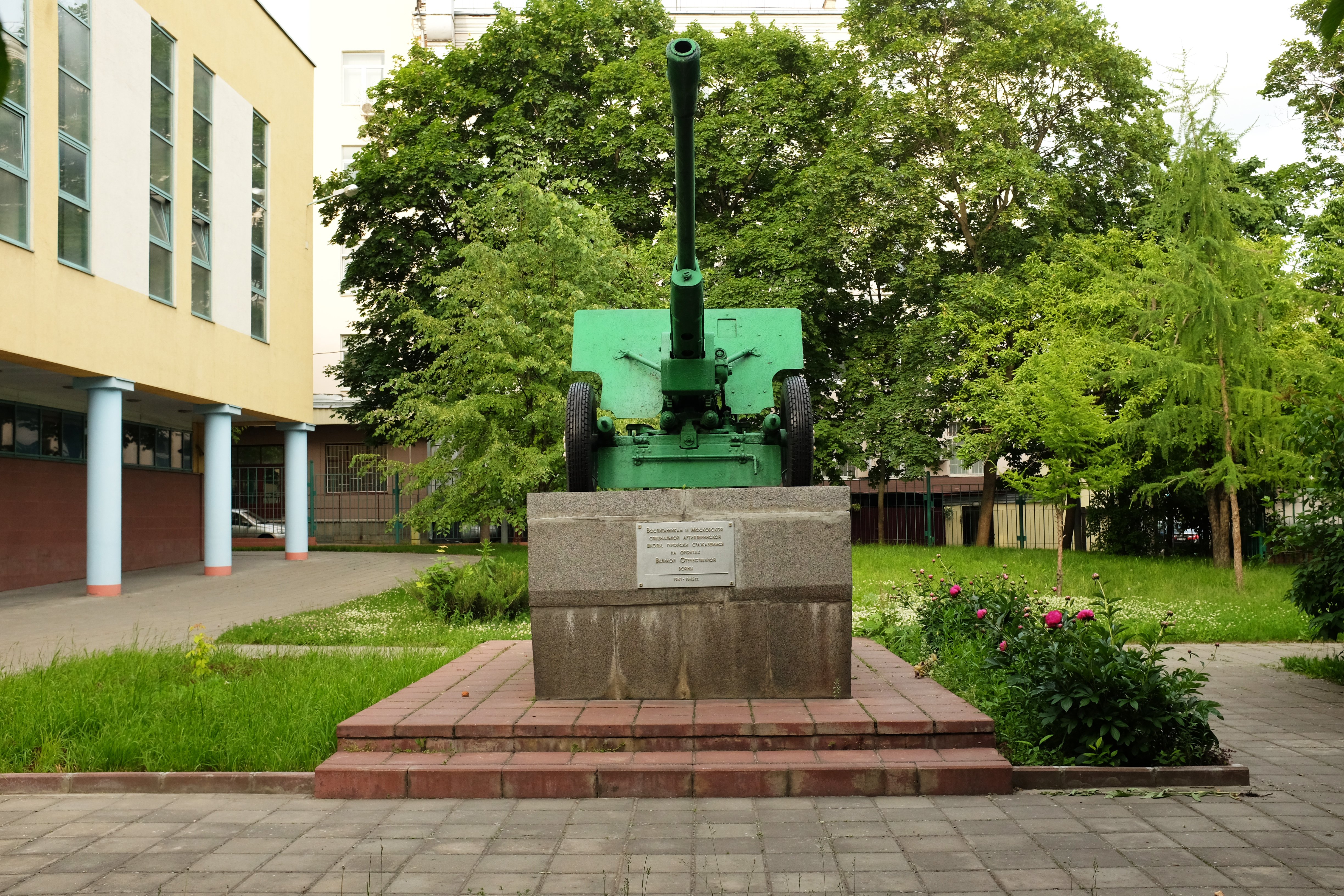 Специальные боевые школы были сформированы еще в 1937 г. Выпускники этих школ в военные годы шли на укомплектование артиллерийских училищ. Памятник представляет собой дивизионную пушку ЗИС-3 на гранитном постаменте и основании из искусственного камня. На западной стороне постамента установлена мраморная табличка с надписью: «Воспитанникам 1-й Московской специальной артиллерийской школы, геройски сражавшимся на фронтах Великой Отечественной войны 1941-1945 гг.».