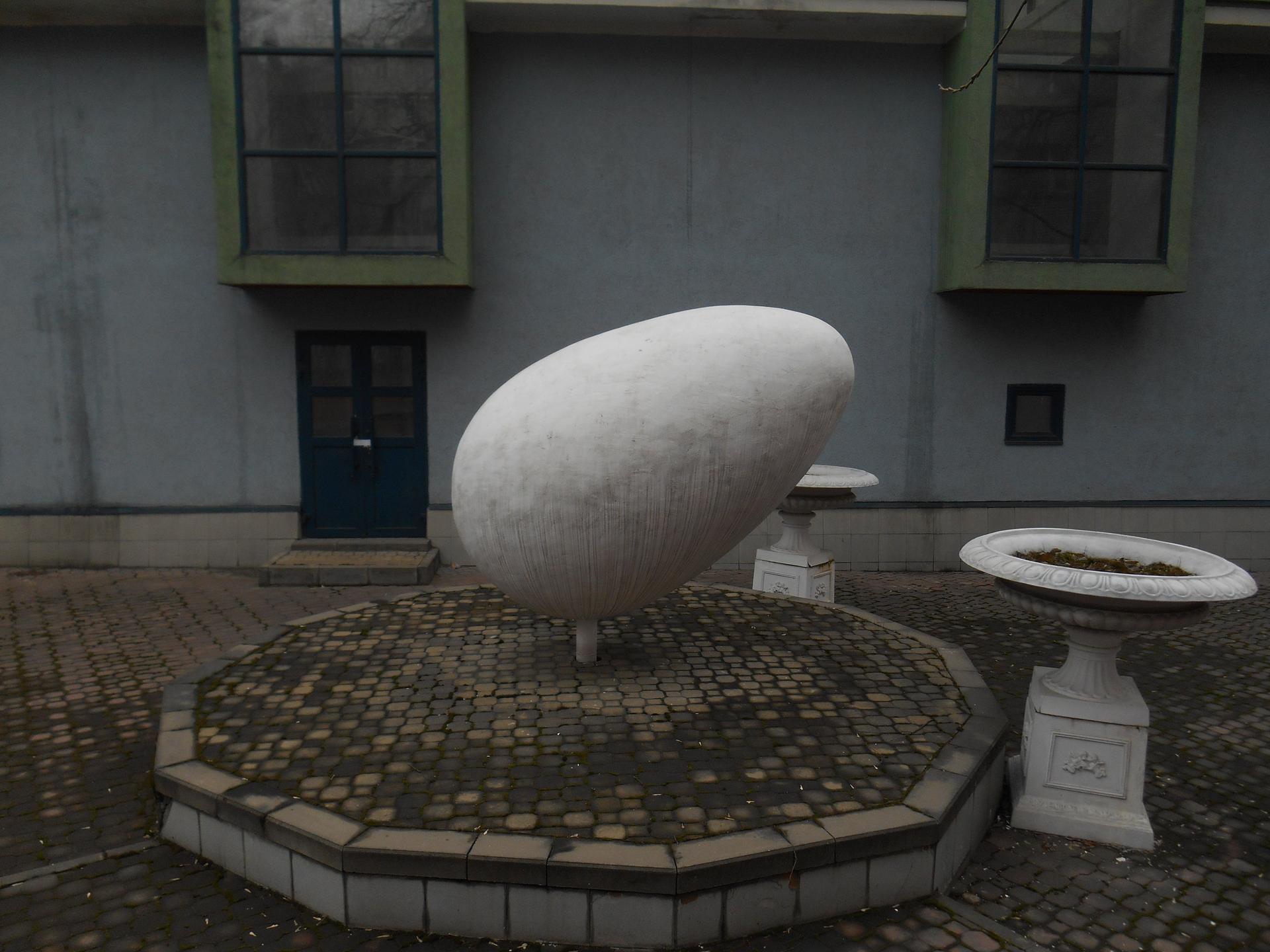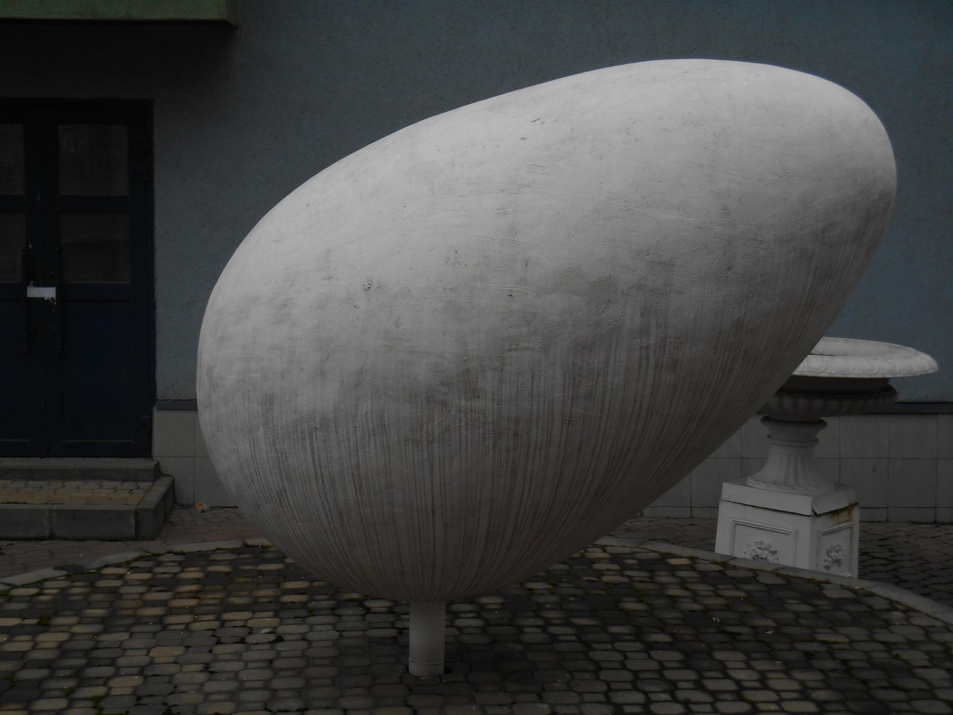 Нетрадиционный подход к установлению памятника на территории учебного заведения. Огромное белое яйцо неизвестного происхождения стоит под наклоном на маленькой подпорке и видимо несет в себе какой-то смысл. Думаю, что можно объяснить этот символ так: никогда не узнаешь, что вылупится из яйца - птица, змея или крокодил, пока не придет его время, но всегда понятно, что кто-то живой там есть. Может и студенты приходят в лицей еще не оперившимися и до конца не определившимися, там "дозревают" и "вылупляются" специалистами?